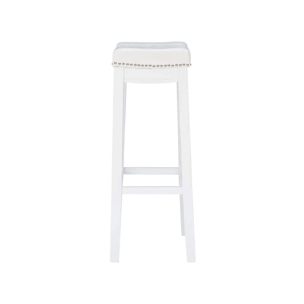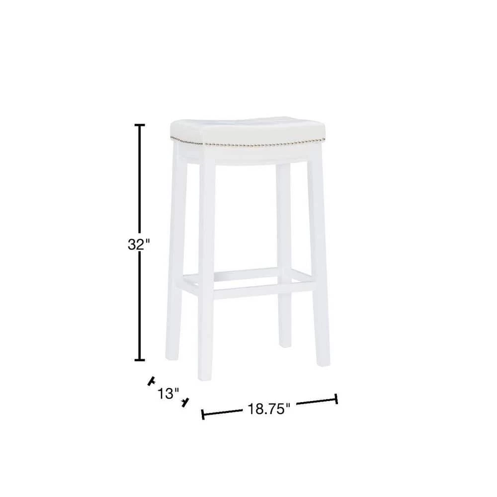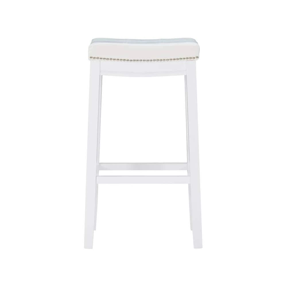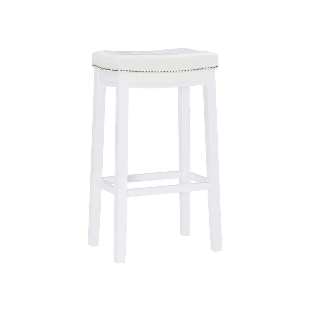 This best selling Claridge White 32 in. Backless Bar Stool helps to make any kitchen or parlor room welcoming to guests and family, no matter the occasion. A comfortable padded seat is upholstered with faux leather and fastened with double needle stitching for added durability. Shiny silver nail head trim lines the cushion, while white paint covers the solid wood frame to provide a regal aesthetic. The seat height of 32 in. is perfect for counter heights measuring 40 in.H to 43 in.H.