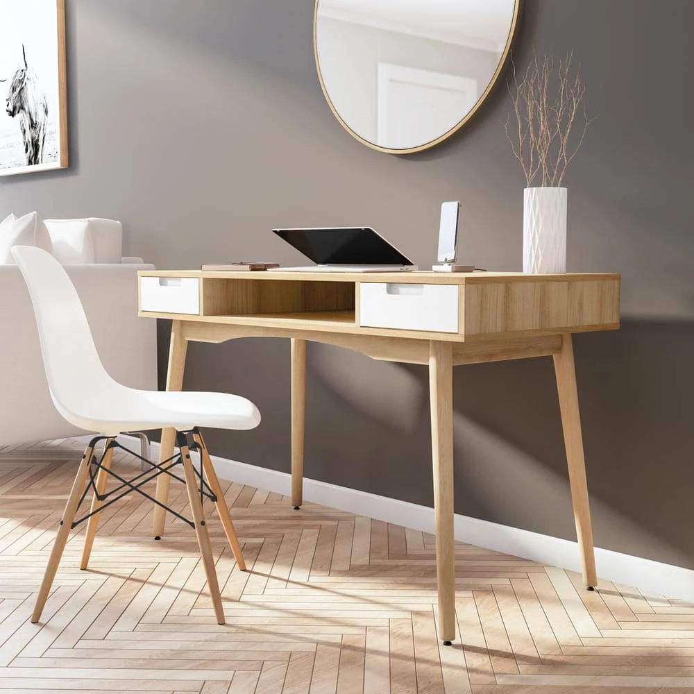 Add contemporary style and work space to your home with the Marshall Desk. Two drawers and an open shelf space provide ample storage space for your work essentials. Bright white accents the drawer fronts of the ash veneer framed piece. Round wood legs keep the piece sturdy.