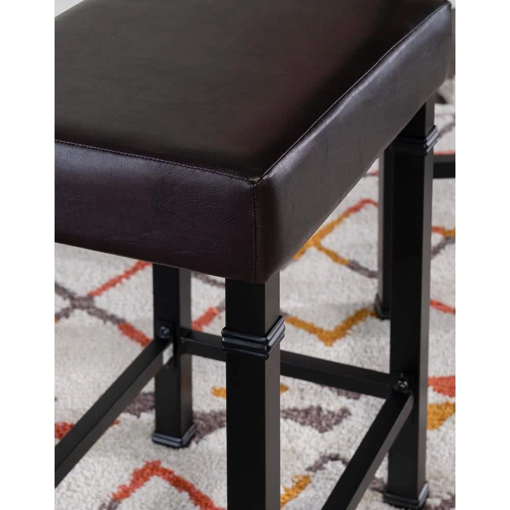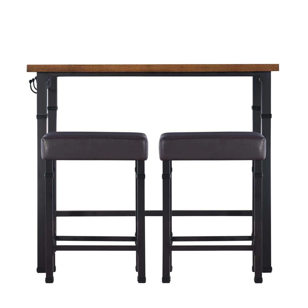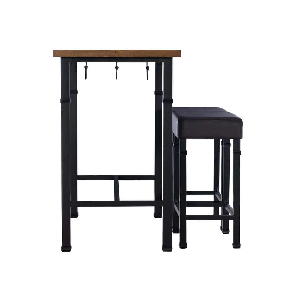Rustic and industrial in style and design, the Austin 3-Piece Pub Set is perfect for small dining rooms and kitchen breakfast nooks. Crafted from metal, the base of the table features a black finish and decorative metal trim accents. 2 Brown PU upholstered stools, easily tuck beneath the table when not in use. The wood planked top has a rich brown finish. 3-Hooks are perfect for hanging linens and towels. Stool weight limit is 275 lbs.