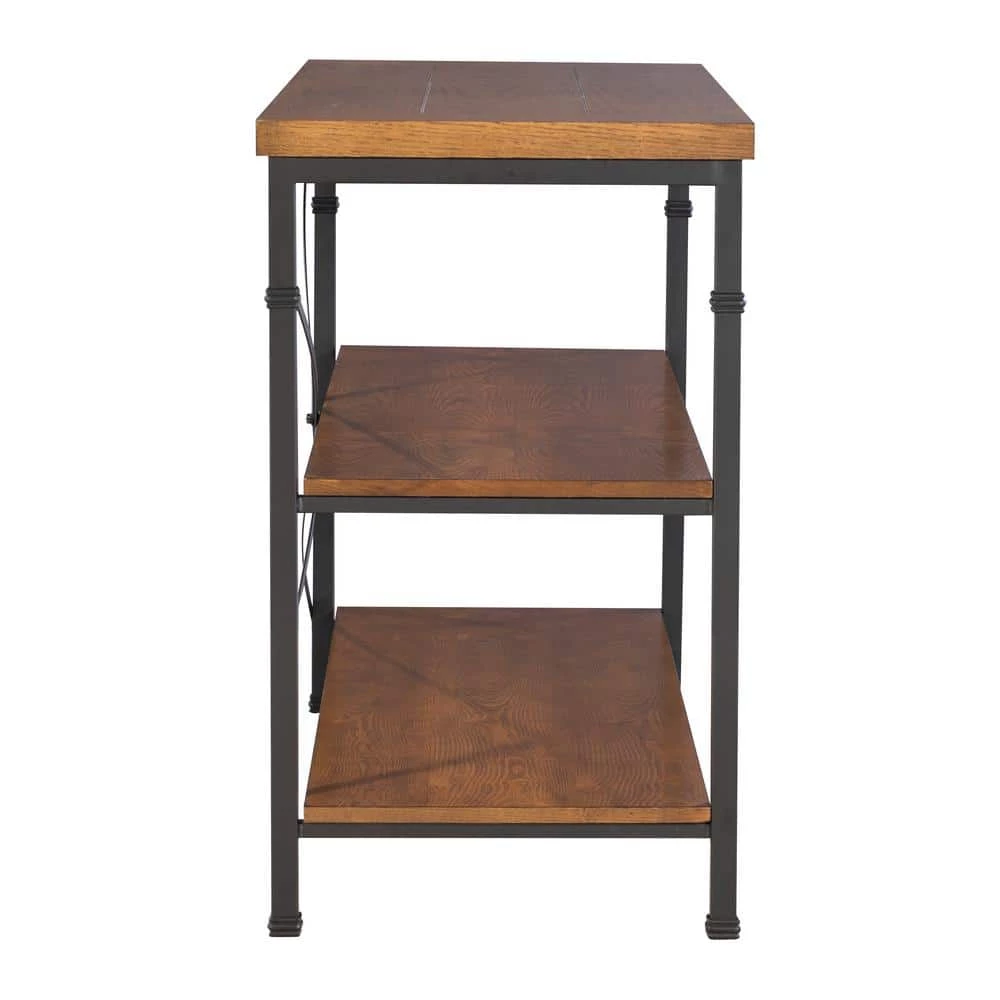 - Rustic industrial design with black metal and ash veneer finished in a warm walnut stain