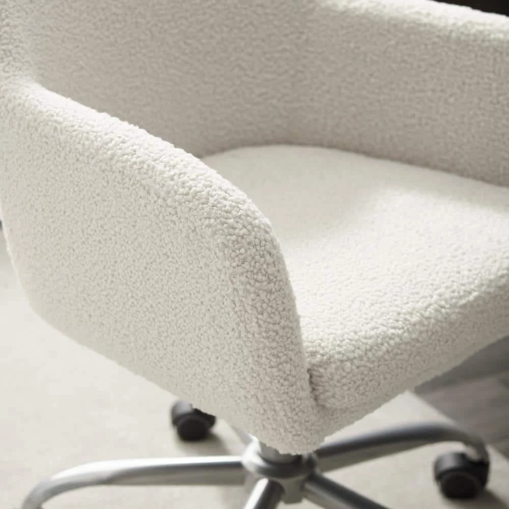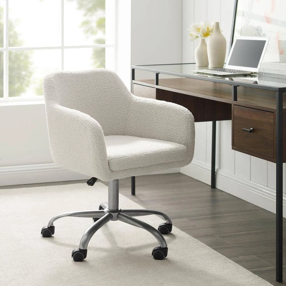 Add contemporary style to your workspace with the Barnes Sherpa Office Chair. Comfy sherpa material adorns the wide back, high arms, and thick cushioned seat. The adjustable seat allows the chair to work with a variety of desks and work tables, while the silver base and black wheels provide for smooth movement throughout your work area. The natural sherpa fabric brings a warm and inviting aura to any room.