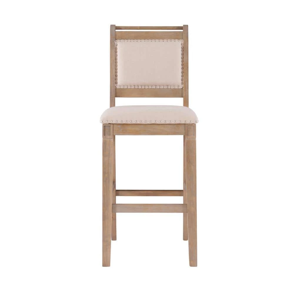 French style and farmhouse design combine to create this Brahm Natural Barstool. The washed finished wood is perfectly accented by the solid natural fabric and brushed silver nail heads. Footrails provide stability and durability. Bar Height.
