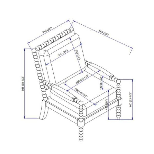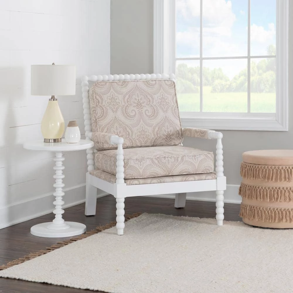 The Bridgette Spindal Chair has an eye-catching design and traditional style. The beige wood frame is delicately accented by the plush beige fabric upholstered seat and back. A sophisticated seating addition to a bedroom or living space, this neutral piece will blend seamlessly into any home.