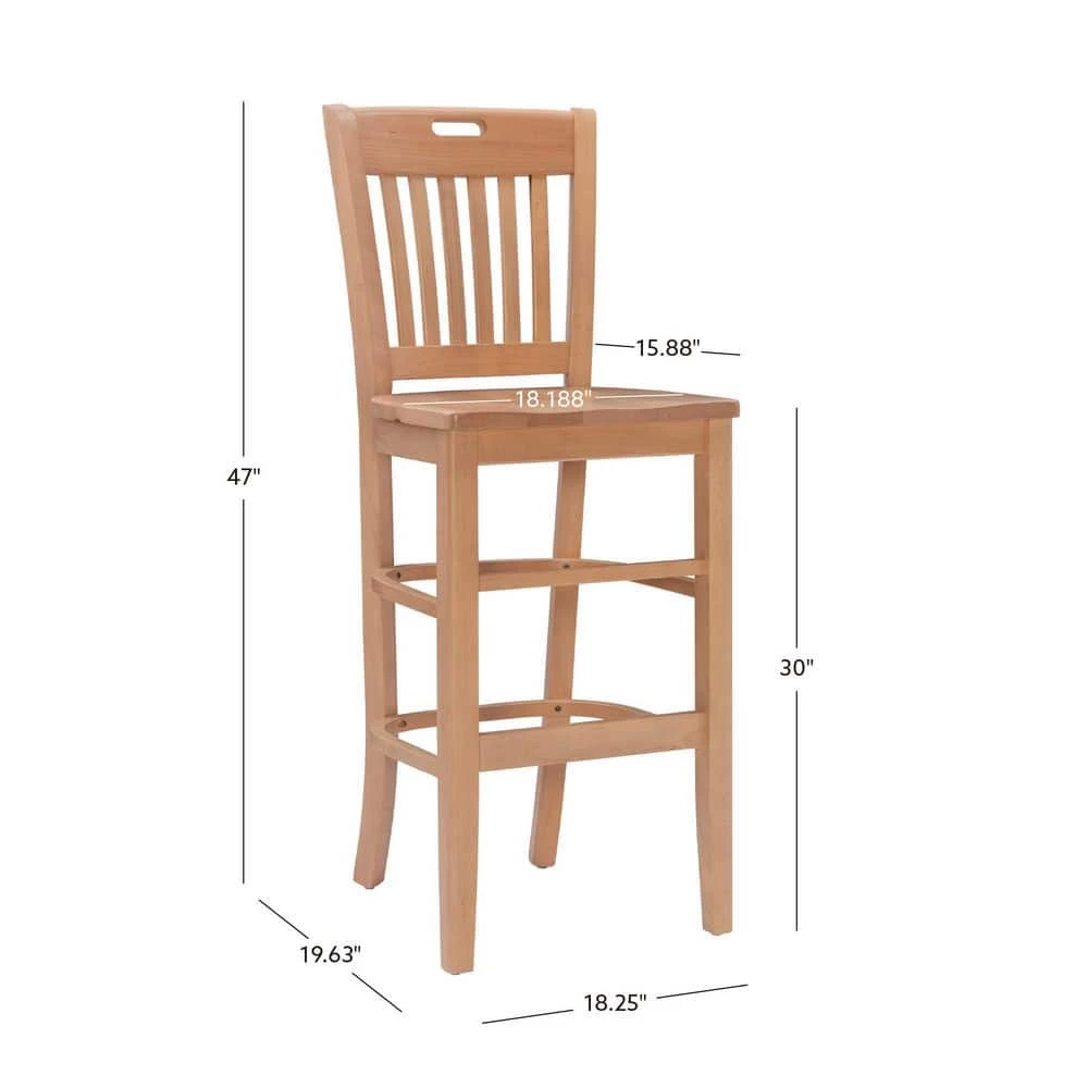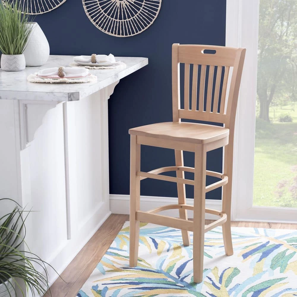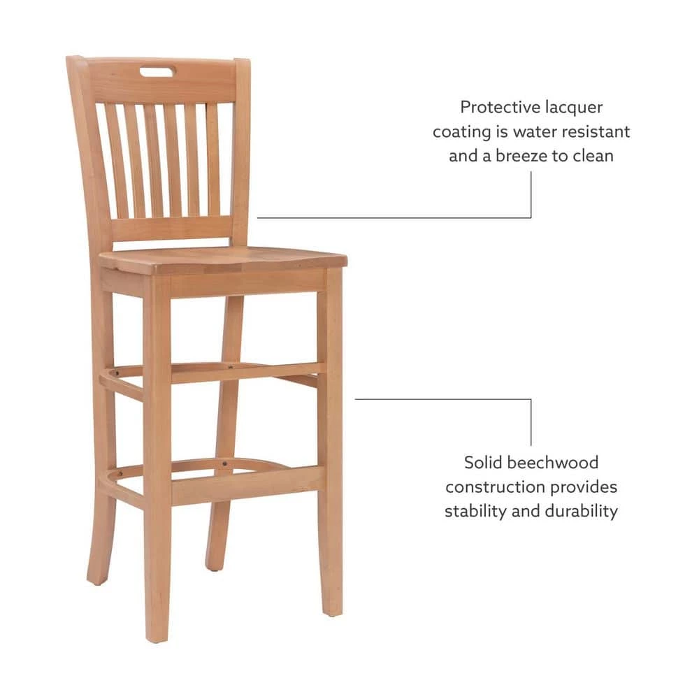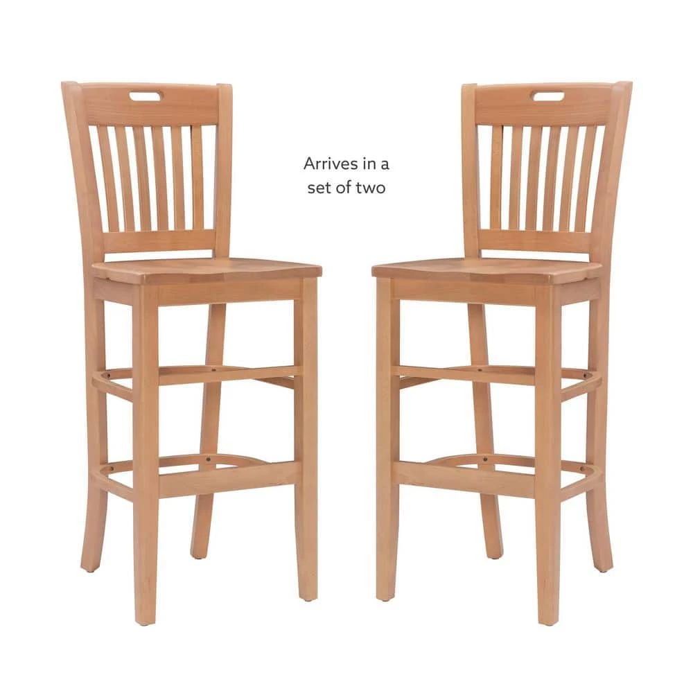 Sturdy and reliable, this Brouthers Natural Barstool with wood Seat (2 pk) will provide your home with rustic charm for years to come. The natural finish over the robust beechwood frame highlights knots and patterns in the woodgrain, lending to a modern farmhouse aesthetic. Adding to this classic look is a broad saddle seat and slatted backrest with a small cutout for ease of transport. A separate brass kickback is included, giving you the option to attach it to the footrest for extra protection and flair. This American made set of 2 arrives fully assembled and supports up to 300 lbs each seat. Commercial Grade