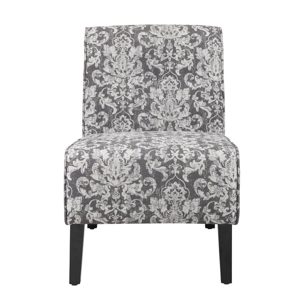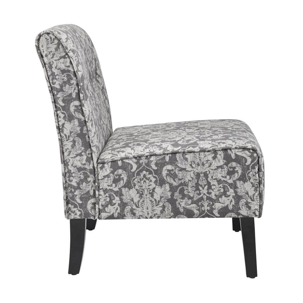 Classic design meets modern appeal in this superbly comfortable Bruno Grey Damask Polyester Accent / Slipper Chair with Black Wood Legs. Substantial, durable padding and a sturdy hardwood frame makes for long lasting utilization. The mix of fabric, button tufting and clean lines adds an air of sophistication and elegance to virtually any home decor. A functional and artistic addition to your living room, bedroom, or den. The dark black finish frame is complimented by the stunning gray damask fabric.
