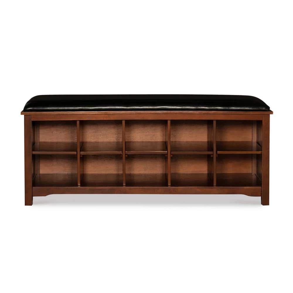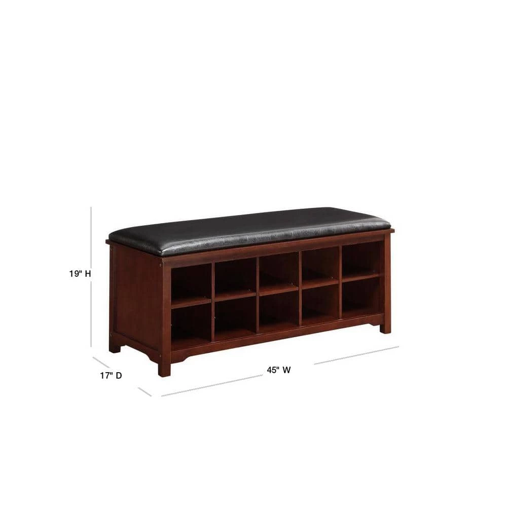 The Cape Anne Storage Bench is perfect for adding storage and seating to an entry or hallway. Ten bottom storage cubes are perfect for storing and organizing shoes and other small items. Finished in a dark walnut, the top is plushly upholstered in a dark brown PU fabric. The simple, clean lined design will easily complement a variety of decor styles.