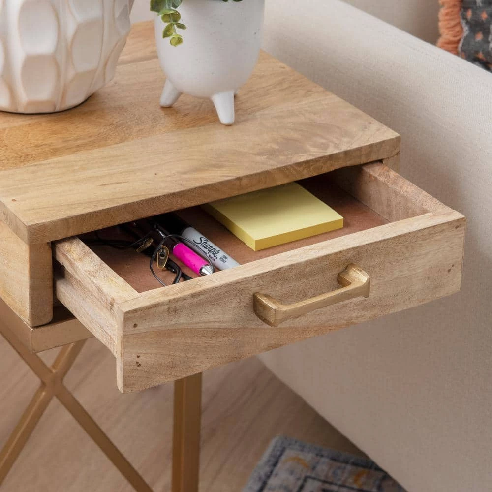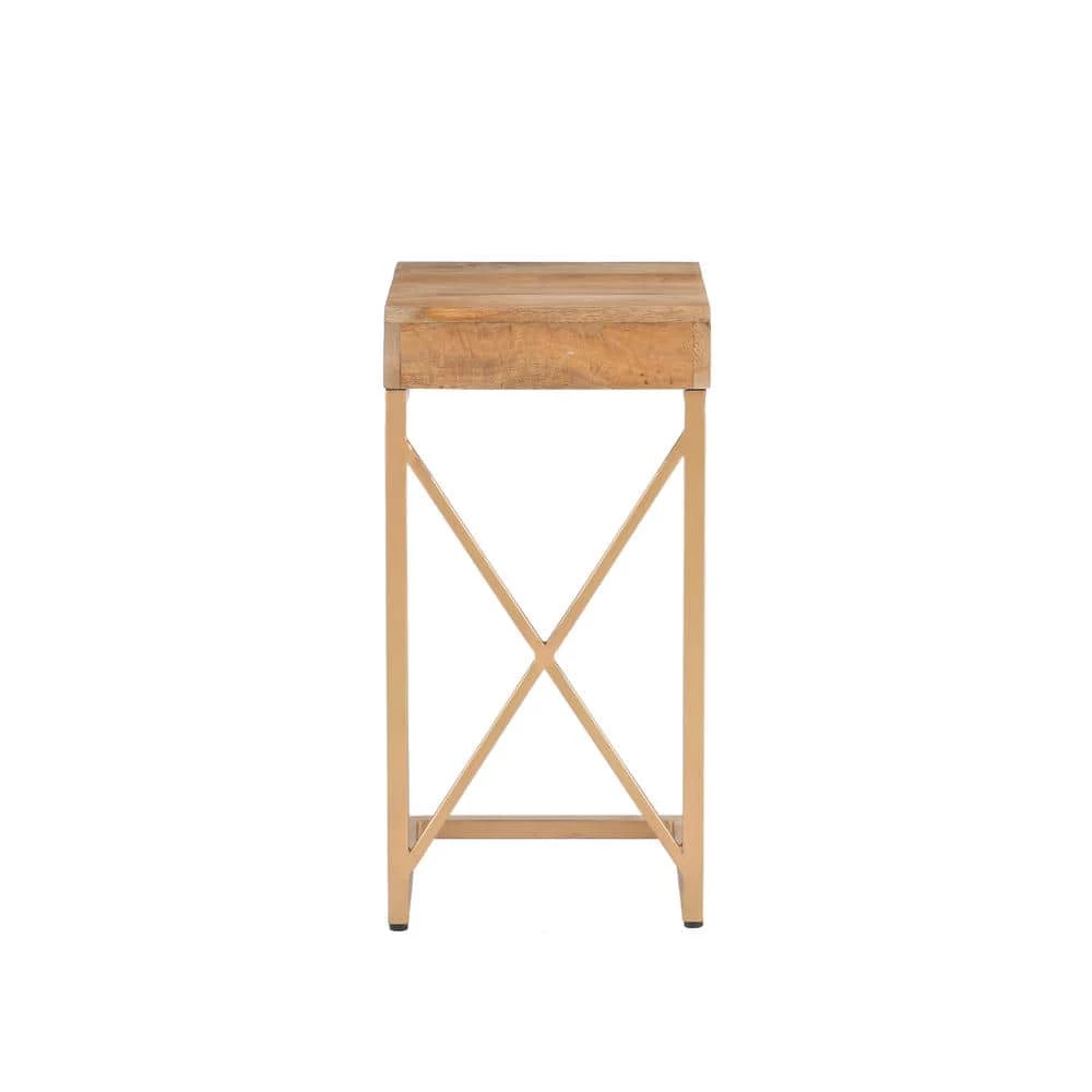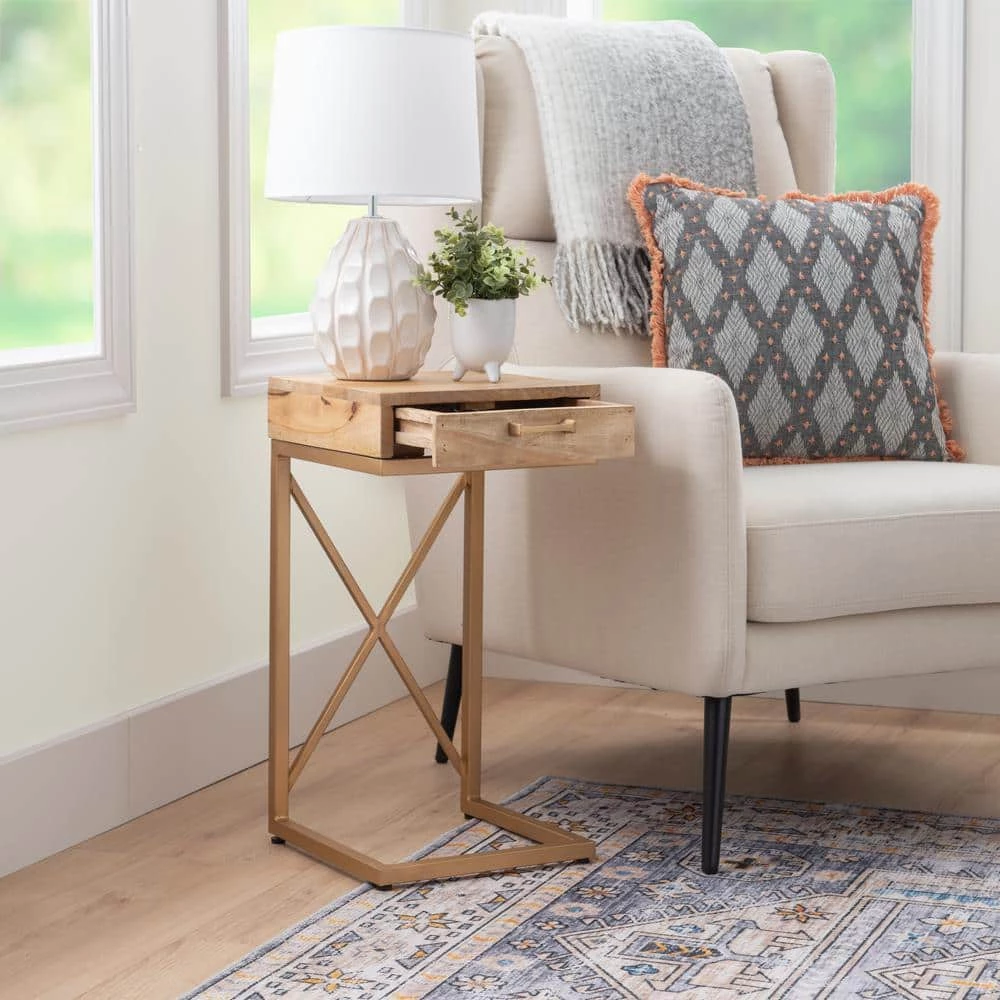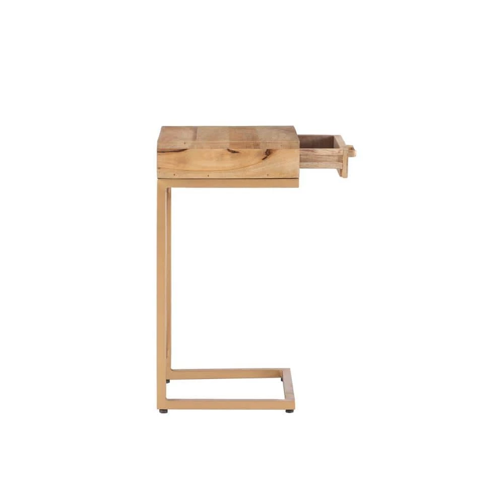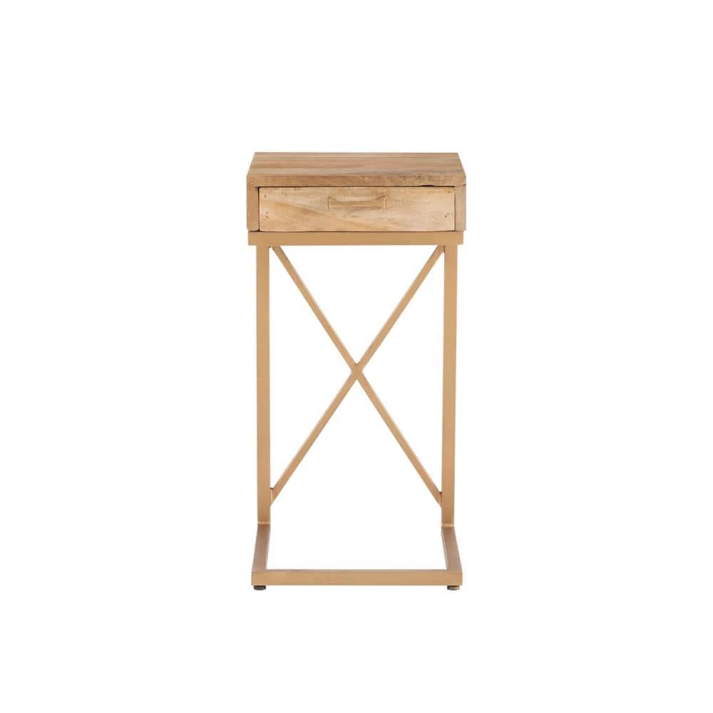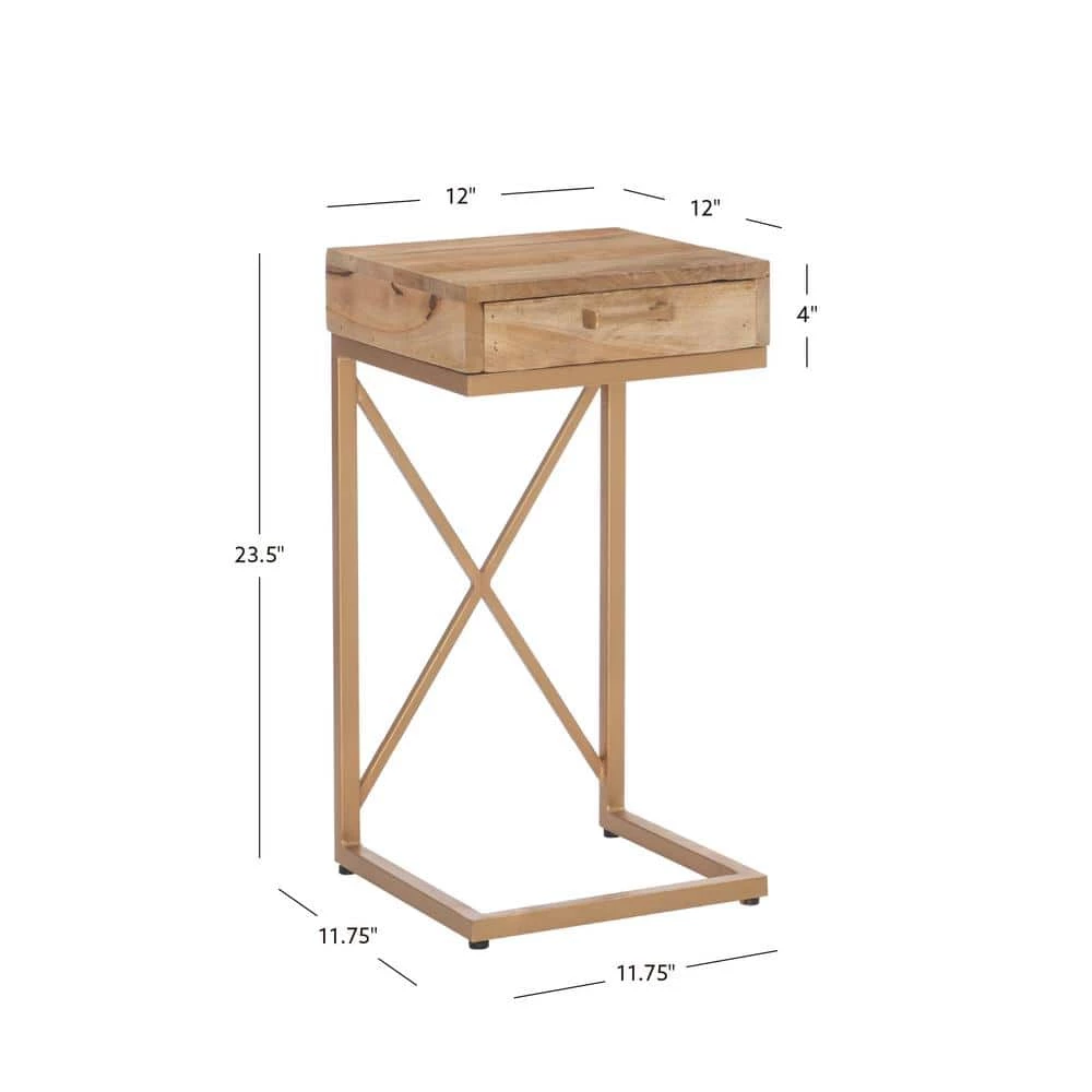 Traditional rustic charm meets industrial practicality to create this endearing C shaped side table. The worn vintage feel of the mango wood is enhanced by a lacquer finish over the rough sawn surface, pairing beautifully with the gold powder coating of the iron frame. With a height of 23.5 in., this table is best suited next to a chair or couch, beside a bed or as an auxiliary surface in an office space. Additionally, a small drawer runs on wooden glides to lend a hand with organization and subtle storage.