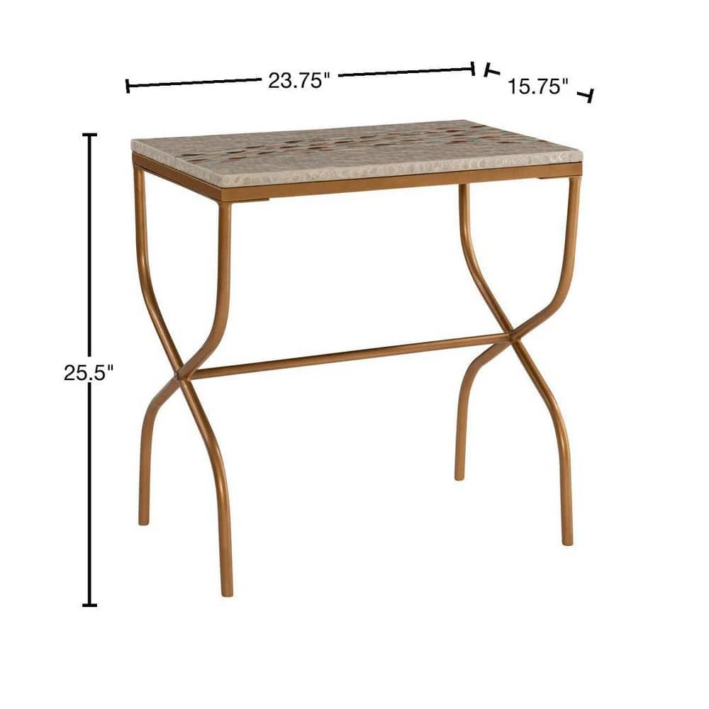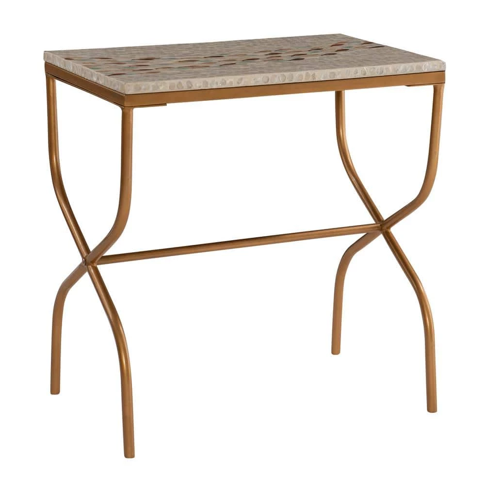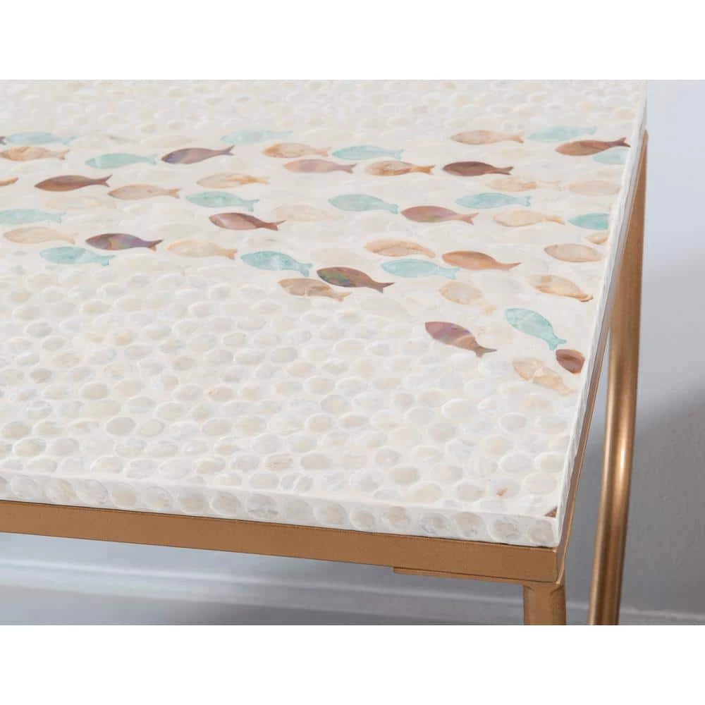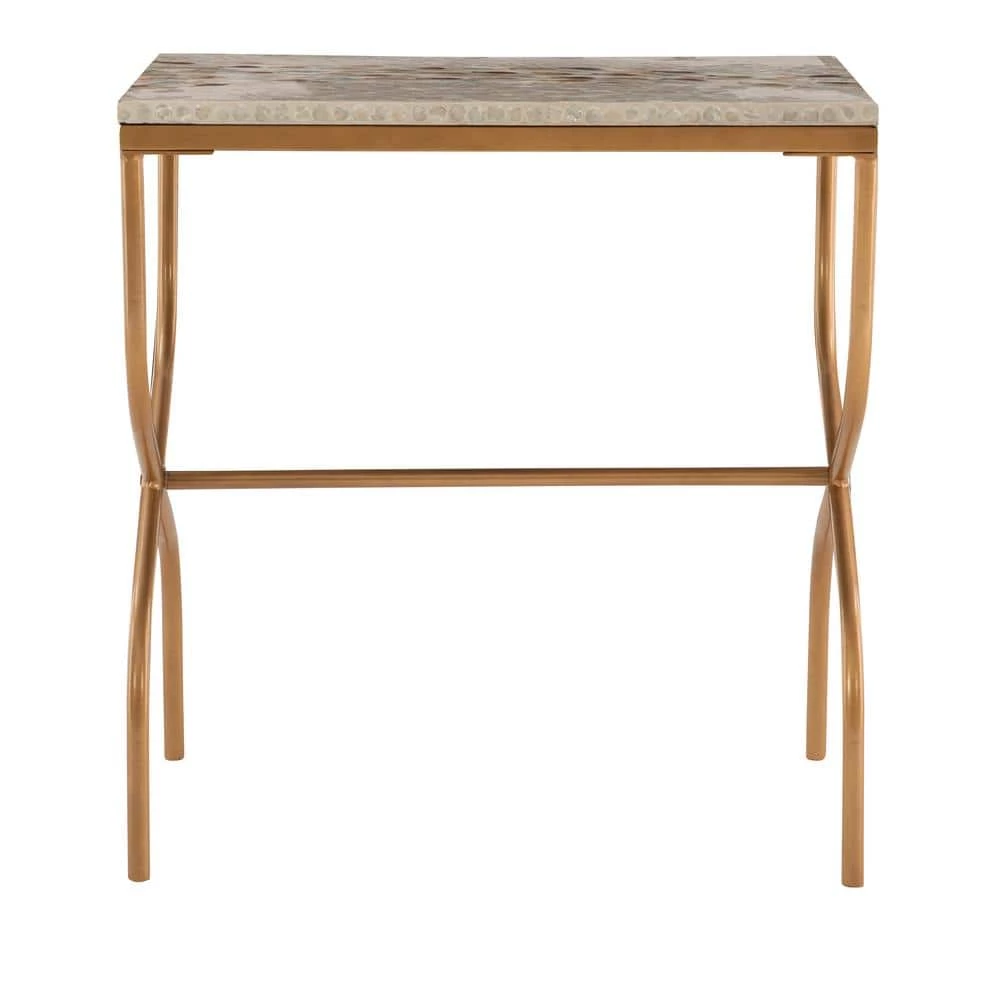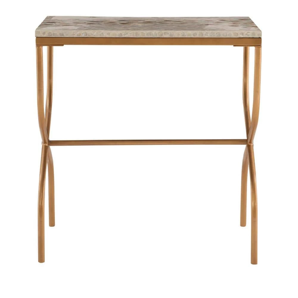 This modern accent table will add a hint of industrial yet coastal flare to any living or office space. Featuring a gold geometric frame and neutral capiz shell finish on the table top, this unique piece will serve as a beautiful accent in nearly any decor. This simple table is perfect for displaying small decor items such as candles, vases and pictures frames.