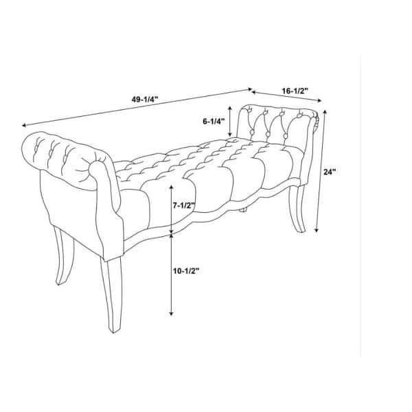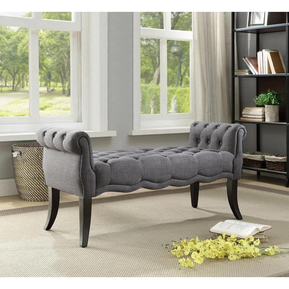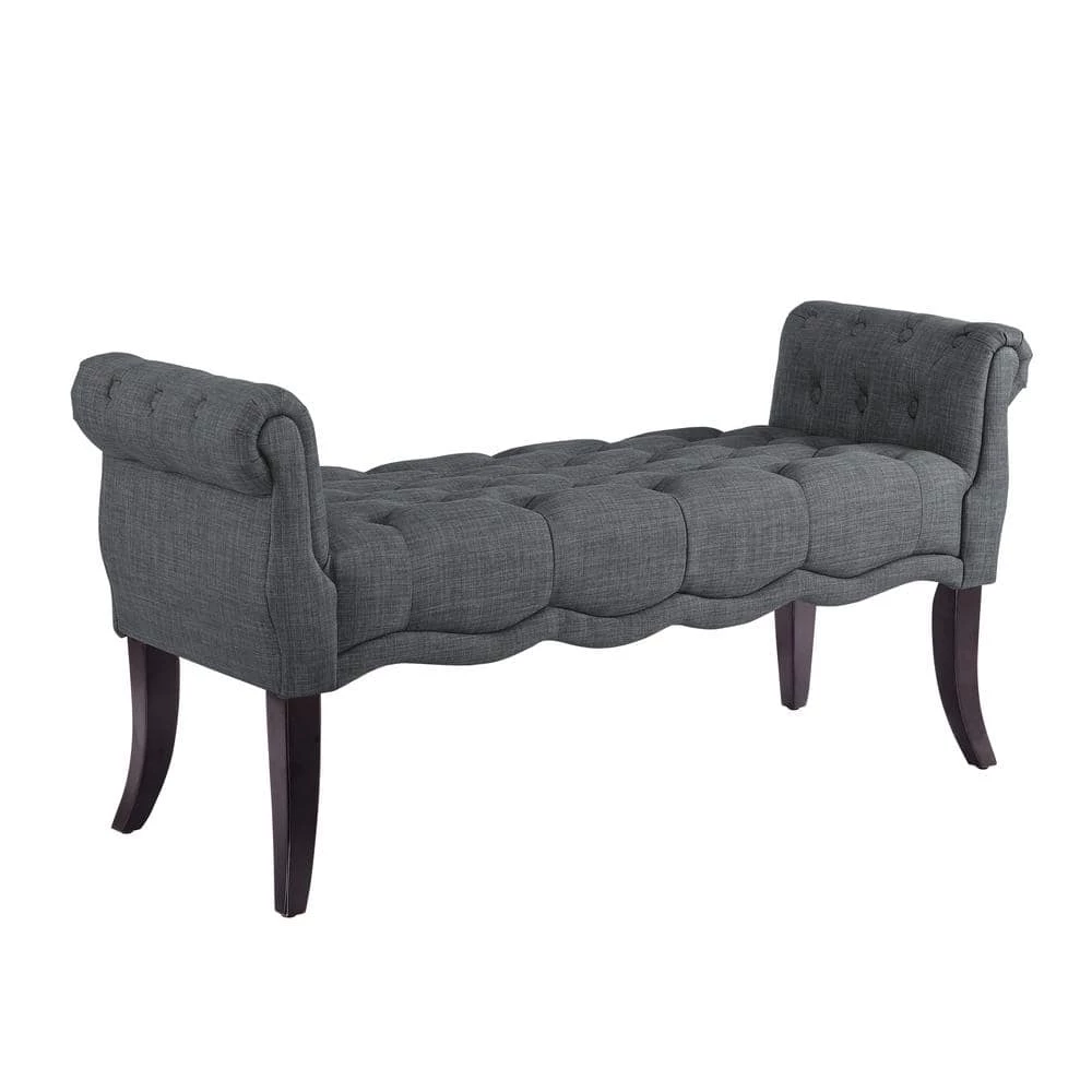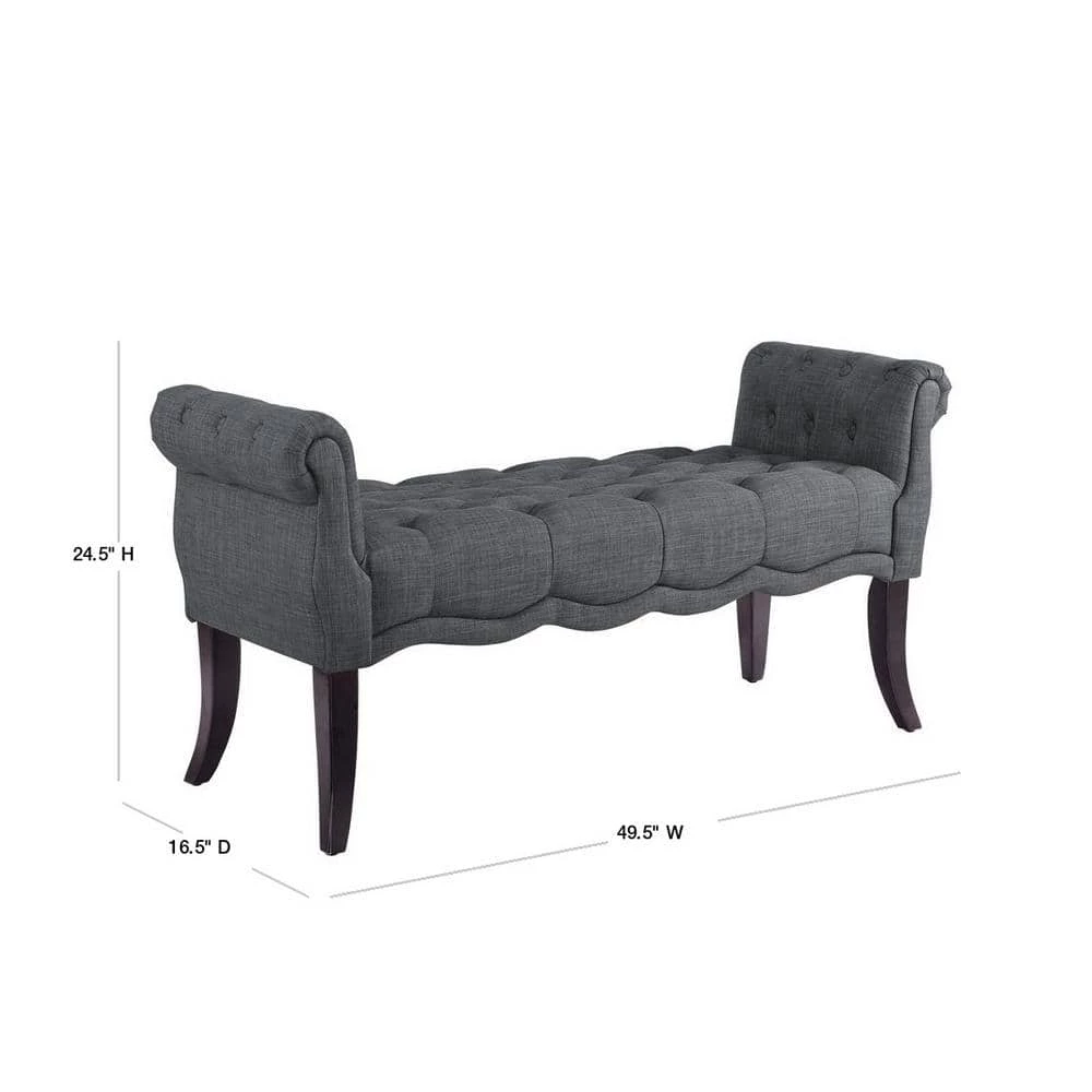 This traditional style bench will blend seamlessly with your home decor. Perfect for adding seating to a hallway, end of bed or living room. The charcoal upholstery keeps the piece neutral while the tufting and rolled arms add sophisticated charm. The hardwood frame with dark espresso curved legs give this piece a timeless look and offers durability for years to come.