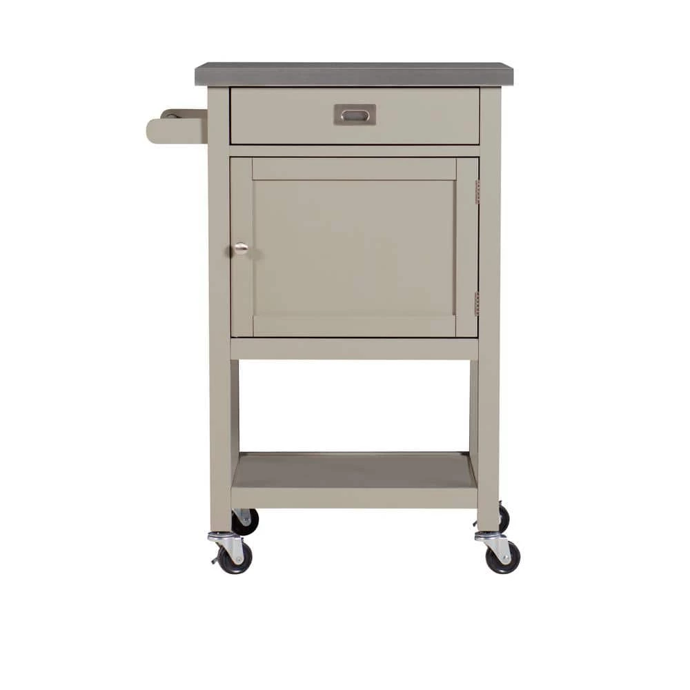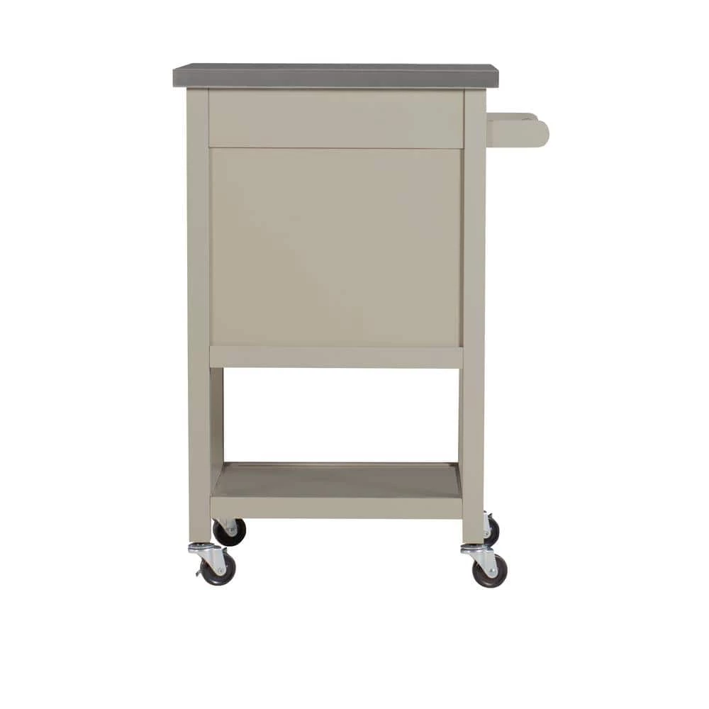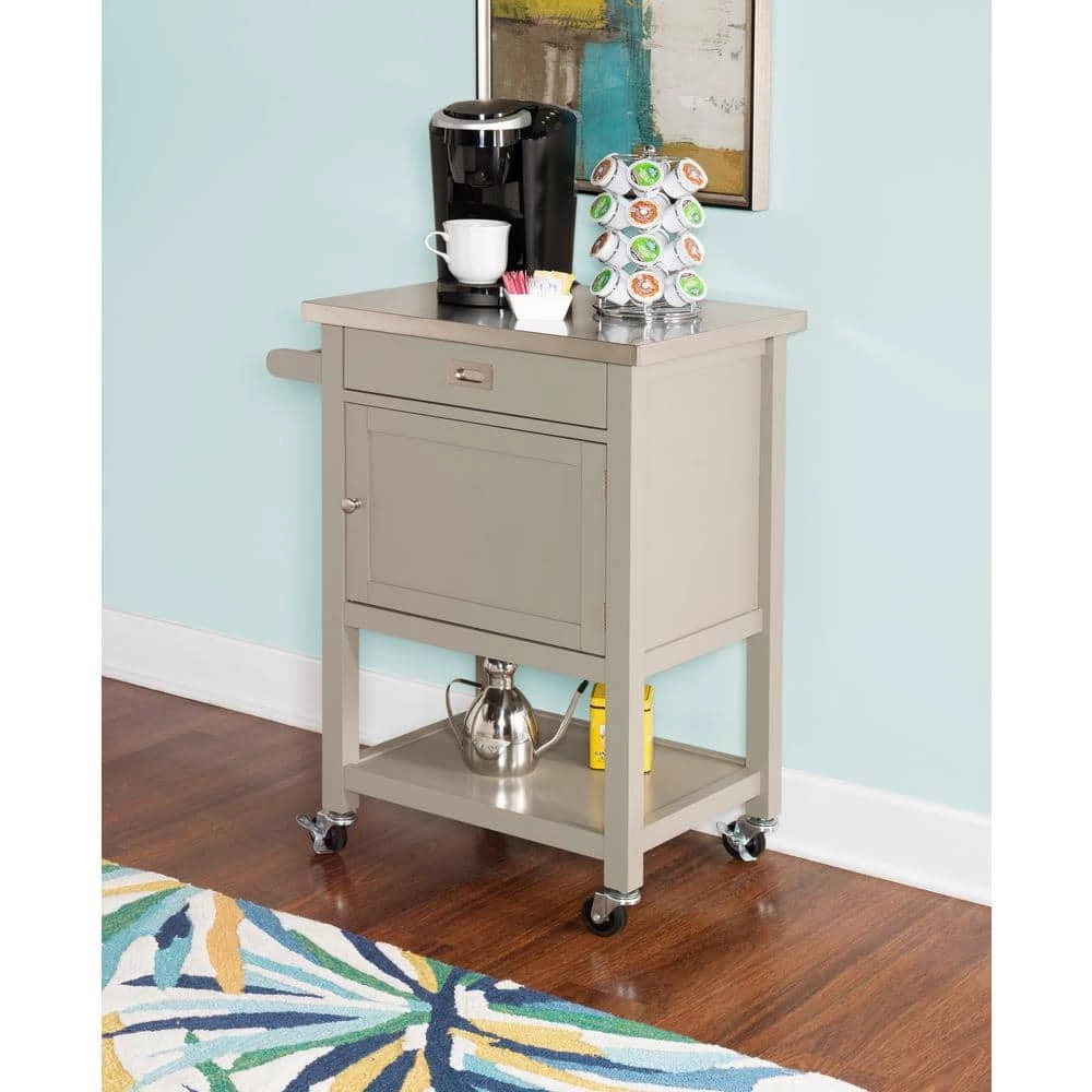 Equally at home in your kitchen or entertainment area, this Cindy Gray Kitchen Cart with Towel Rack, Shelf, Storage, and Drawer is a versatile accent. Slender legs frame a top drawer, cabinet space and bottom shelf, allowing you to store both cookware and serveware for any setting. Easy roll casters provide smooth mobility if you’re scheduled to entertain guests, or take full advantage of your space and use the stainless steel top to house a small microwave oven. Can accommodate compact microwave ovens.