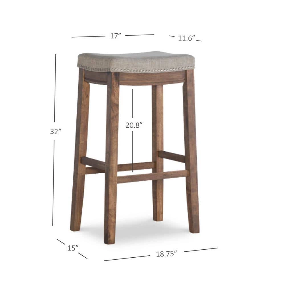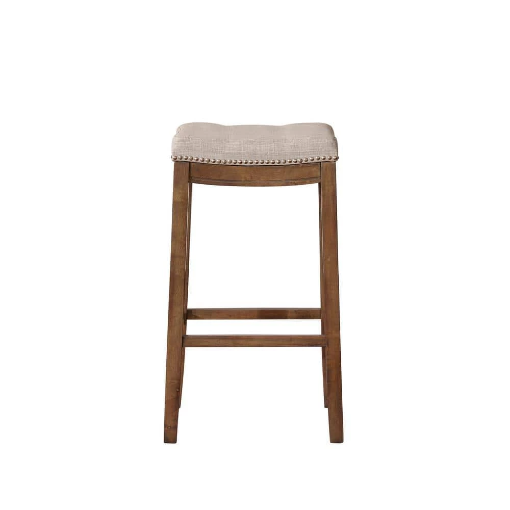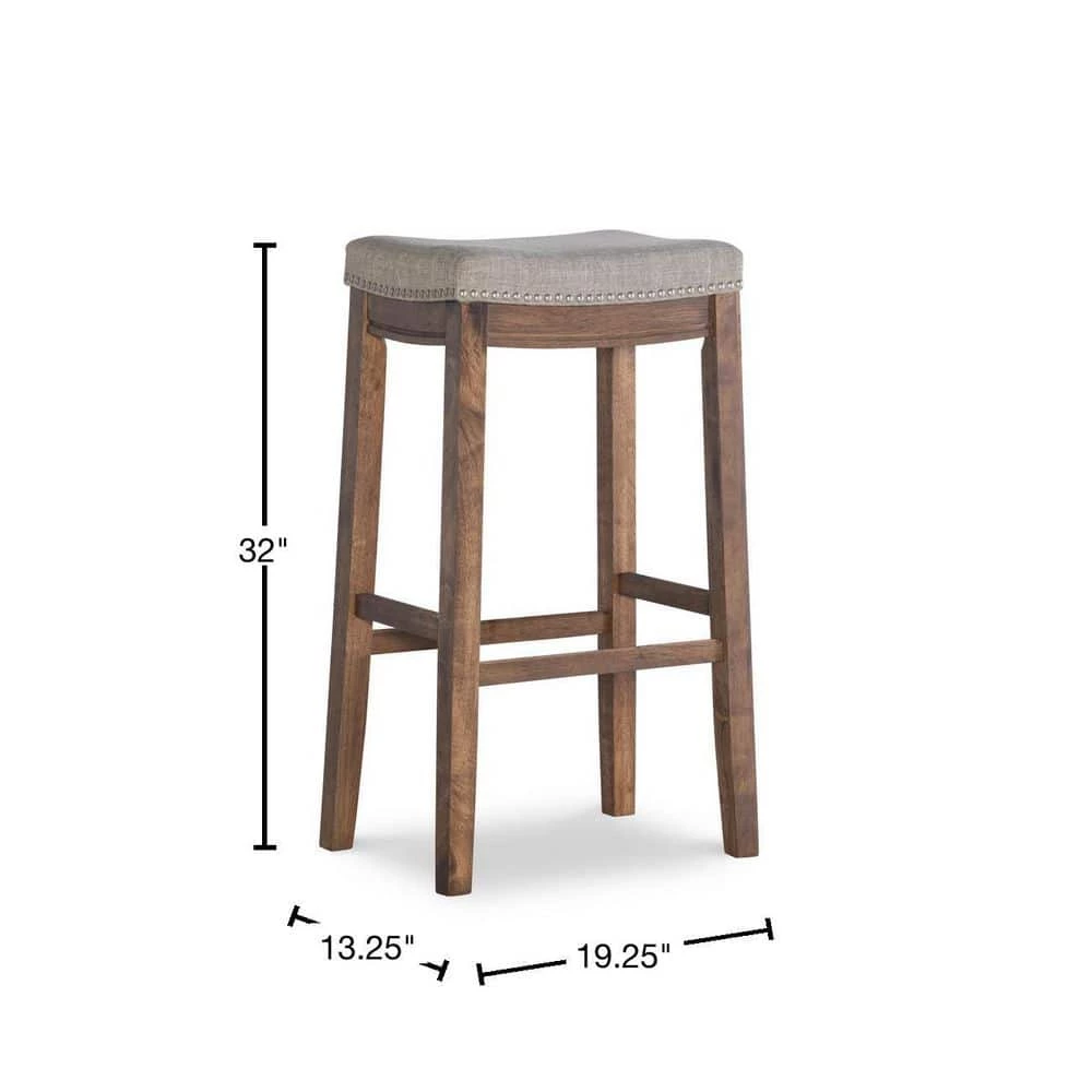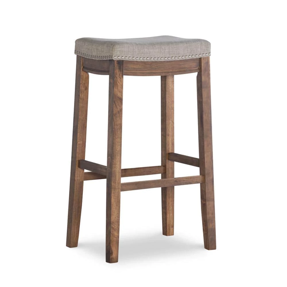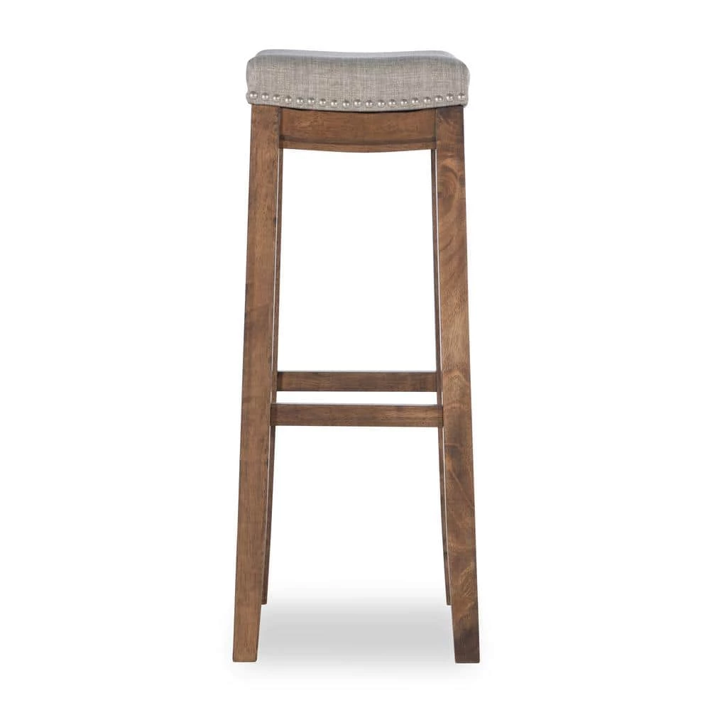 The Claridge Bar Stool will add stylish seating to any home bar or high top table. The sturdy wood frame has a rustic finish accented by a gray polyester upholstered seat. Brushed silver nail head trim adds an eye catching detail. 30 in. seat height. 275 lb. weight limit.