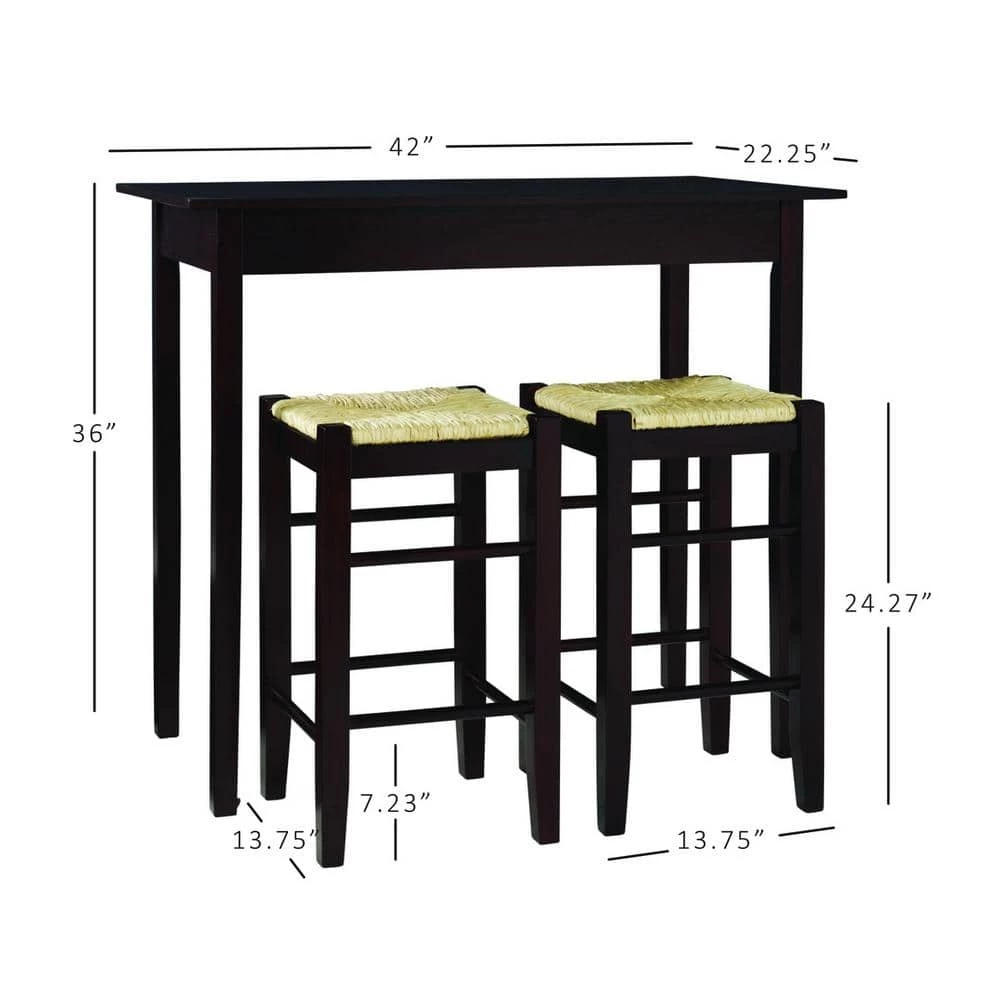 Claude 3-Piece Rectangular Wood Top Espresso Counter-Height Bar Table Set with space saving convenience. This set features a simple rectangular table on long sturdy legs with two backless counter height stools with rush seats. Made from solid woods and MDF, and topped off with a rich Espresso finish. Stools tuck neatly under the table when not in use. Stool weight limit is 275 pounds.