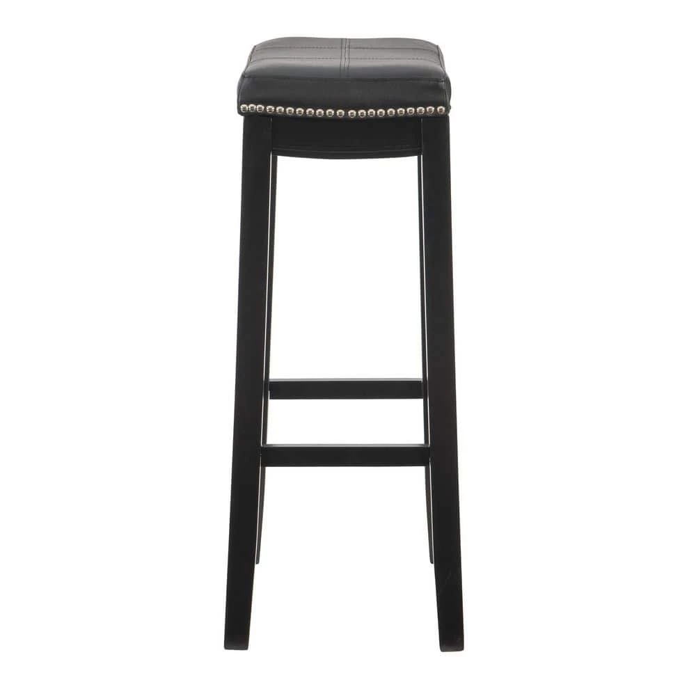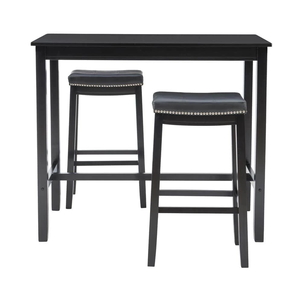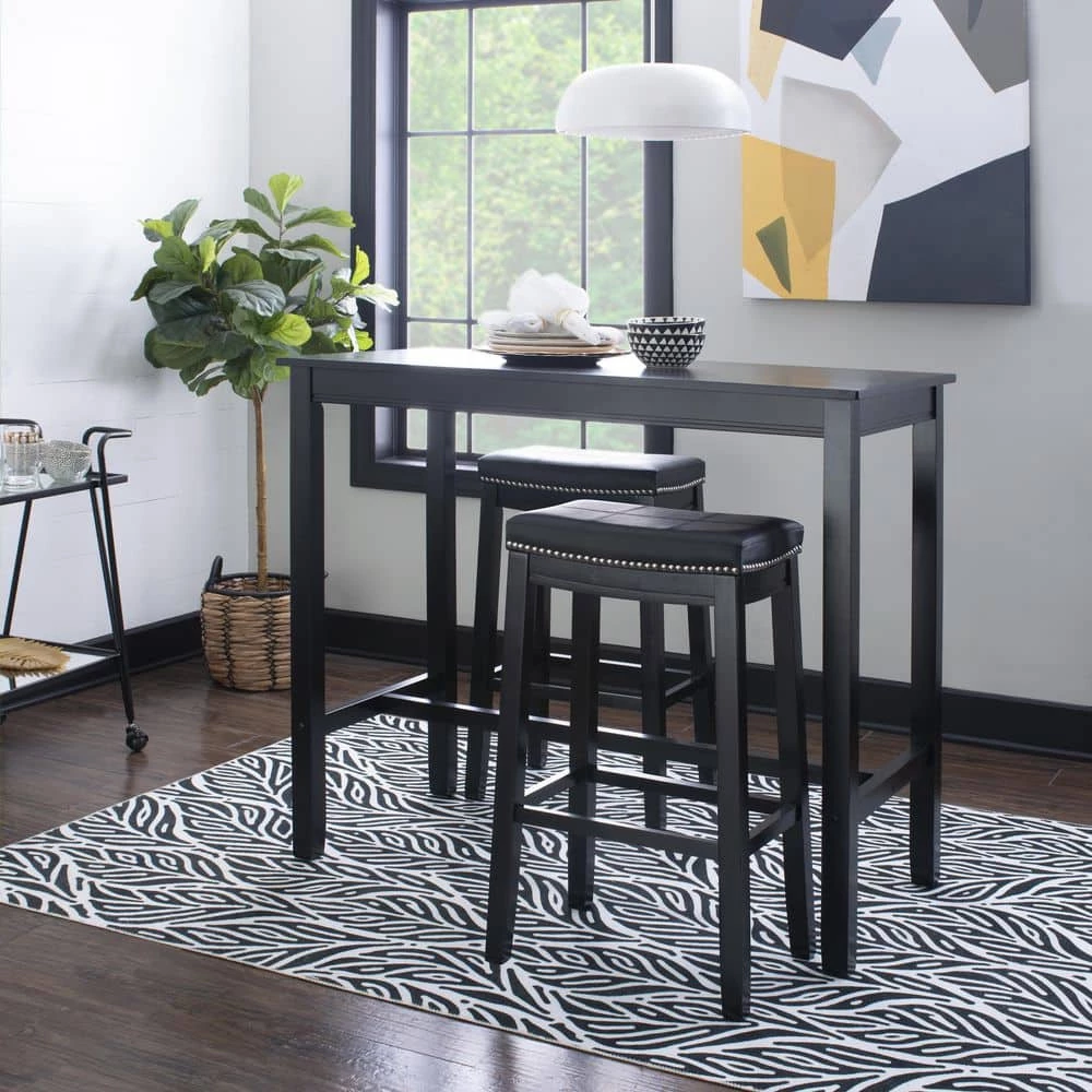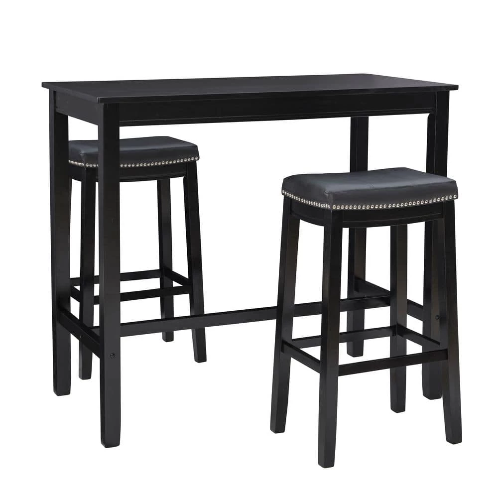 Whether you’re looking to seat a party of 2 for a quiet breakfast or accommodate a large group with extra seating options in your home, this Concord Black 3-pieces Bar Set will help you do it in style. Two matching bar stools constructed of acacia wood are adorned with mottled black faux leather, offering a sharp boho look that agrees with nearly any decor. A gleaming silver nail head trim adds a subtle, yet defining accent that pops amongst its surroundings. At the center, the tall wooden table in matching black serves as a staple piece that fulfils a variety of roles depending on your needs.