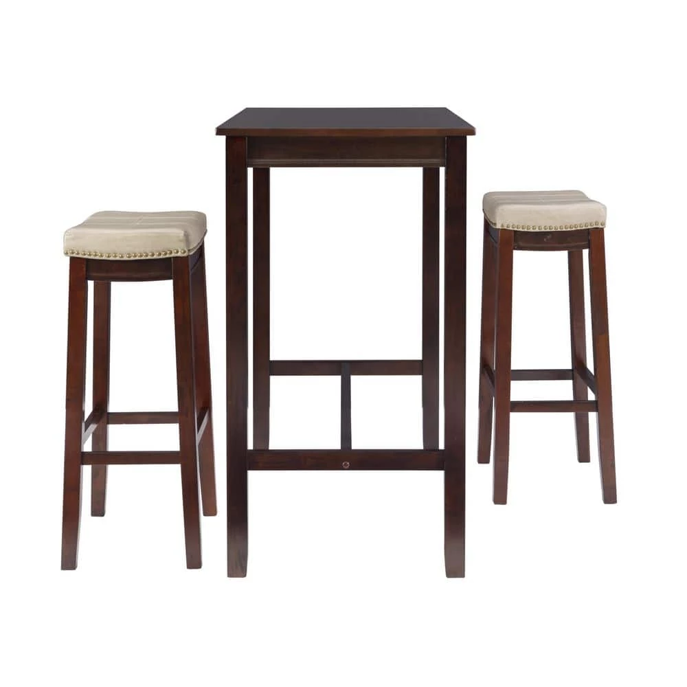 Whether you’re looking to seat a party of 2 for a quiet breakfast or accommodate a large group with extra seating options in your home, this Concord Brown and Beige 3-pieces Bar Set will help you do it in style. The tall wooden table features a beautiful veneer and a rich brown finish that exudes rustic charm. Two matching bar stools constructed of acacia wood are adorned in mottled beige upholstery for easy upkeep and enhanced comfort. Antiqued brass nail head trim adds a bohemian accent that is subtle, yet impactful when eyes land upon it.