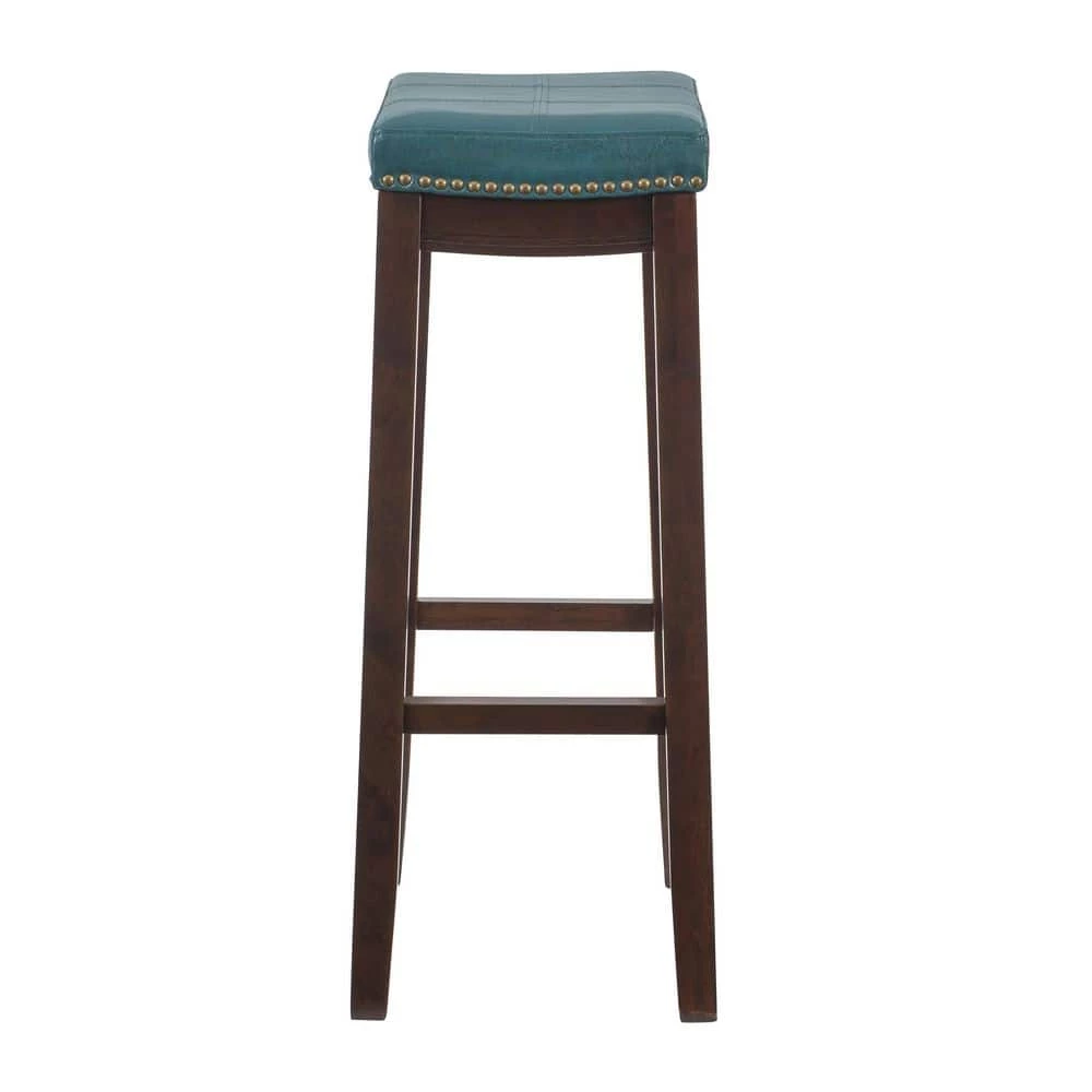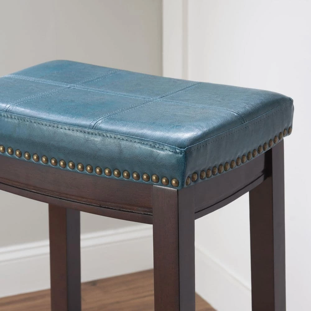 - Turquois blue faux leather upholstery offers a bold accent and easy cleaning