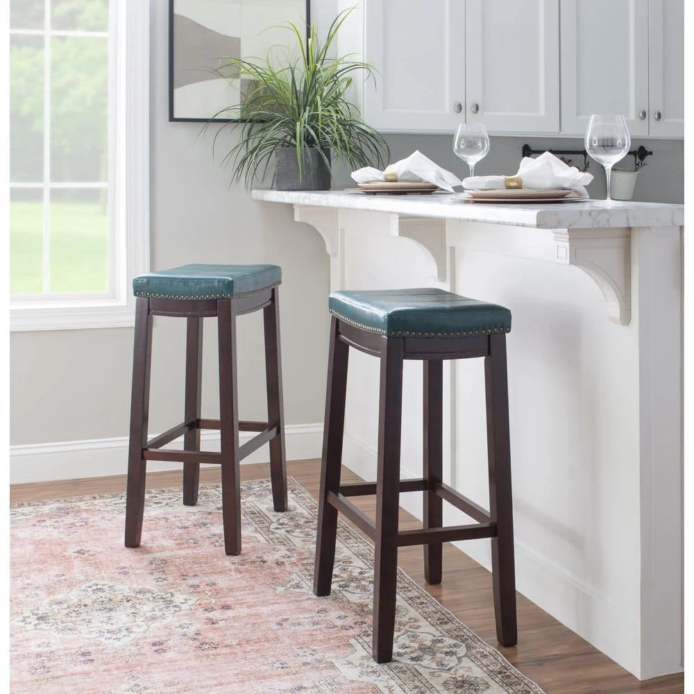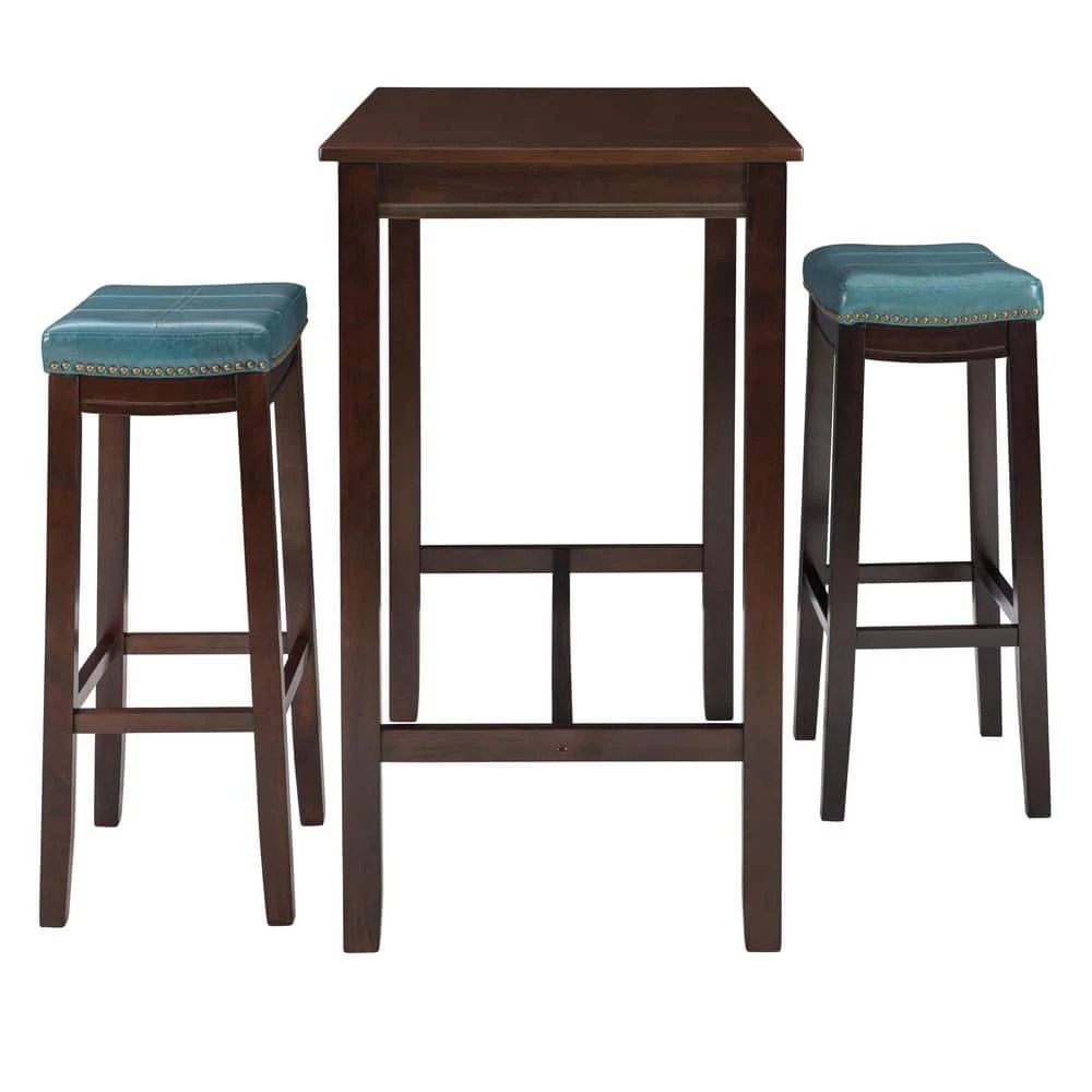 Whether you’re looking to seat a party of 2 for a quiet breakfast or accommodate a large group with extra seating options in your home, this Concord Brown and Blue 3-pieces Bar Set will help you do it in style. The tall wooden table features a beautiful veneer and a rich brown finish that exudes rustic charm. Two matching bar stools constructed of acacia wood are adorned in mottled turquois blue upholstery for easy upkeep and enhanced comfort. Brushed silver nail head trim adds a bohemian accent that is subtle, yet impactful when eyes land upon it.