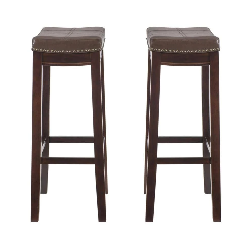 Chic and dressed in understated flourishes, this Concord Brown 2pk Barstool are the perfect addition to a boho kitchen or home bar. The solid wood frames are finished in a warm brown stain and reinforced by footrails for added balance and support. Brown faux leather upholstery covers cushioned seats with double needle stitching and antique brass nail head trim that attracts the eye. With a seat height of 32″, these stools are perfect for tavern tables, bars or kitchen islands 40″ to 43″ high.