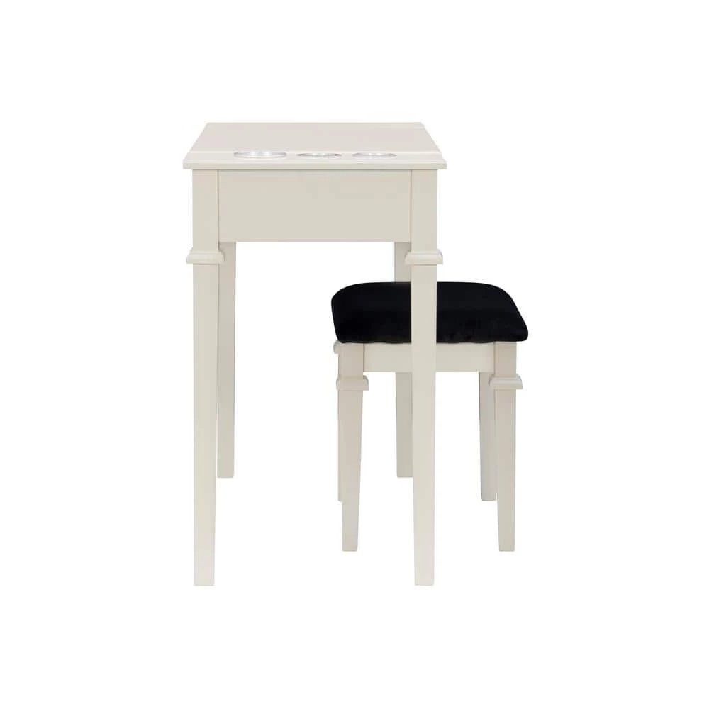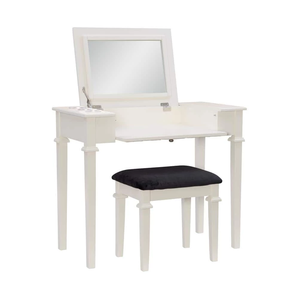 This Coraline Vanity White with Flip Open Top 36 in. W x 18 in. D is designed to help organize and destress your morning routine while simultaneously raising your bedroom aesthetic. Form is not sacrificed for function, but seamlessly infused. The left side of the vanity top features three convenient metal lined holders for placing a blow dryer, flat iron and other styling tools. A hidden 14 in. x 14 in. mirror that flips open on soft hinges, revealing a large compartment for makeup and supplies. The front panel also folds down to make space for a laptop or keyboard, creating the perfect workstation for answering emails or studying. Additional features of the set include convenient cable management and a matching vanity bench with a padded cushion adorned with black soft velvet fabric.