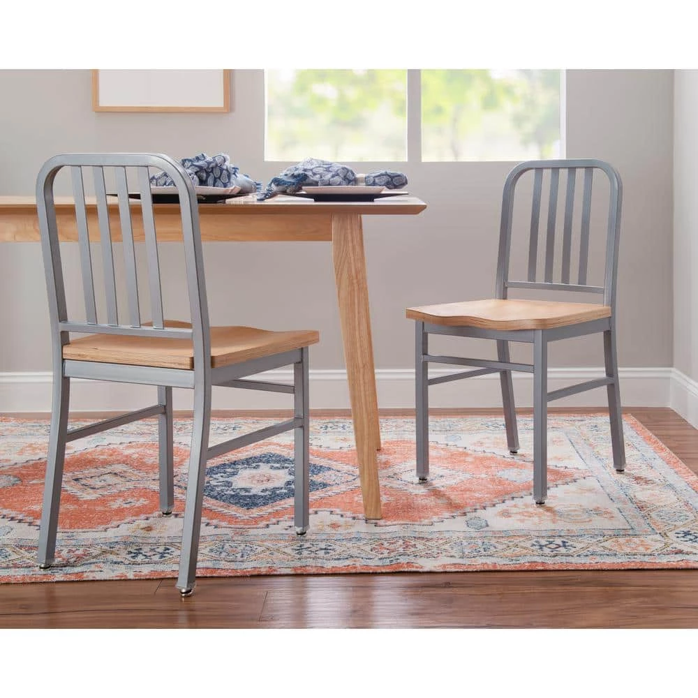 Comfort and nostalgia are packaged together in this modern take on a classic Corbin Silver Metal Dining Chair with Wood Seat (Set of 2). The streamlined design is made of steel for ensured strength and durability, while the natural beechwood seat offers a rustic contrast to the silver profile. Ideal for homey restaurants, cafes or parlor rooms, this chair is made with high traffic areas in mind. The set of two is outfitted with plastic glides to protect floors from wear and tear and supports up to 300 lbs each seat.