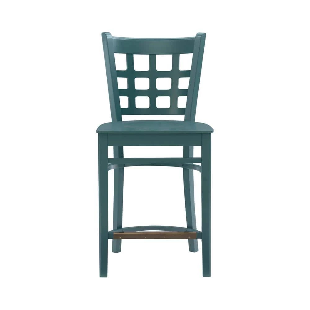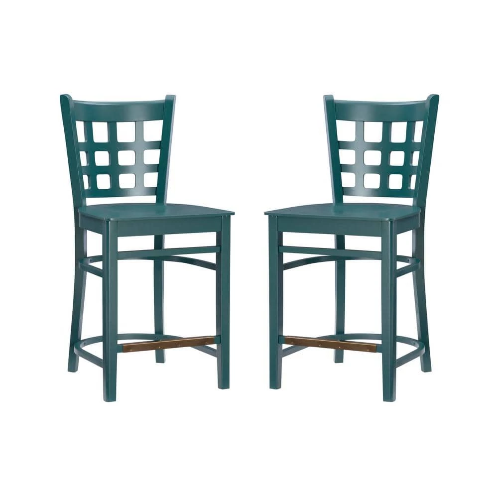 Holding to tradition, yet striking balance with modern temperament, this farmhouse Dixie 37.75 in. Green Grid Back Wood 24 in. Counter Stool with Wood Seat (Set of 2) is a perfect addition to a variety of dining settings. A grid of open squares is framed by the curved back, inspired by lattice fencing of distant countrysides. Made of solid beechwood for ensured strength and stability, the frame is painted in teal green, then sealed and sanded before receiving a glossy lacquer finish. With a seat height of 24 in, the set of two is an ideal match for counters 35 in. to 39″ high and supports up to 300 lbs each chair.