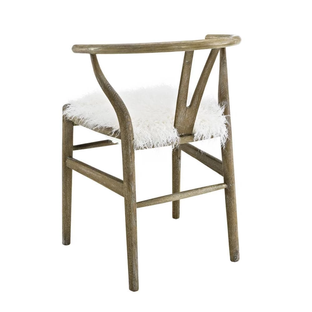 Dramatic and bold, this Downing Grey-Wash Faux Fur seat Chair is perfect for adding fun style to your space. The chair has a trendy wishbone styled frame that is finished in an neutral brown/gray washed finish. The faux fur seat is soft, plush and eye-catching!