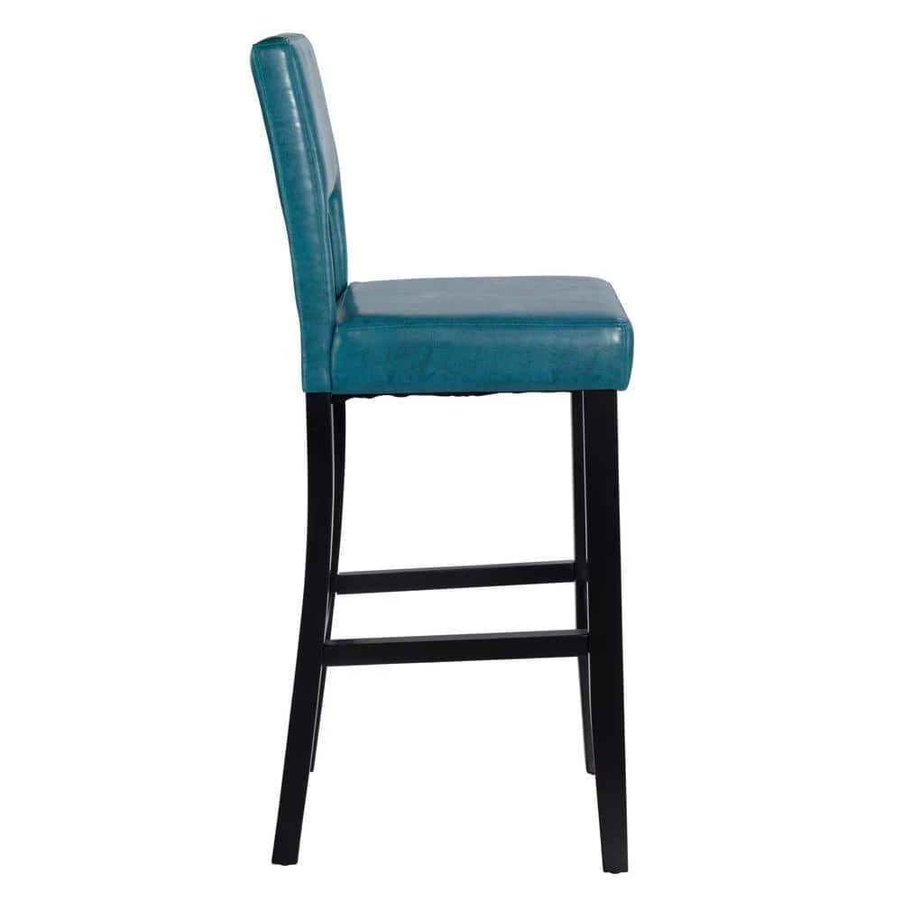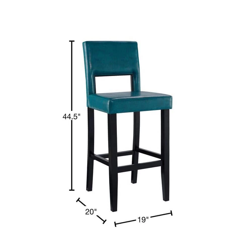 Add color and interest to your home with this beautiful modern inspired Edison 30 in. Blue Upholstered Bar Stool. The back detail has a sleek rectangular wood trimmed cut out design. The beautiful agean blue faux leather is easy to clean and will add a pop of color to your home. The solid wood frame features foot rails for stability and slightly tapered legs in a black finish. This modern, stylish stool is perfect for enjoying a casual meal at a kitchen counter or tavern table 41 in. to 43 in. High.