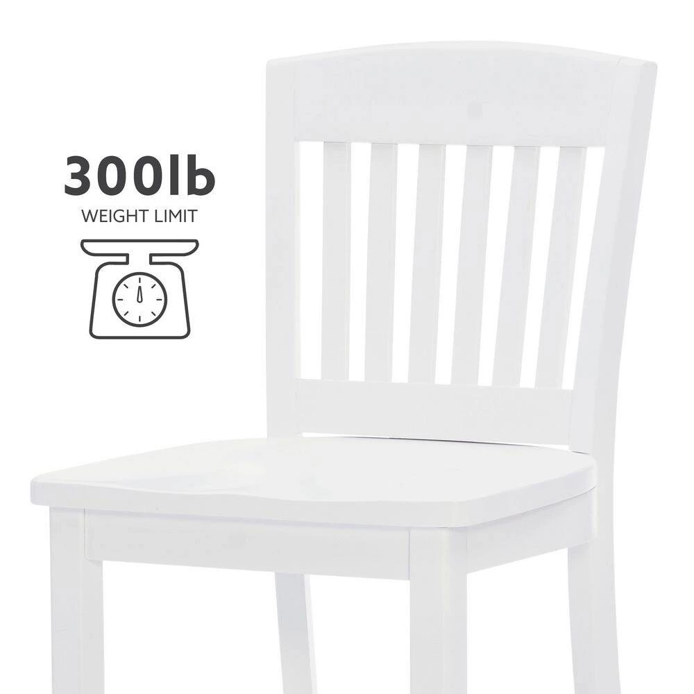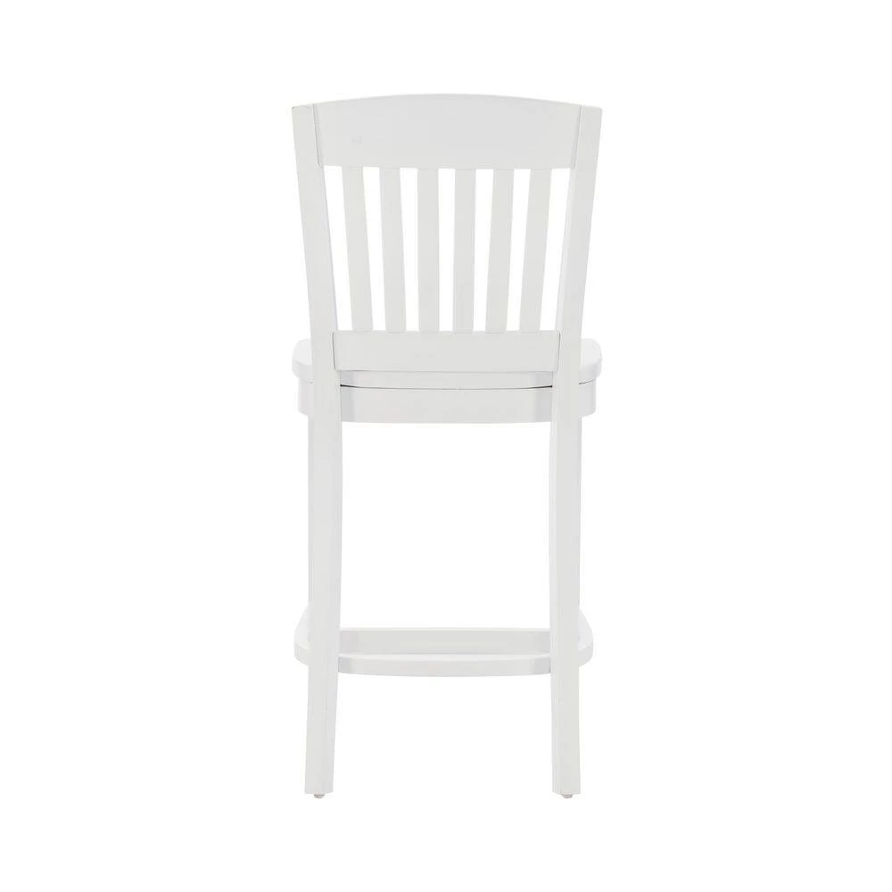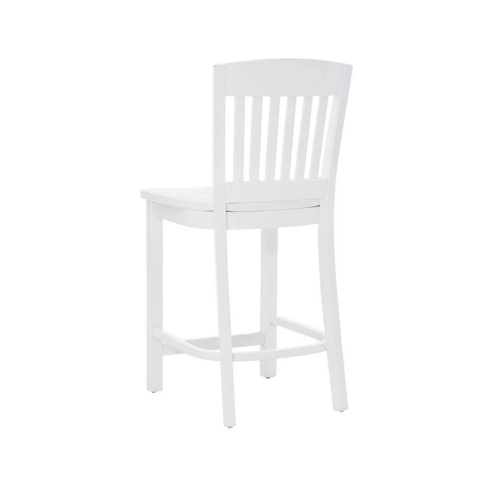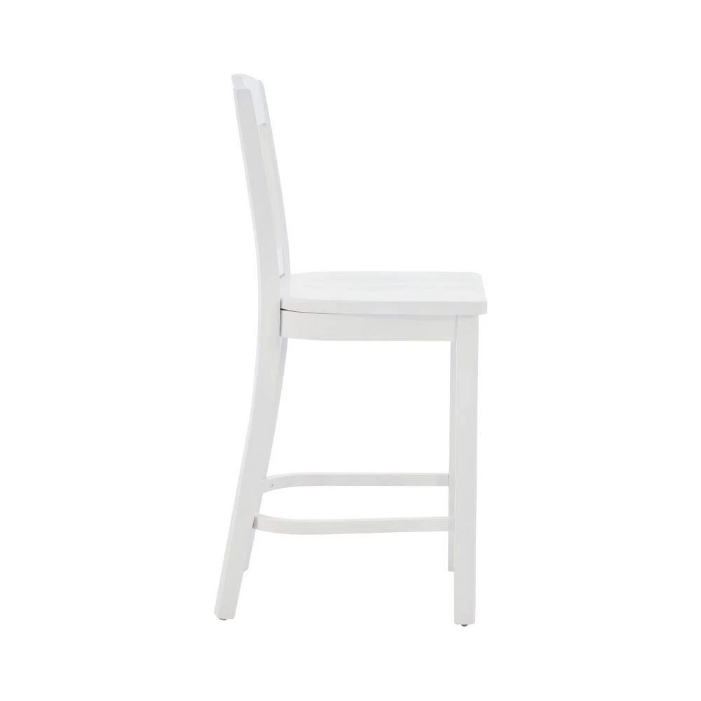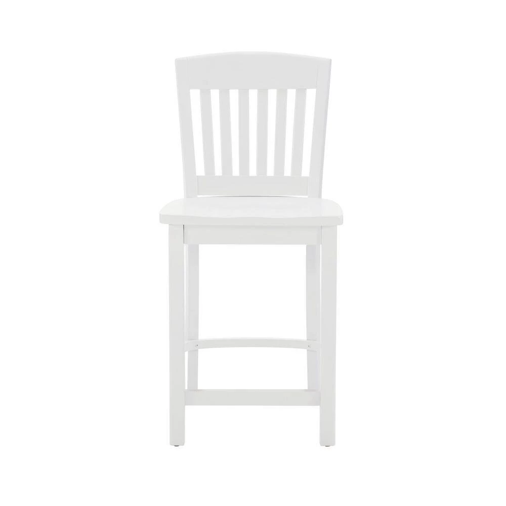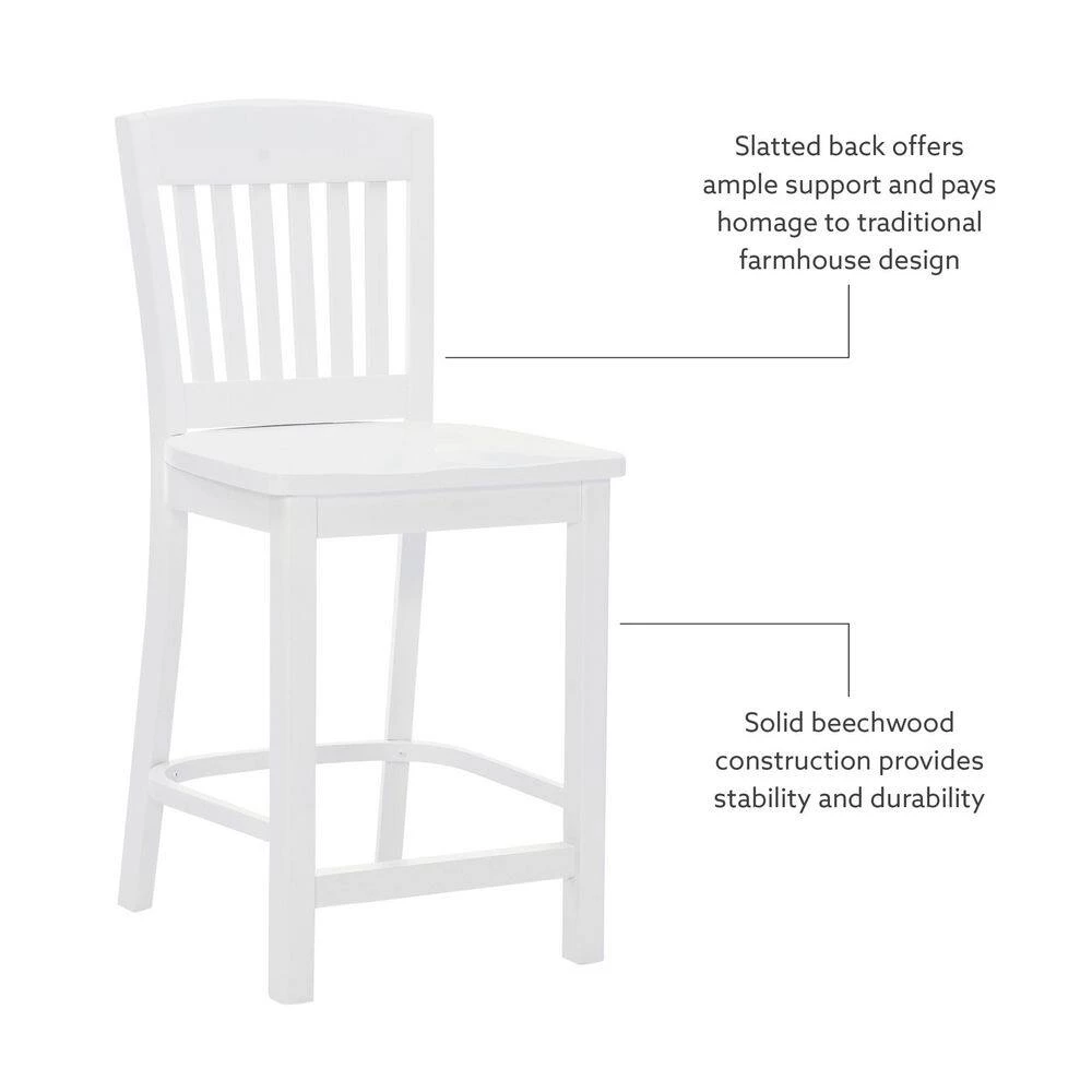 Modest and reliable, this classic Elihu White Counter stool with Wood Seat (2 pk) is a perfect fit in various modern farmhouse and cottage settings. Covered in lustrous white paint, sealed and sanded down before receiving a glossy lacquer finish, the sturdy beechwood frame is designed to shine through the years. A slatted backrest and saddle seat offers comfortable support, and the seat height of 24″ makes for a seamless match with counters 35″ to 39″ high. This American made set of 2 arrives fully assembled with the option to attach a brass kickback, also included in the carton. Commercial Grade