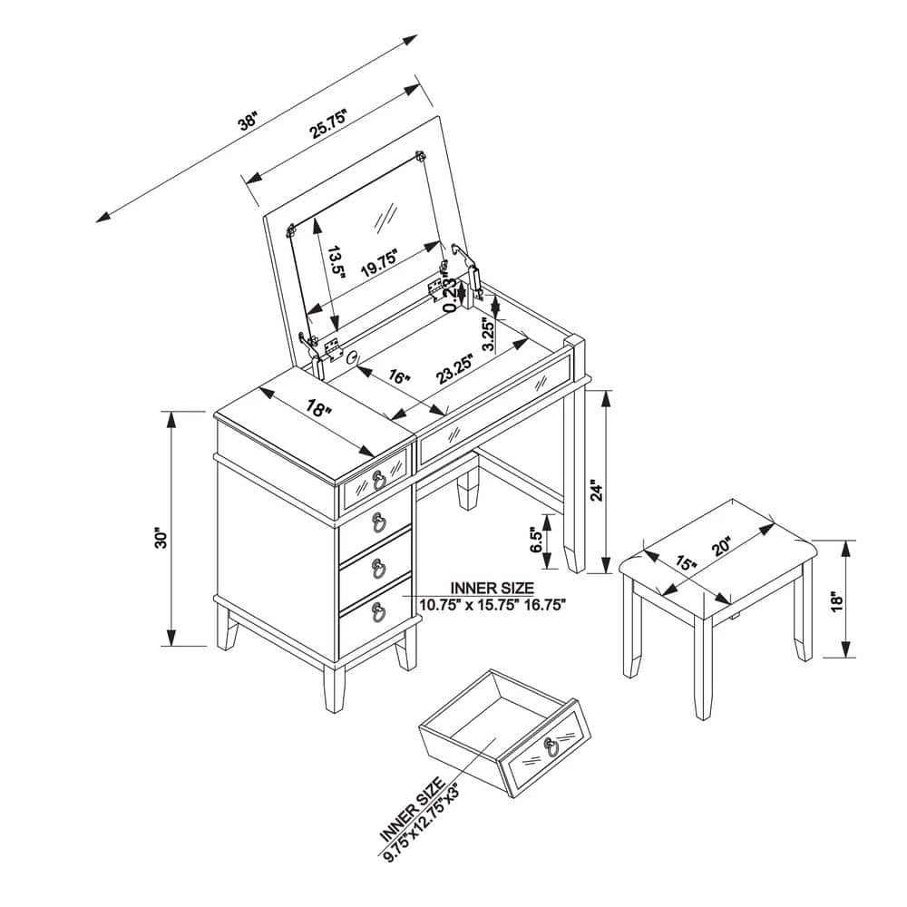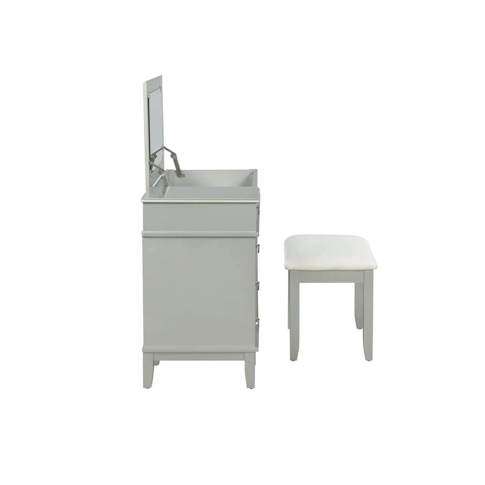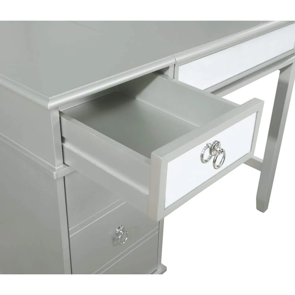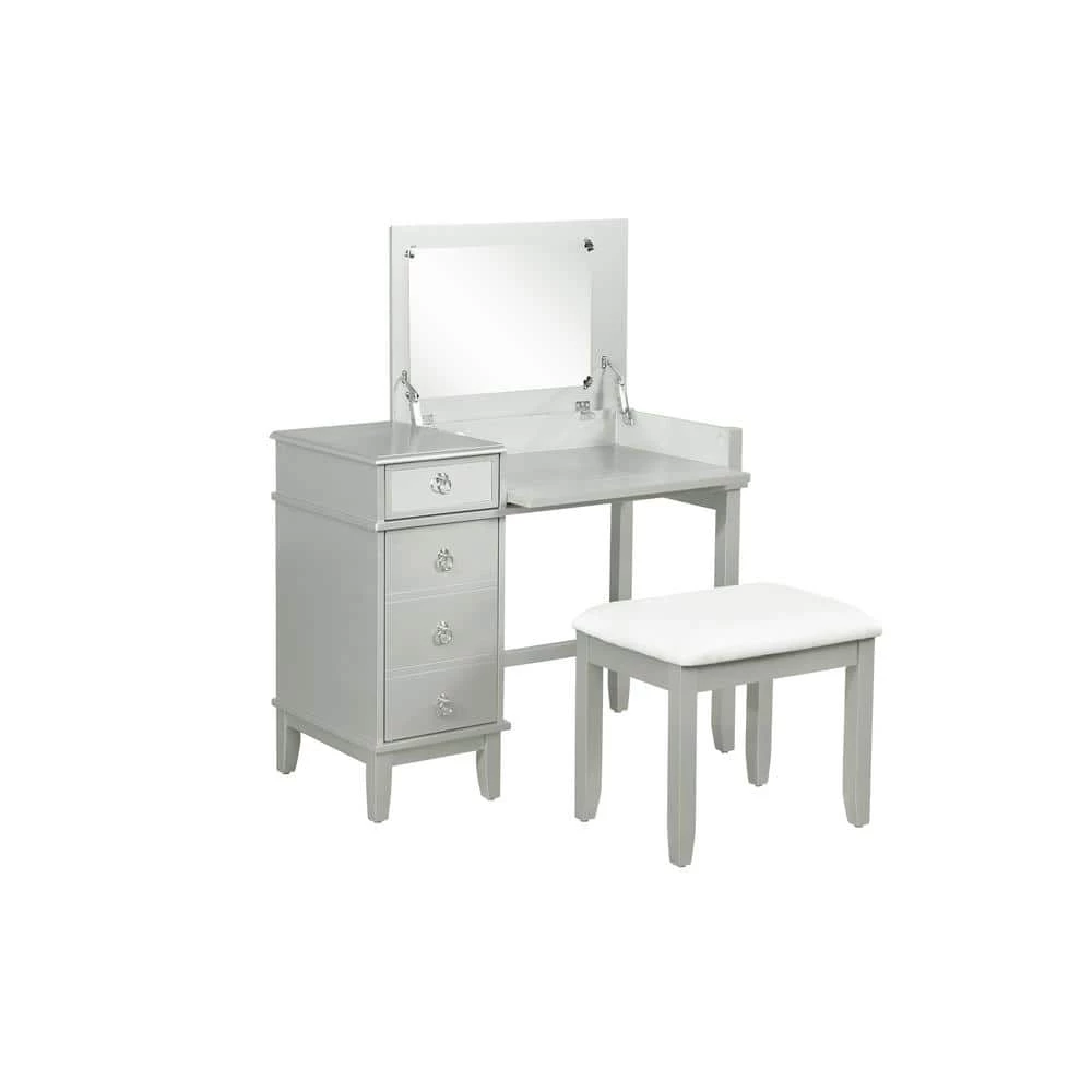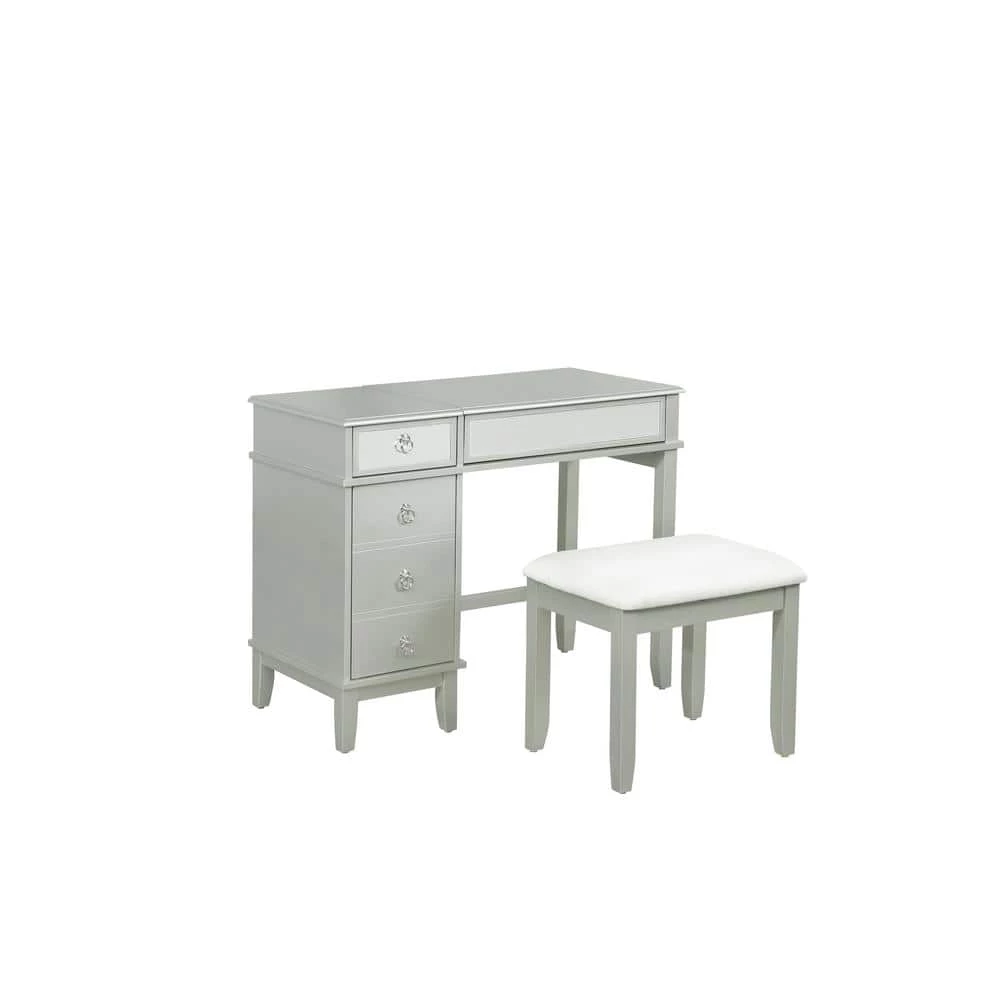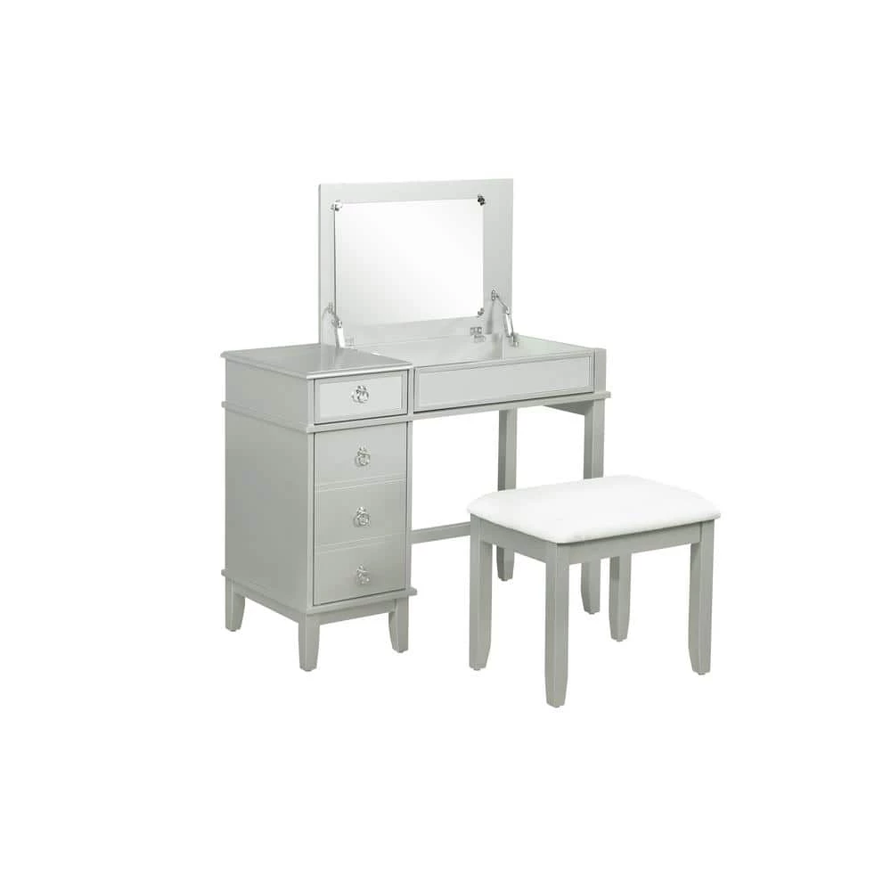 This Eva Silver with Mirror Accents Vanity Set with Upholstered Stool embodies the holy trinity of style, storage and functionality. The desk top flips open on soft close hinges to reveal an oversized 19.75″ x 13.5″ mirror, while the front panel folds down into the perfect work station for a laptop or keyboard. A drawer on the top left side sits above a large storage cabinet with an adjustable shelf. The set also includes a matching vanity bench with a padded cushion adorned with white polyester linen look fabric that has a hint of silver thread running interwoven.