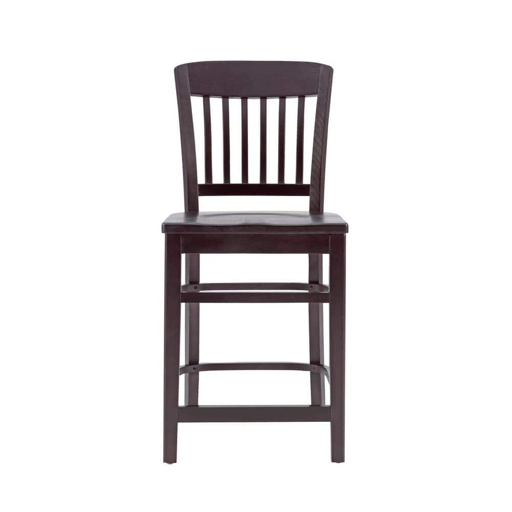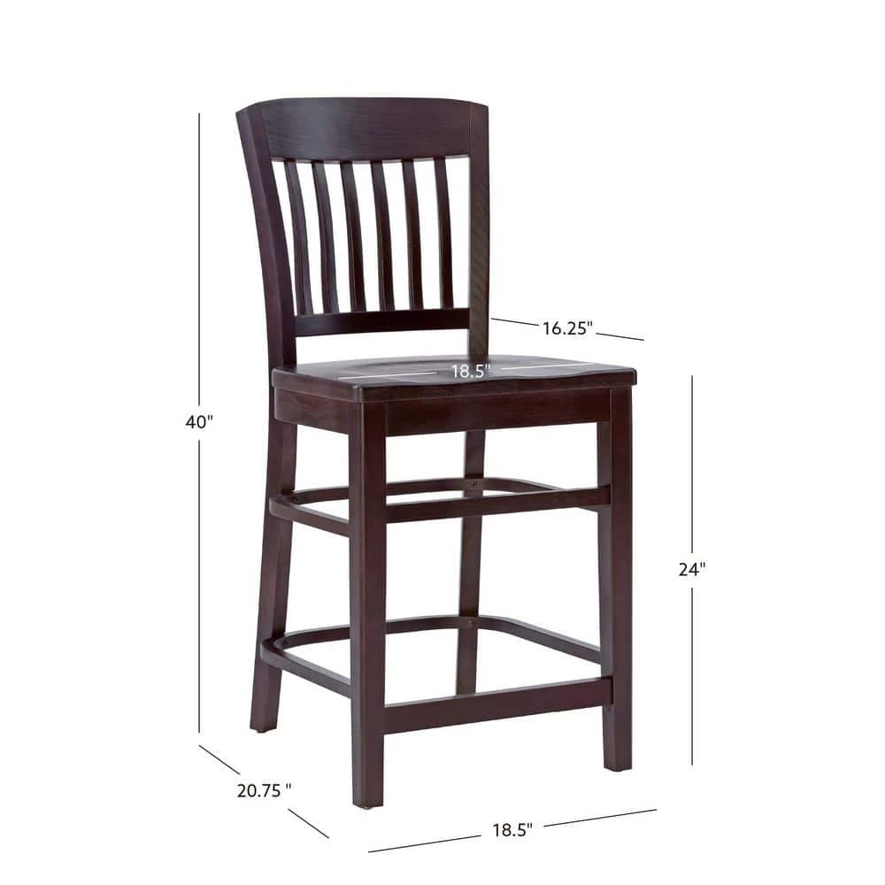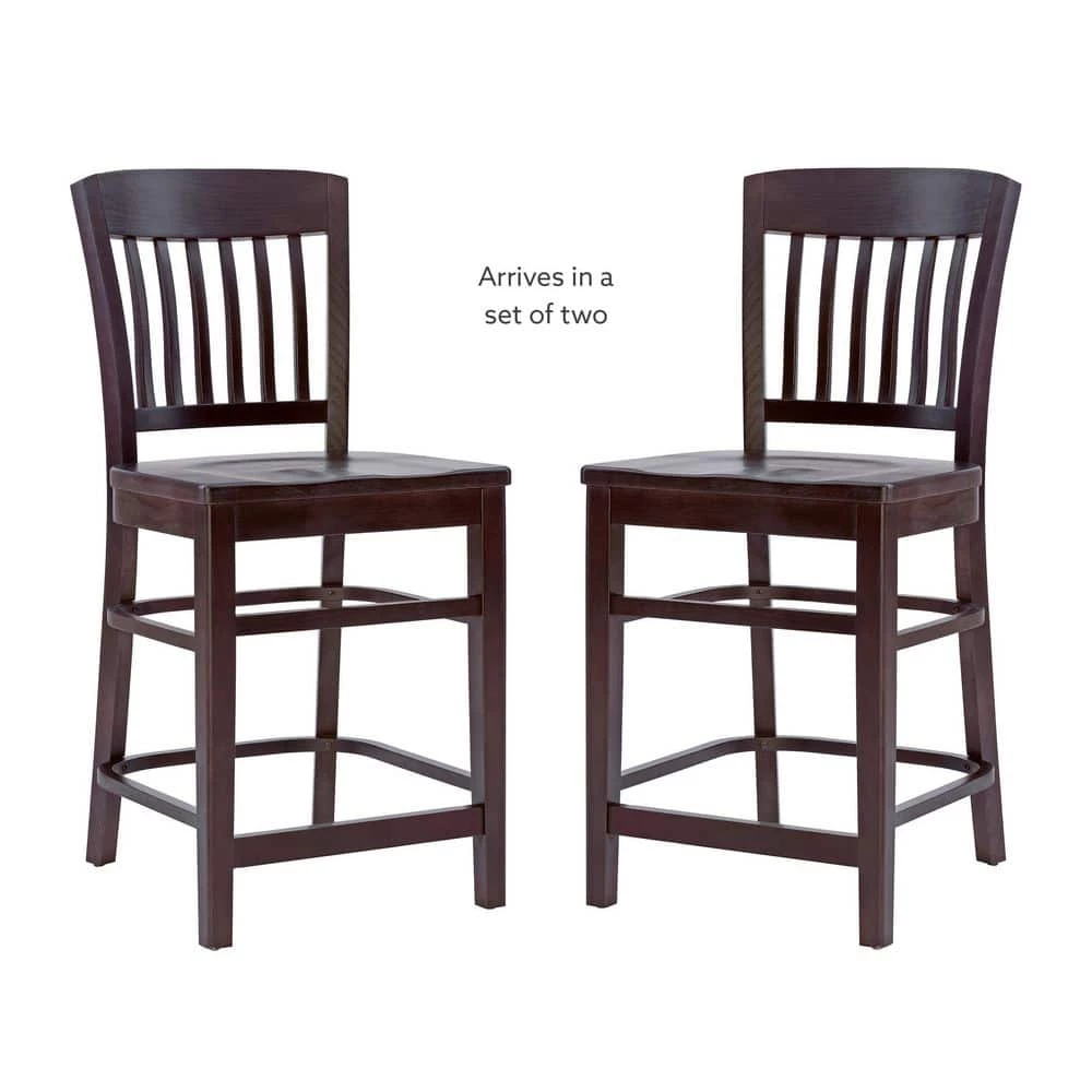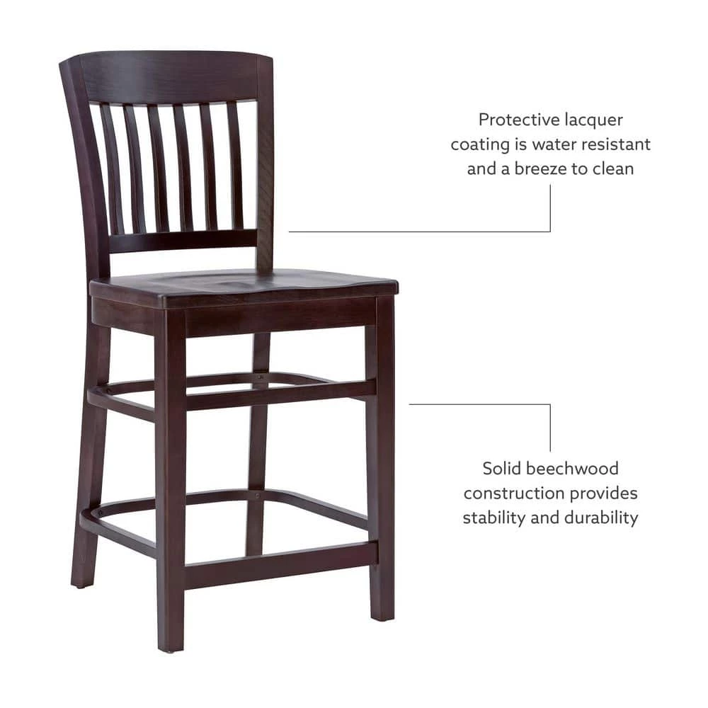 Boasting traditional farmhouse design with hints of modernity, this Fargo Brown Counter stool with wood Seat (2 pk) will bring a new rustic charm to your home. The sturdy frame is constructed of solid beechwood for long term strength and stability, stained brown, then finished in a glossy protective lacquer. The slatted backrest features a subtle tilt for ergonomic support, while the saddle seat is slightly indented for comfort. A brass kickback arrives detached with the option to easily fit it to the footrail of this American made piece. Commercial Grade