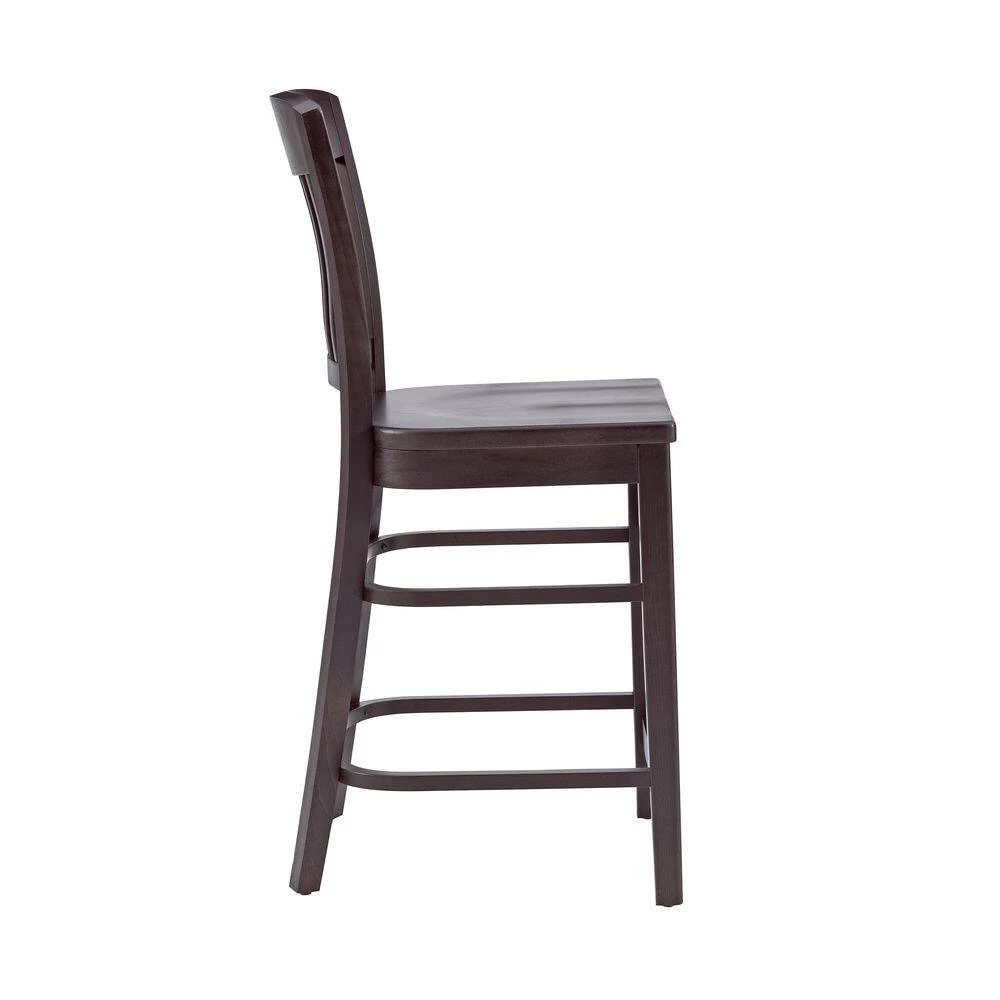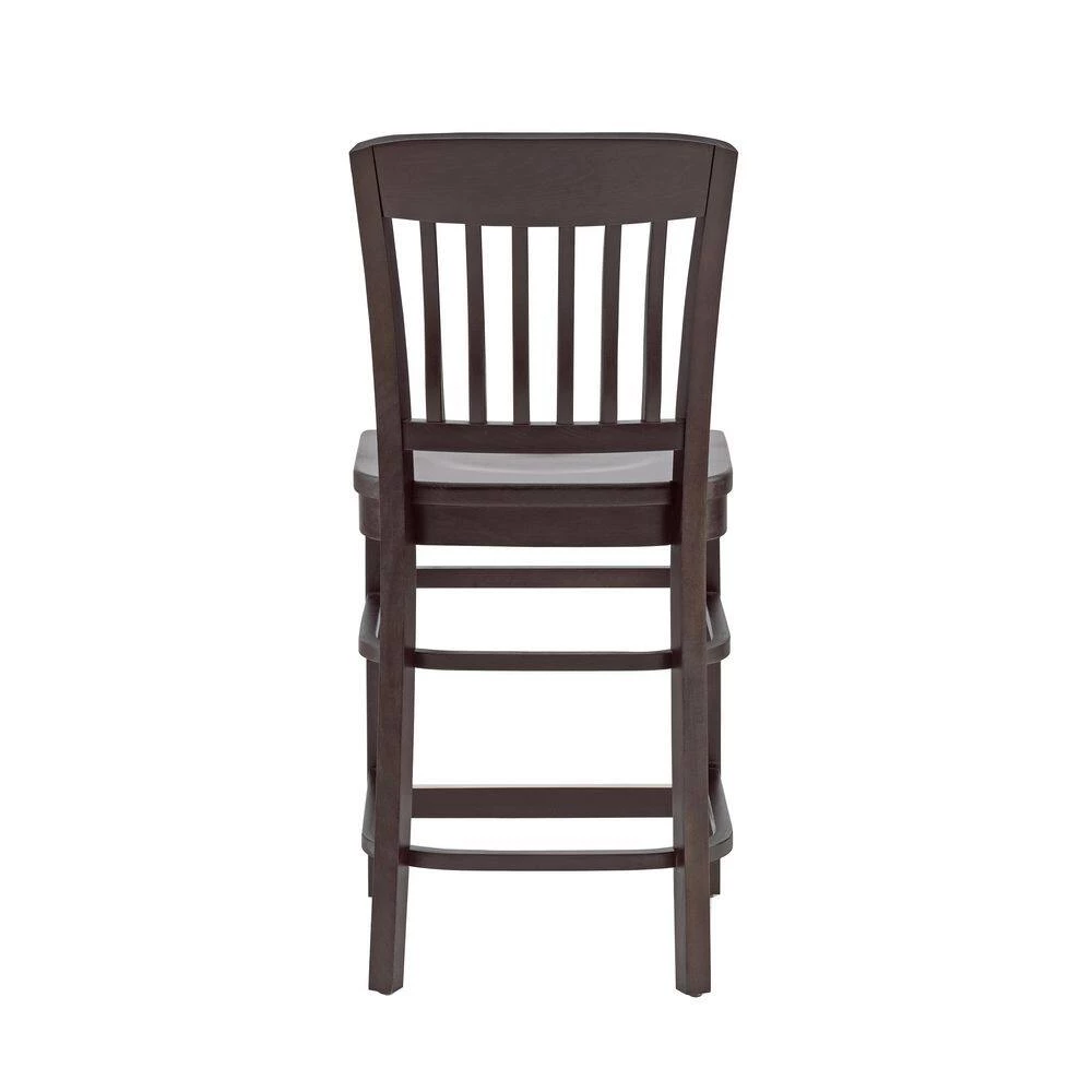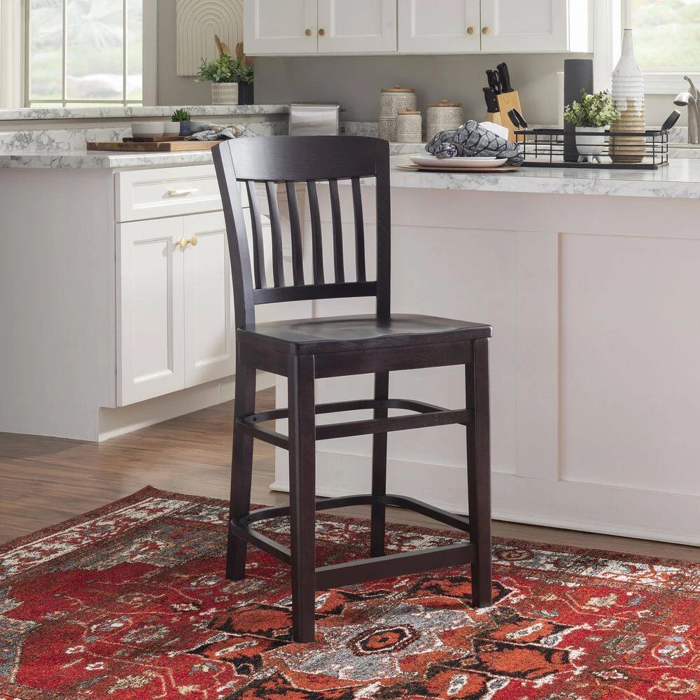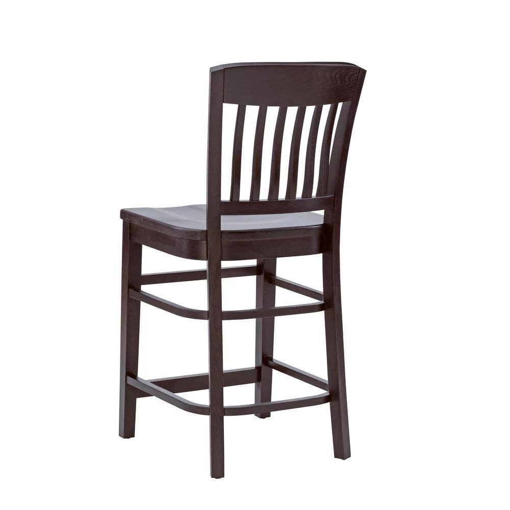 Boasting traditional farmhouse design with hints of modernity, this Fargo Brown Counter stool with wood Seat (2 pk) will bring a new rustic charm to your home. The sturdy frame is constructed of solid beechwood for long term strength and stability, stained brown, then finished in a glossy protective lacquer. The slatted backrest features a subtle tilt for ergonomic support, while the saddle seat is slightly indented for comfort. A brass kickback arrives detached with the option to easily fit it to the footrail of this American made piece. Commercial Grade