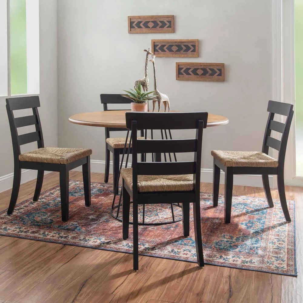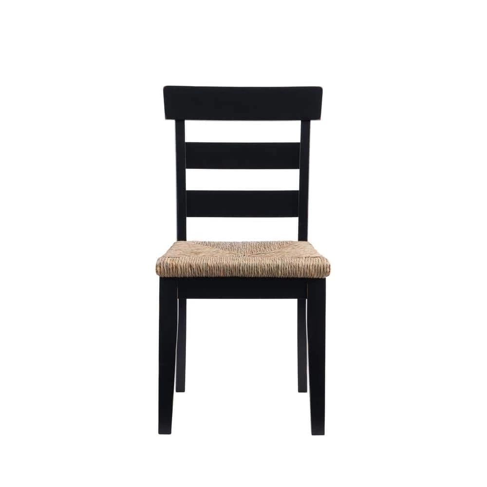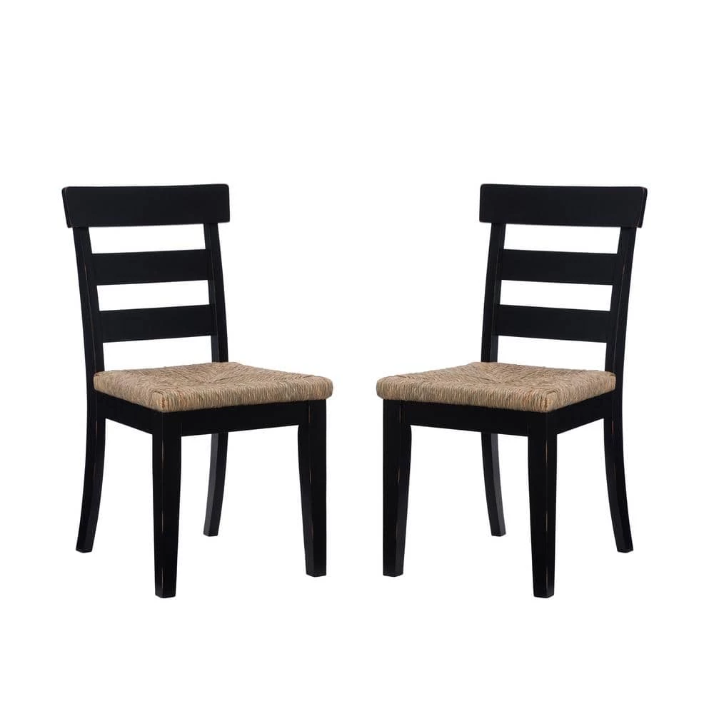 Striking balance between midcentury simplicity and rustic warmth, this Fernley Black Rush seat Dining Chair (2 pack) is a perfect fit amongst both traditional and contemporary decor. The classic ladderback frame is constructed of solid rubberwood for ensured strength and stability, while handwoven rush seating offers extra comfort and a natural flair. Finished in black, this piece is also covered in a clear lacquer finish for extra durability and shine. The set of 2 supports up to 225 lbs. each seat and comes equipped with glides to protect your floors.
