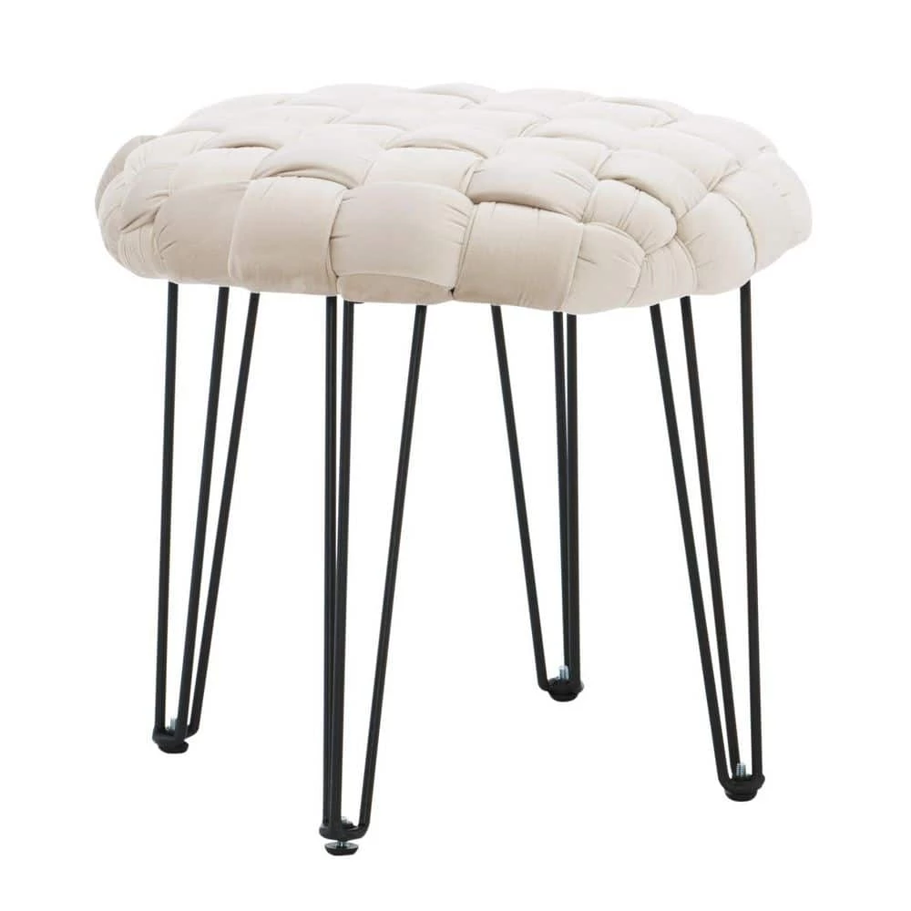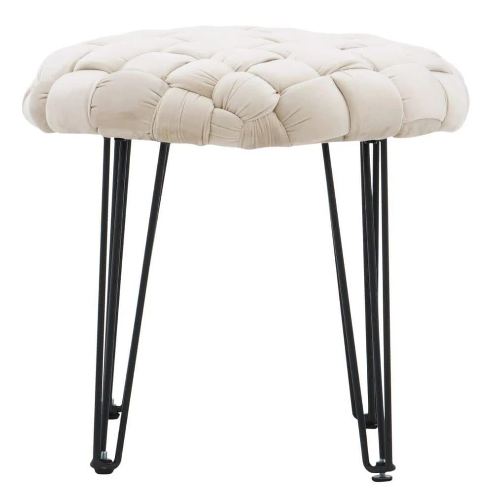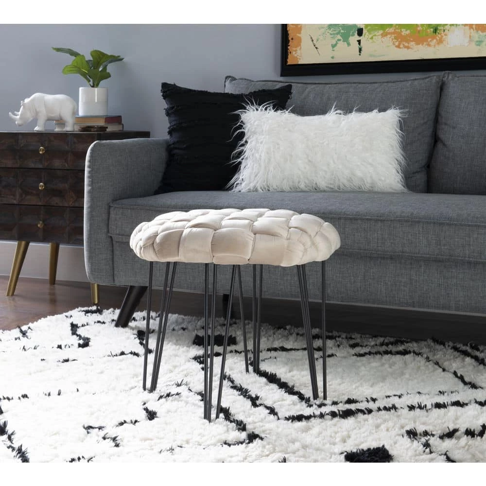This Grace Cream Basket weave Round Ottoman Stool is a versatile accent piece that lends a helping hand in more settings than you may expect. The handwoven velvet basket weave top in cream is made of 100% polyester to create an inviting perch over foam padding that pairs seamlessly with a variety of decor. Place it next to your couch as a footstool, in a bedroom or office as extra seating, in front of a mirror as a vanity stool or just about anywhere else you like to kick back. The black metal hairpin legs come equipped with adjustable feet so you can level things out over uneven rugs and floors. Flexibility, comfort and style, all in one