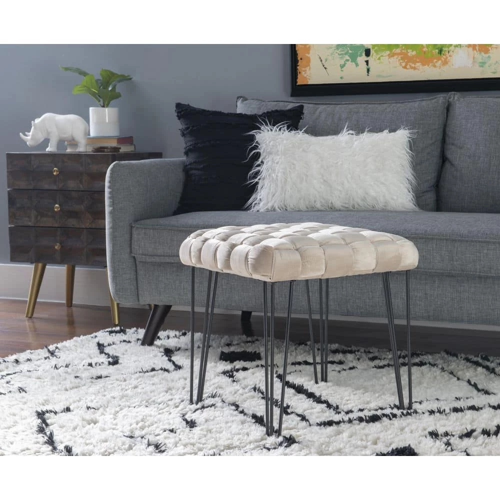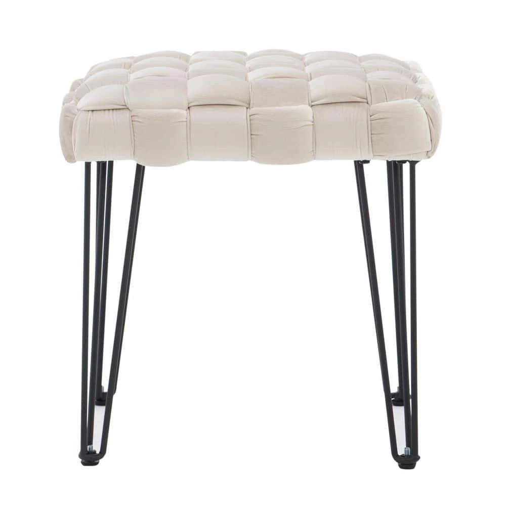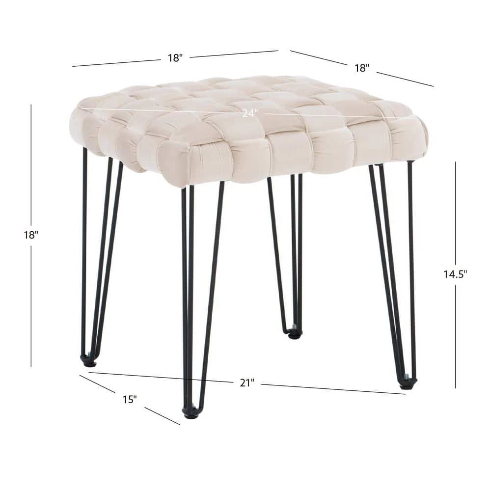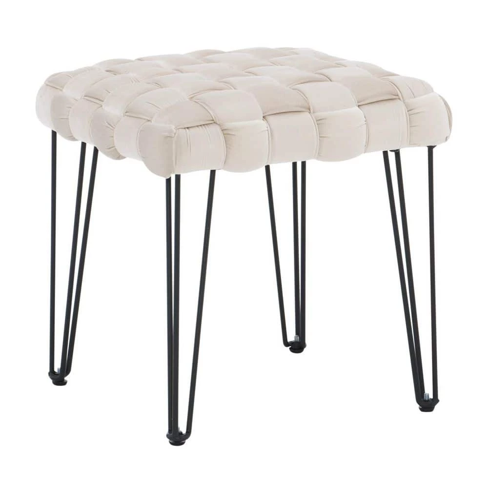 Kick your feet up no matter the seat or the setting with this versatile Grace Cream Basket weave Square Ottoman Stool. Perfect next to your couch as a footstool, as extra seating in a bedroom, office or den, or in front of a mirror as a vanity stool, the choice is yours. A handwoven velvet basket weave top in cream is made of 100% polyester to create a cozy perch over foam padding that pairs effortlessly with a variety of color palettes. Black metal hairpin legs come equipped with adjustable feet so you can adapt to uneven floors and find a steady position. Keep it in a designated place or carry it from room to room, functionality and style are a guarantee.