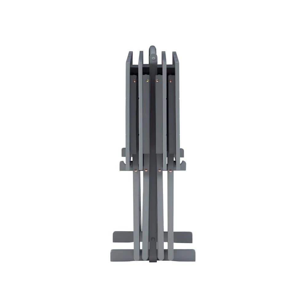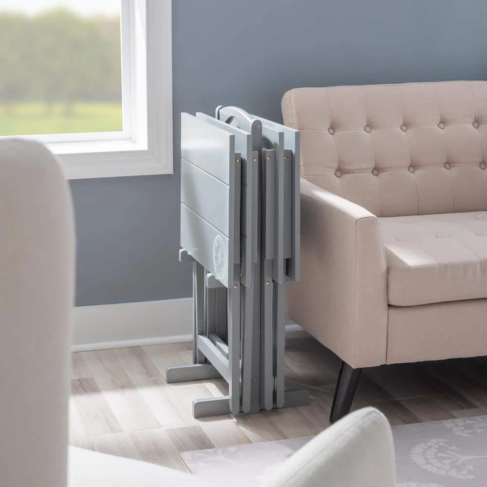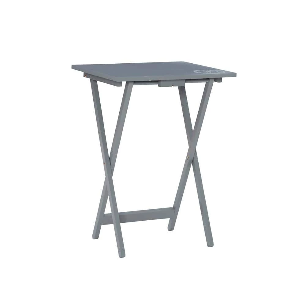 The Gray TV Tray Table Set has a distinctive look with its sturdy wood construction and planked top. The compass designed top adds modern appeal to the set, which includes four foldable TV trays and one storage stand. The handle on the top of the stand makes it easy to transport the entire set from one room to another. A classic home furnishings staple.