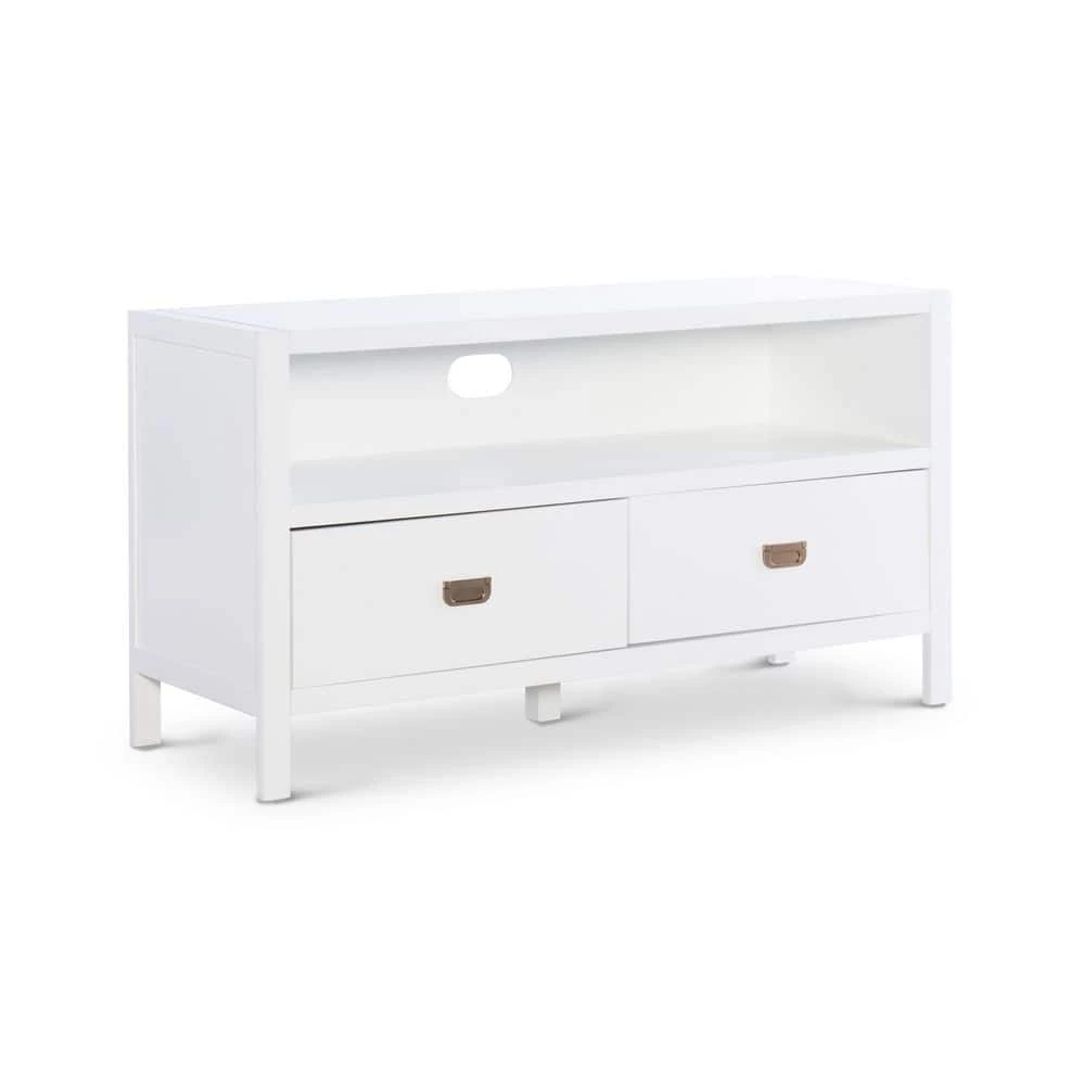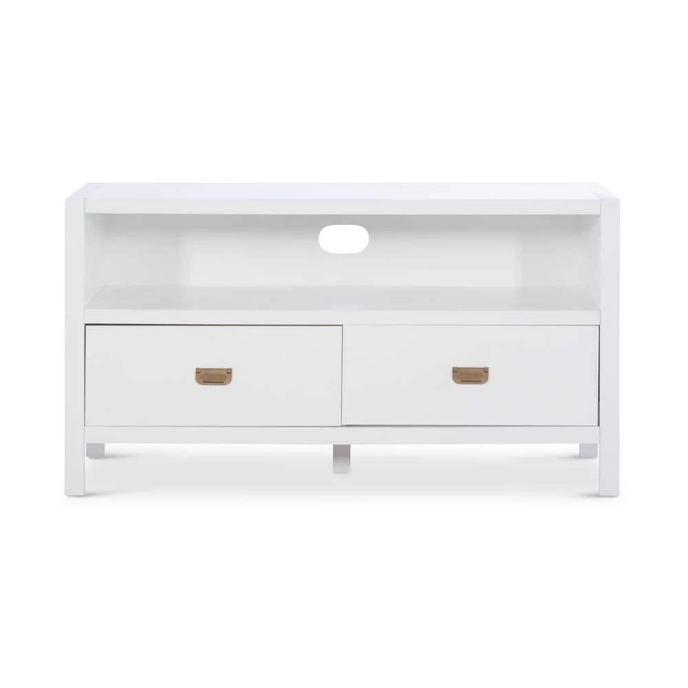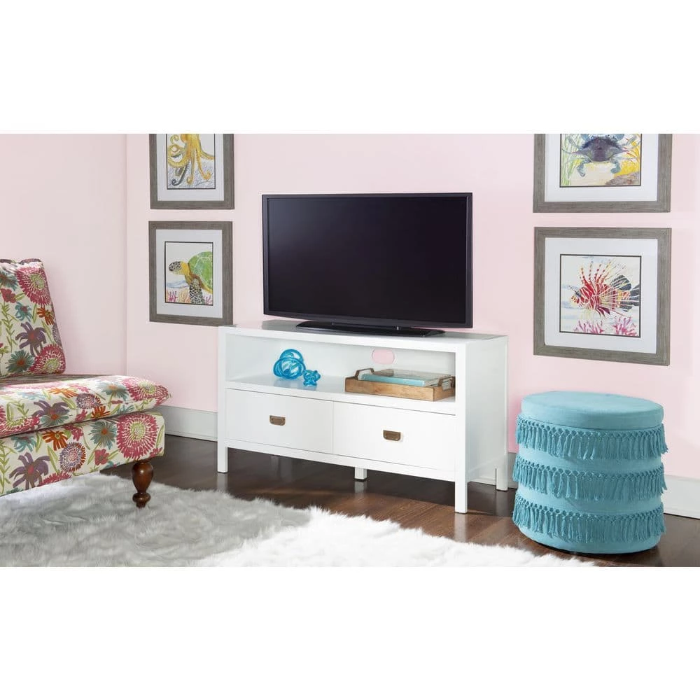 The Greenville Tall Media Center Patricia Media Center is the perfect piece to hold all of your entertainment essentials. The media center features a white finish accented by rose gold drawer pulls. Two drawers provide hidden storage for remotes and games, while the open shelf is ideal for players and game consoles. Wire management holes keep cords organized and out of the way. The spacious top places your large television front and center. Sturdy and durable design.