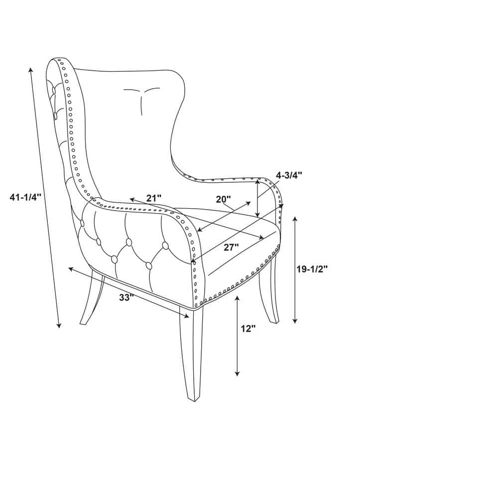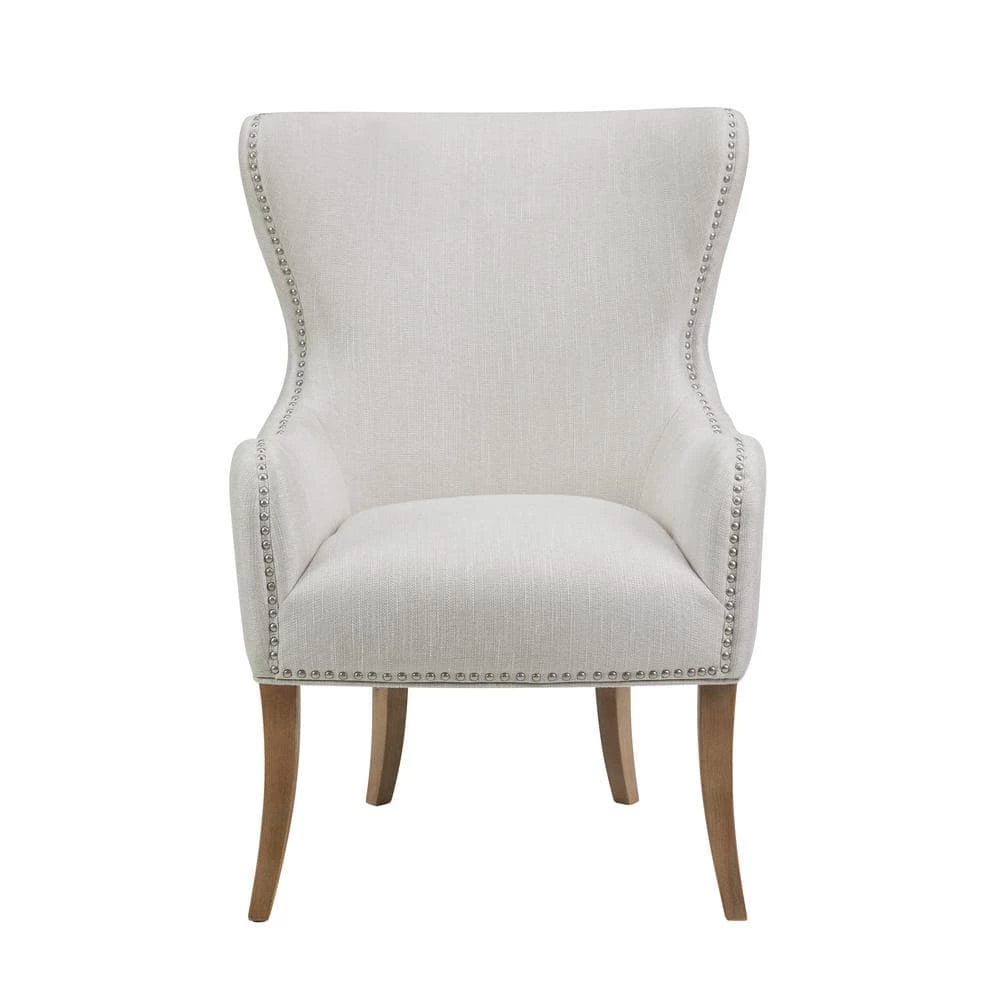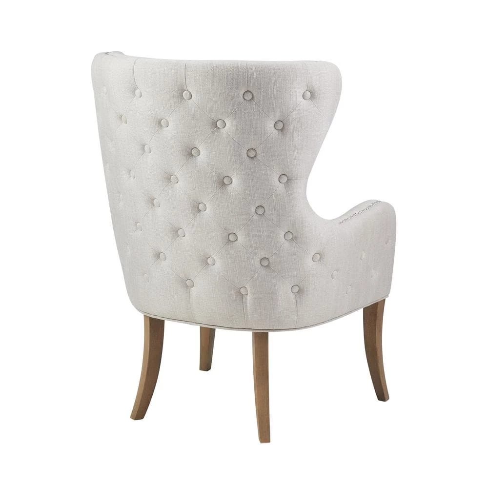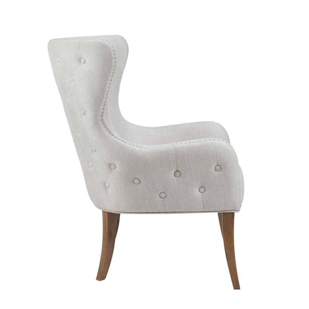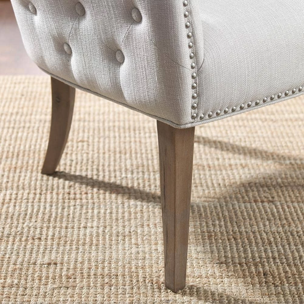 Bring elegant stature your home office, bedroom or living room with this impressive Harlem Natural Upholstered Round Back Chair. Detailed in brushed silver nail heads, along with a tufted back create an overall pleasing style and presence. The natural toned easy care fabric is expertly upholstered. The high back and rounded armrest provide for supportive and comfortable seating. Solid wood legs are finished in a rustic grey.