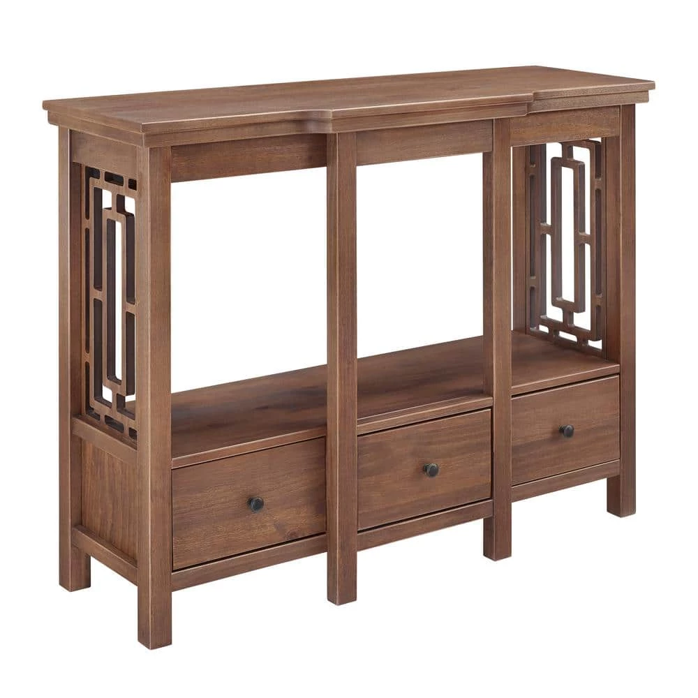 Perfect for your living room, the Hardy TV Stand is both stylish and functional. A spacious top and bottom shelf provides ample space for storing and displaying items, while three drawers keeps small items organized. Geometric sides and a rustic brown finish adds depth and texture to the piece. Great for using throughout your home.