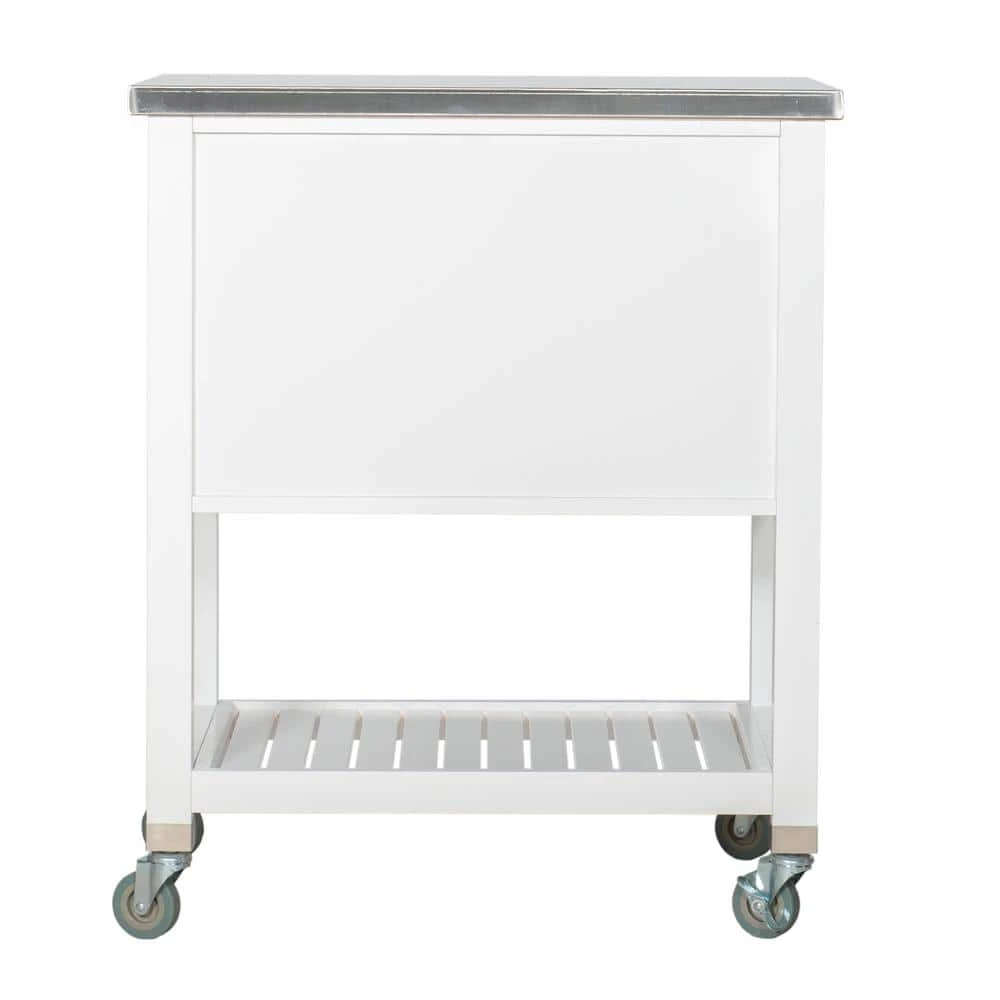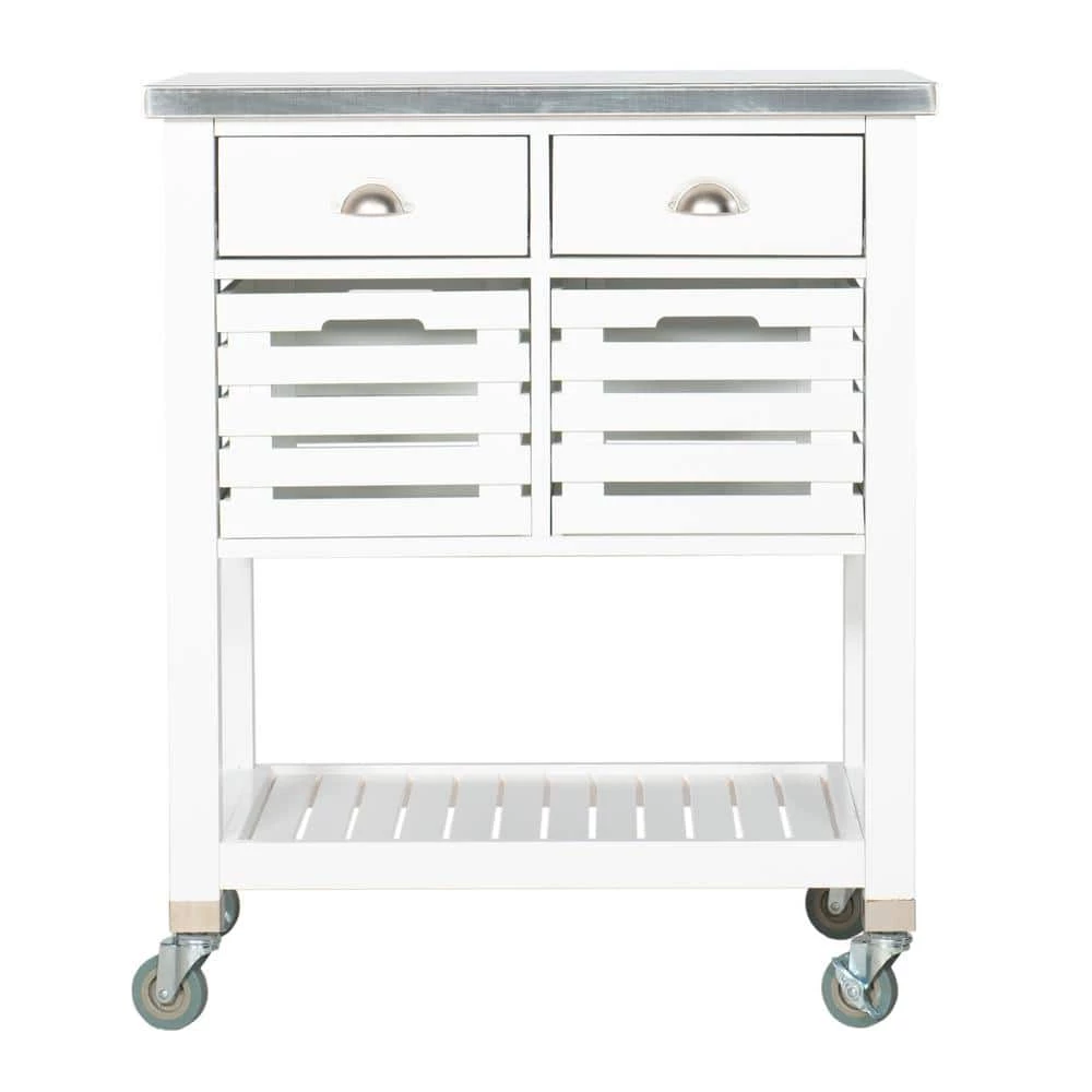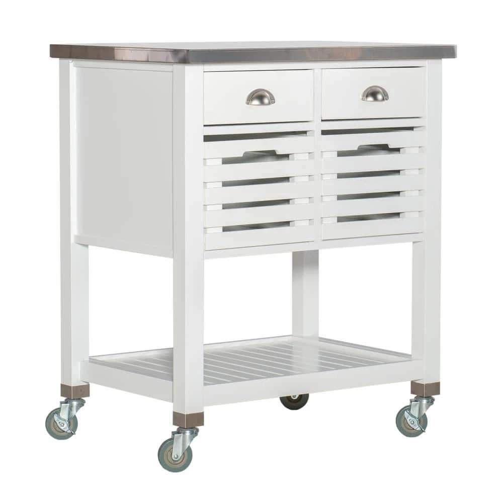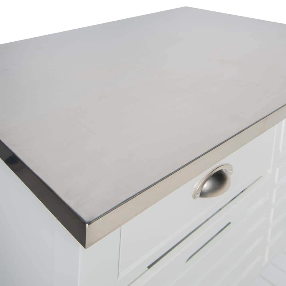Inject an element of farmhouse charm into your home with the Hawthorn White Kitchen Cart with Two Drawers, Two Pull-Out Bins, Shelf, and Stainless Steel Top. Pull out all your cooking essentials to whip up your favorite meal using the easy-clean stainless steel tabletop. And when it’s time to tidy up, make use of this kitchen island’s 2 pull out drawers or baskets to provide hidden storage for anything from silverware to tablecloths. A spacious open shelf makes this unit perfect for keeping large pots organized or housing bottles of wine to entertain guests in style. Can accommodate compact microwave ovens.