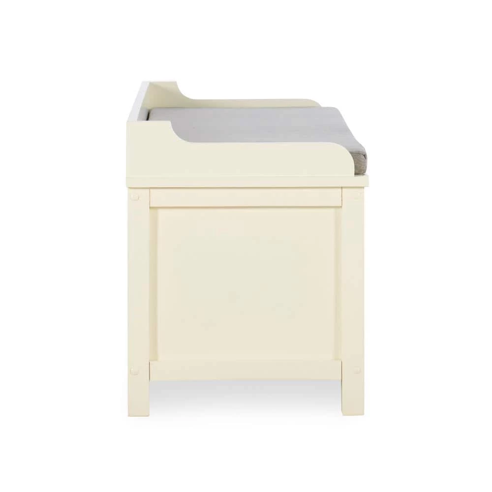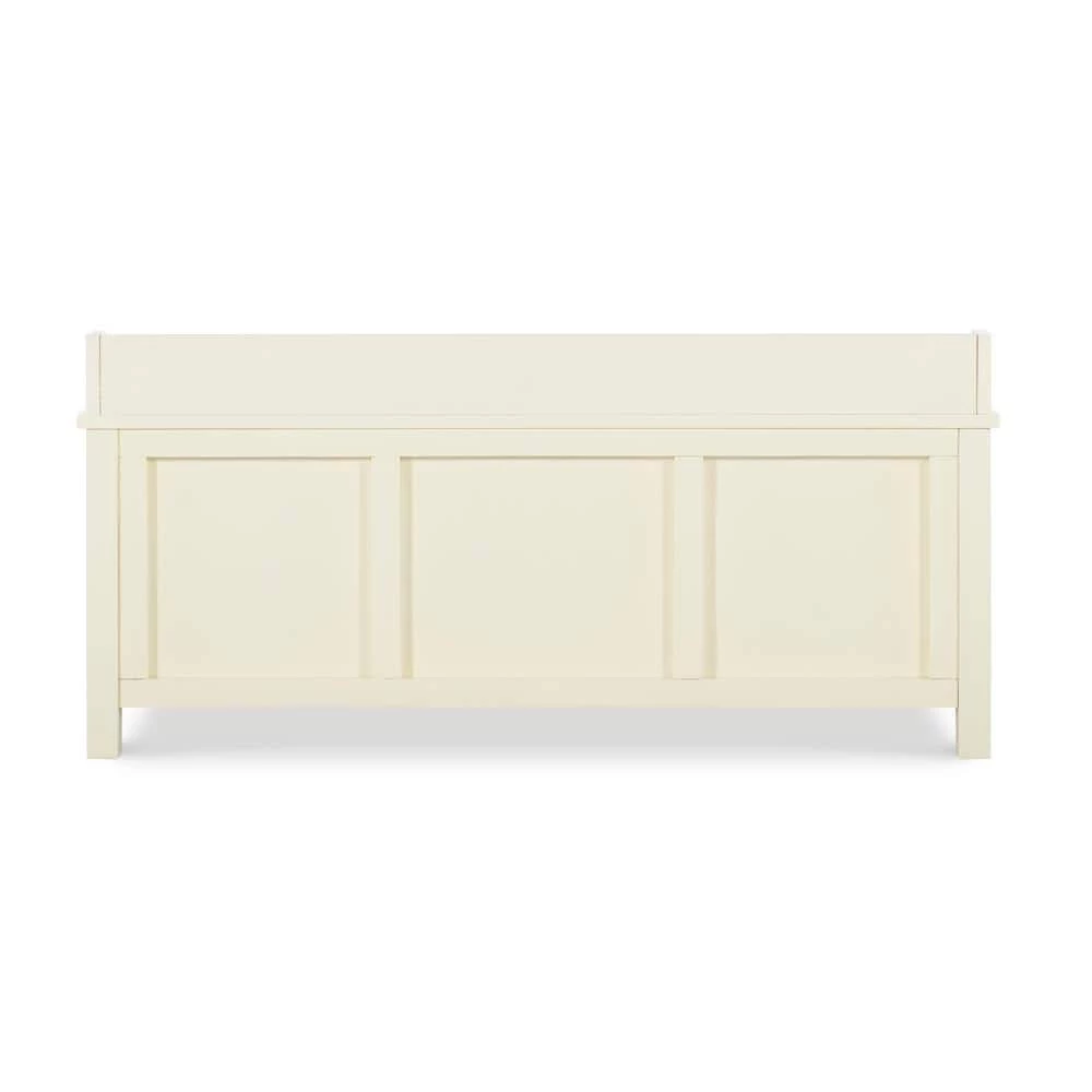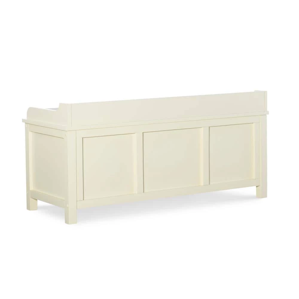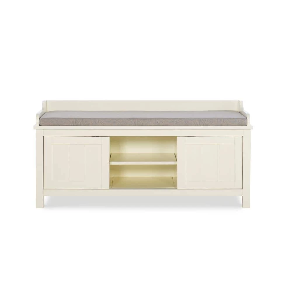 This Hempstead White Storage Bench is perfect for adding storage and seating to an entry or hall. The bench provides ample bottom storage space for shoes, books and toys. Sliding doors keep your items hidden from sight. The white finish is an easy addition to any space. A plush cushion adds comfort to the seat.