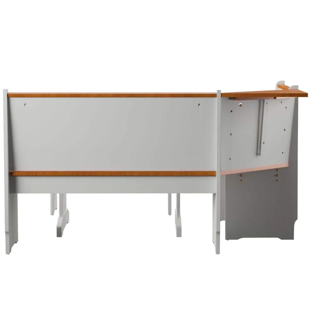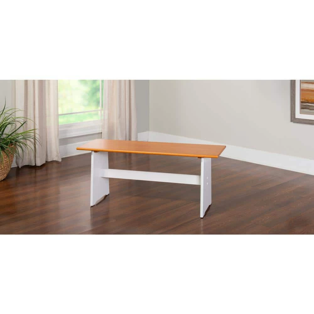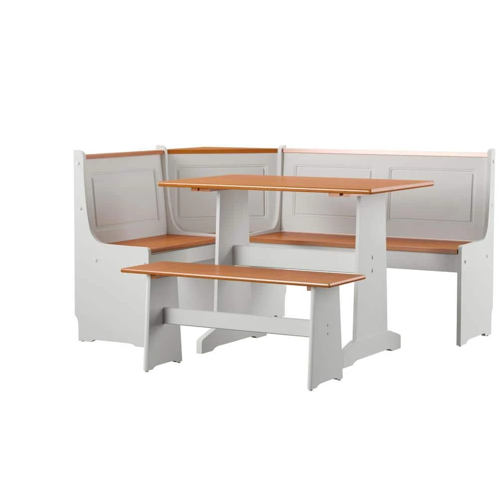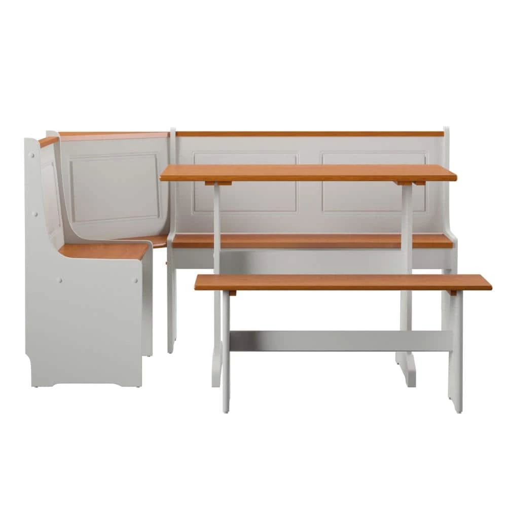 The Jackson 3-Piece Rectangular Wood Top White Corner Nook with Natural Pine Accents. Nestled in a corner of your kitchen this nook set is the perfect spot for meals or family gatherings. The contrasting finishes on this corner nook give it a traditional farm house appeal. The set includes five pieces; side bench, table and long and short benches with a wedge.