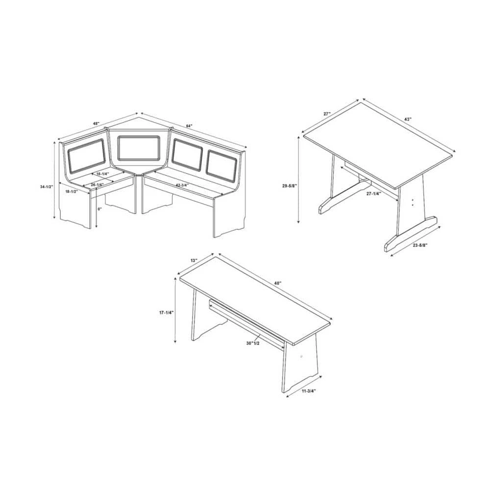 - Dimensions: corner unit 34.5 in. H x 48 in. W x 64 in. L , table 29.5 in. H x 27 in. W x 43 in. L , bench 17 in. H x 13 in. W x 40 in. L