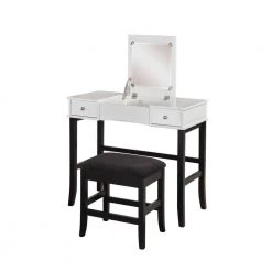 Some mornings begin with applying makeup, others with sending out last minute emails. No matter where the day takes you, this Jackson Black and White Vanity Set with Stool is a good place to start. Enjoy ample work space in the closed position, or open the mirror and flip down the front panel to reveal extra beauty storage and an alternative placemen for your keyboard. 2-drawers and a hole in the back compartmen for cord management enable out of sight organization. This 2-tone piece brings new possibilities to a bedroom, bathroom or sunroom.