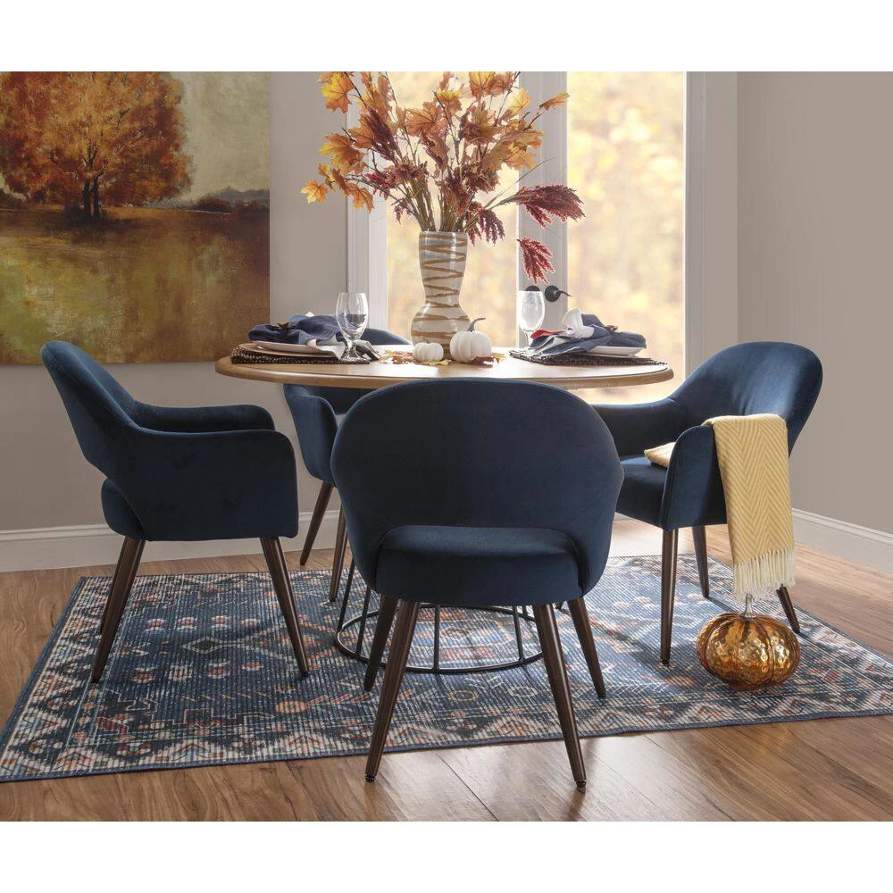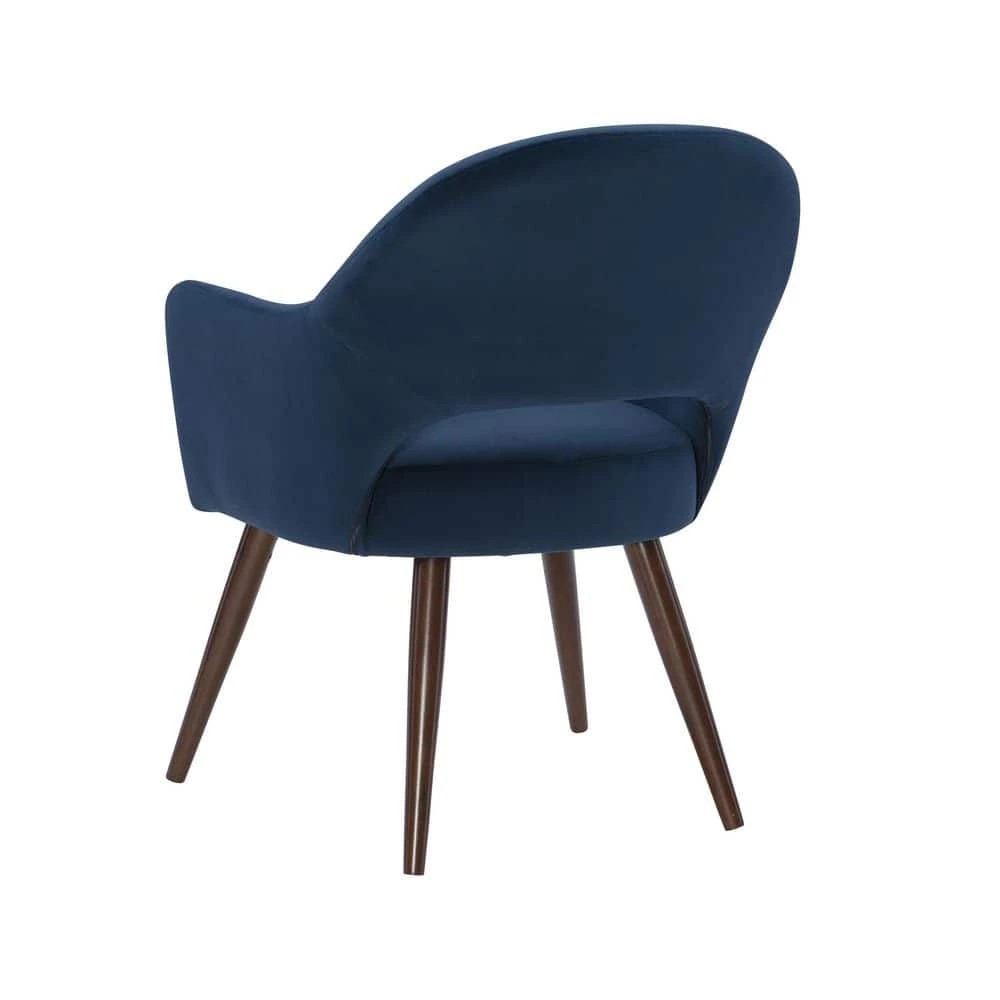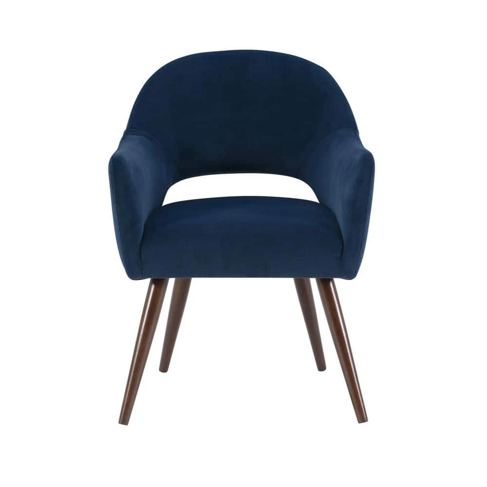 Comfort and streamlined midcentury style come together to form this elegant Jade Blue Ink Velvet Side Chair. The minimal silhouette is both fashionable and supportive, featuring a slightly curved back and subtle contours in the armrests. Generous padding on the sides and plush foam seats are upholstered in navy velvet fabric, made of 100% polyester for resilience and easy cleaning. Splayed rubberwood legs in espresso complete the neutral colorway of this piece and make it an ideal accent in your living room, home office, dining room and beyond.