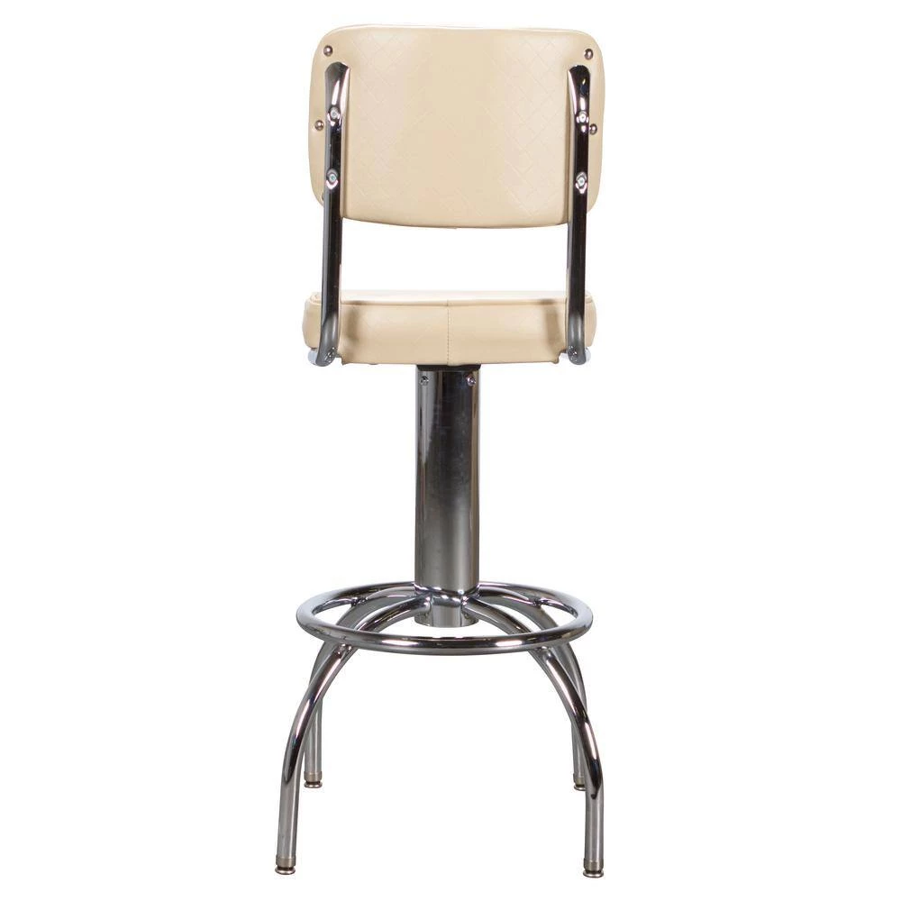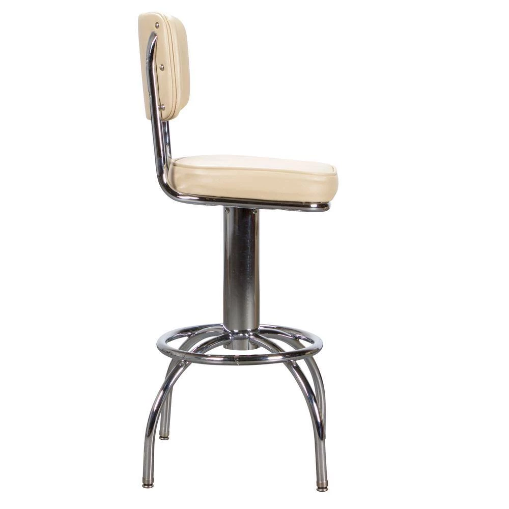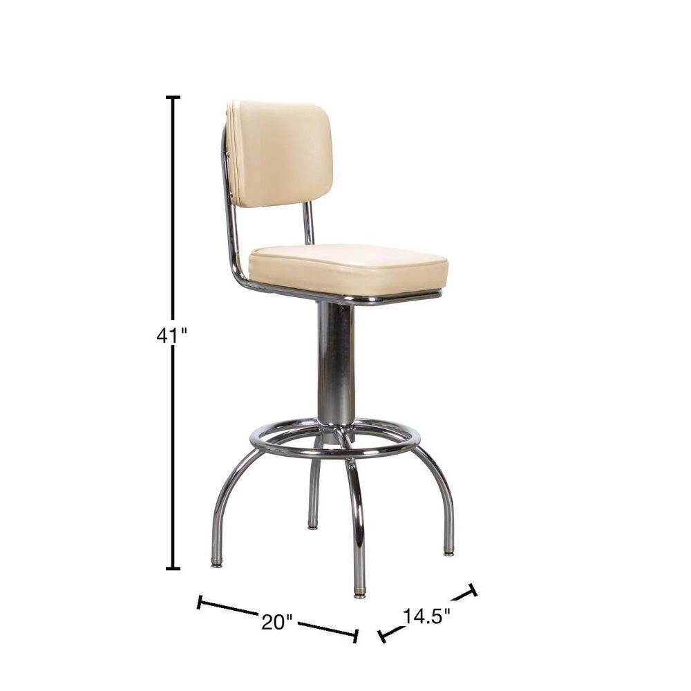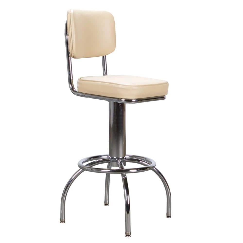 This Jaxon Silver Metal 31 in. Barstool with Beige Faux Leather Seat is a show stopping addition to a wide array of settings, from vintage industrial decor to modern contemporary. Guests can swivel 360 °s on the foam padded seat and back, upholstered with beige faux leather for comfort and easy cleaning. The bottom half of the chrome brushed steel frame branches outward, providing a sturdy base as well as a convenient footrest. Built with durability and strength in mind, this-piece is ideal for commercial seating, as well as home bars and kitchen spaces. It supports up to 300 lbs. and comes equipped with plastic glides for floor protection.