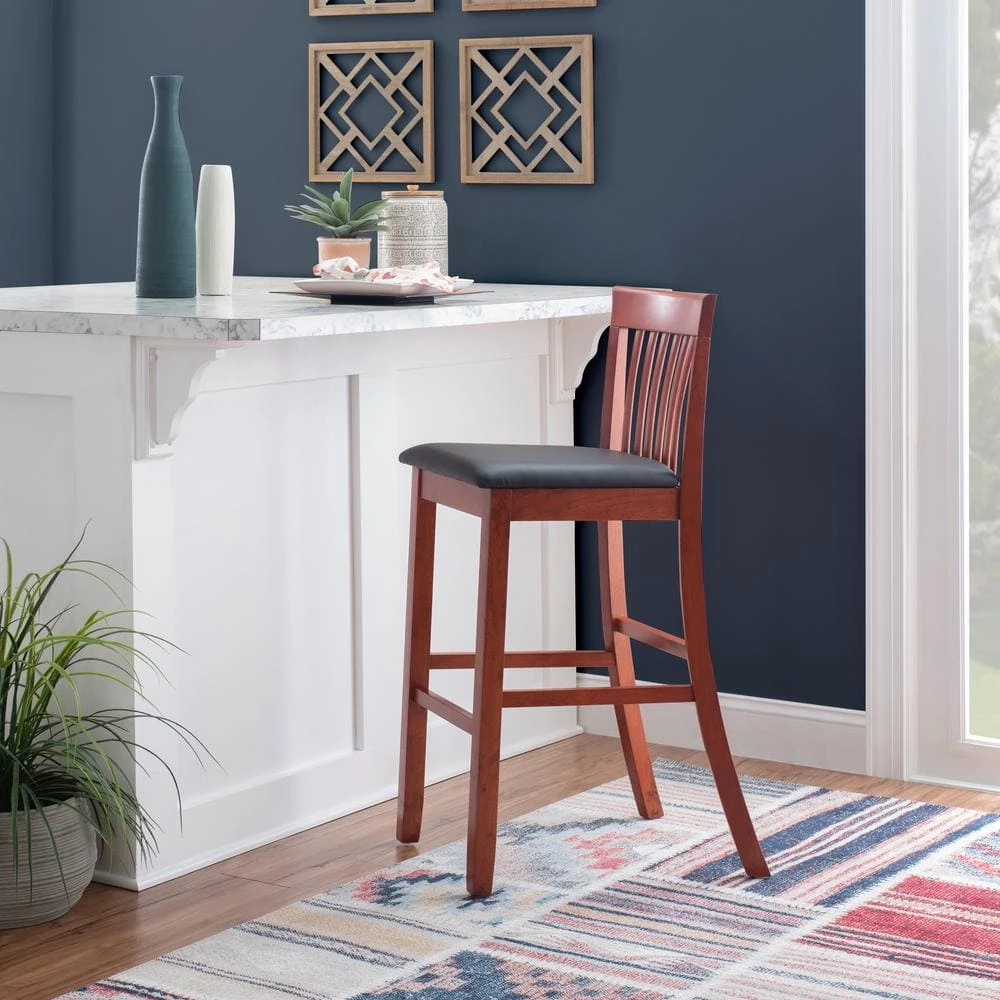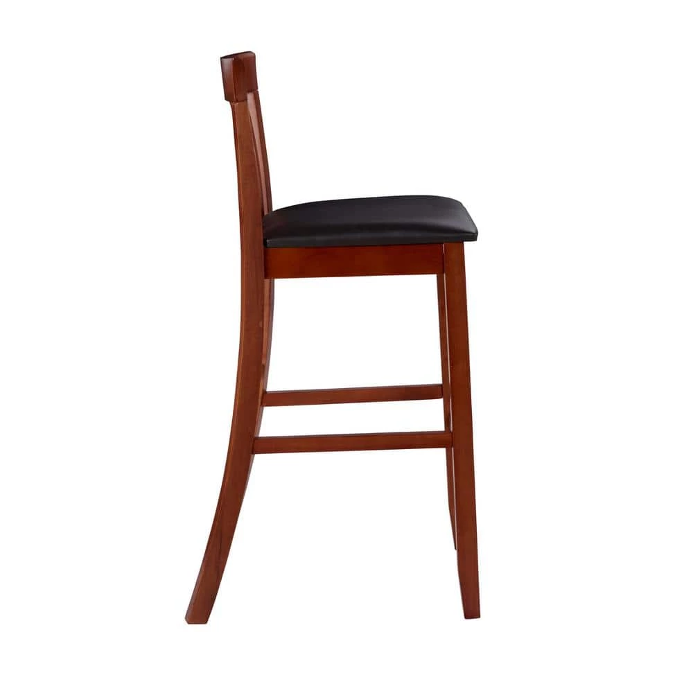 With a traditional Mission back styling, this Jonas Craftsman Barstool will enhance your dining area with its casual charm. The rich dark cherry finish, dark brown wipe clean vinyl padded seat, and 30-inch high seat give this bar stool a timeless allure. Solid construction and quality craftsmanship have made this bar stool both sturdy and attractive. This bar stool fits beautifully into a casual or formal decor. 275 pound weight limit.