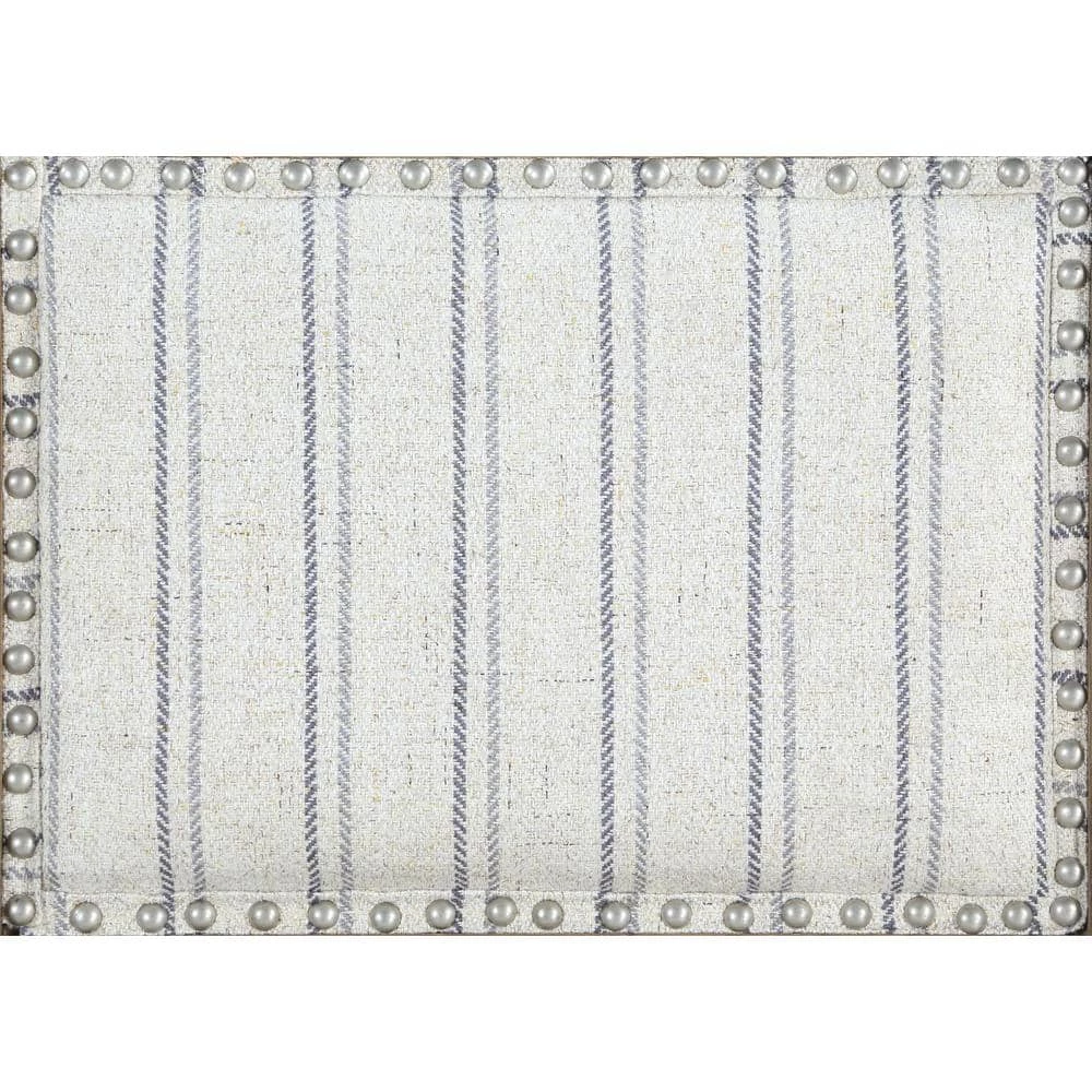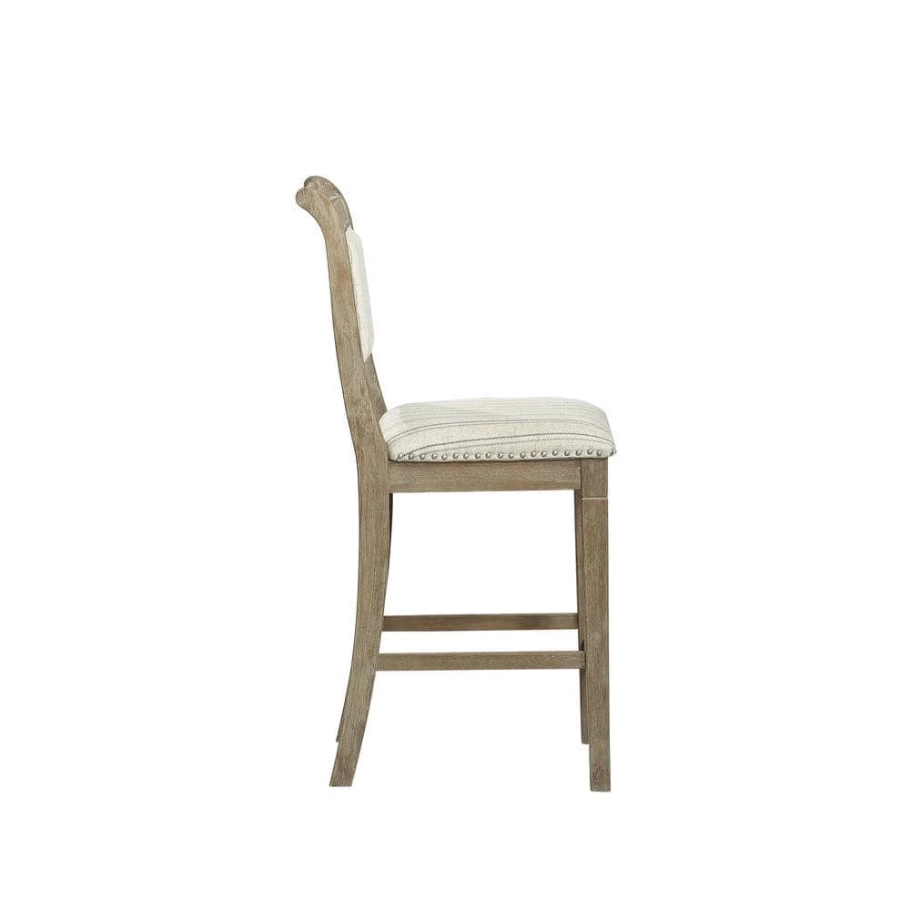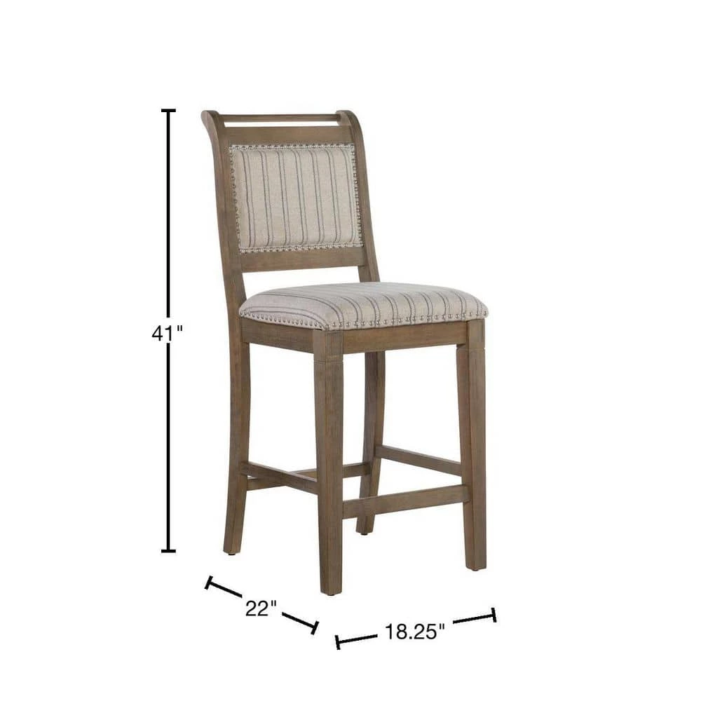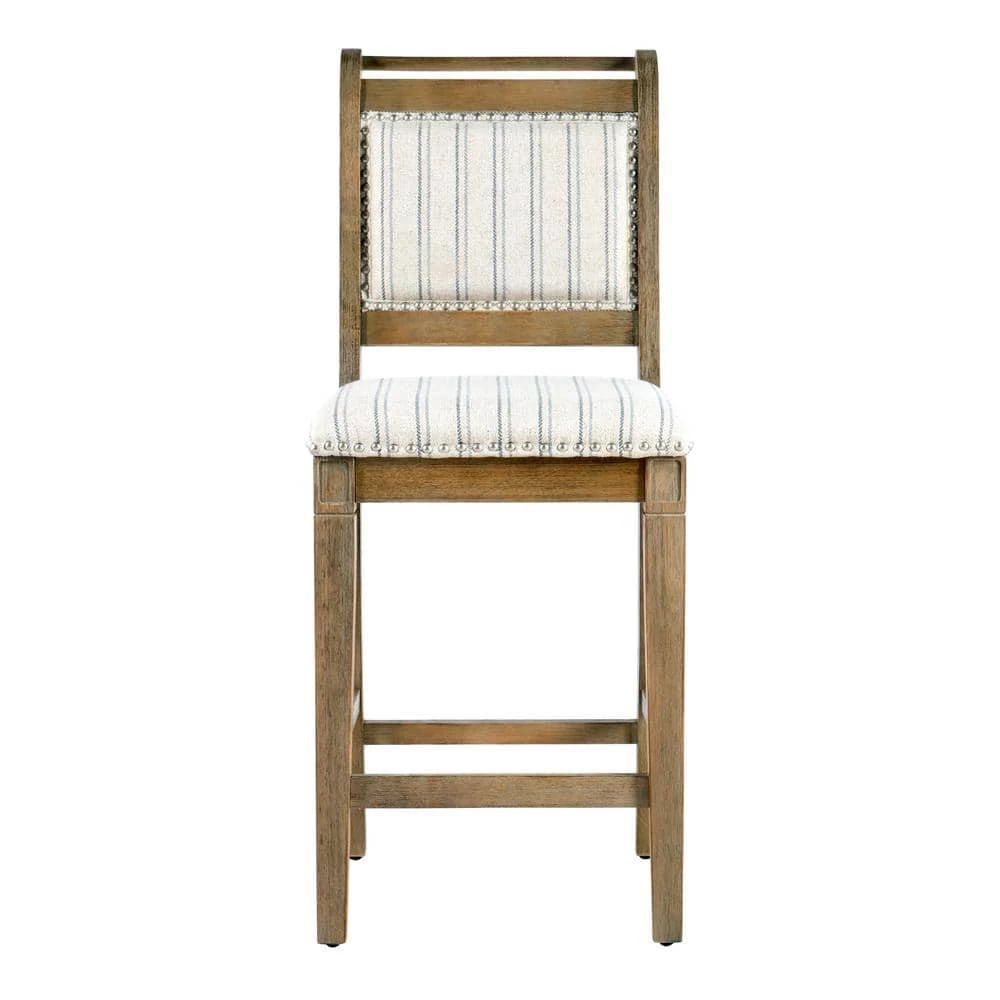French style and farmhouse design combine to create the Kendra Grey Counter Stool. The washed finished wood is perfectly accented by the stripe ticking fabric and brushed silver nail heads. Footrails provide stability and durability. Counter height.