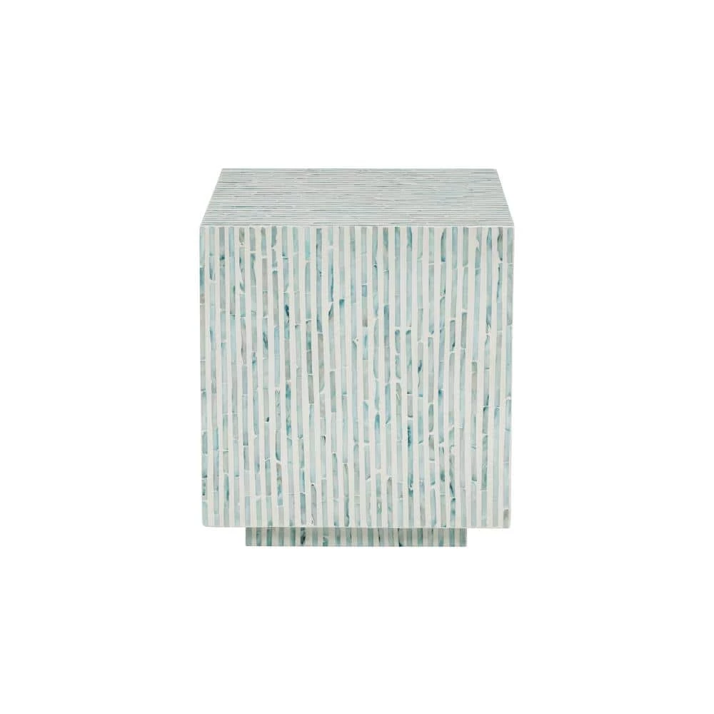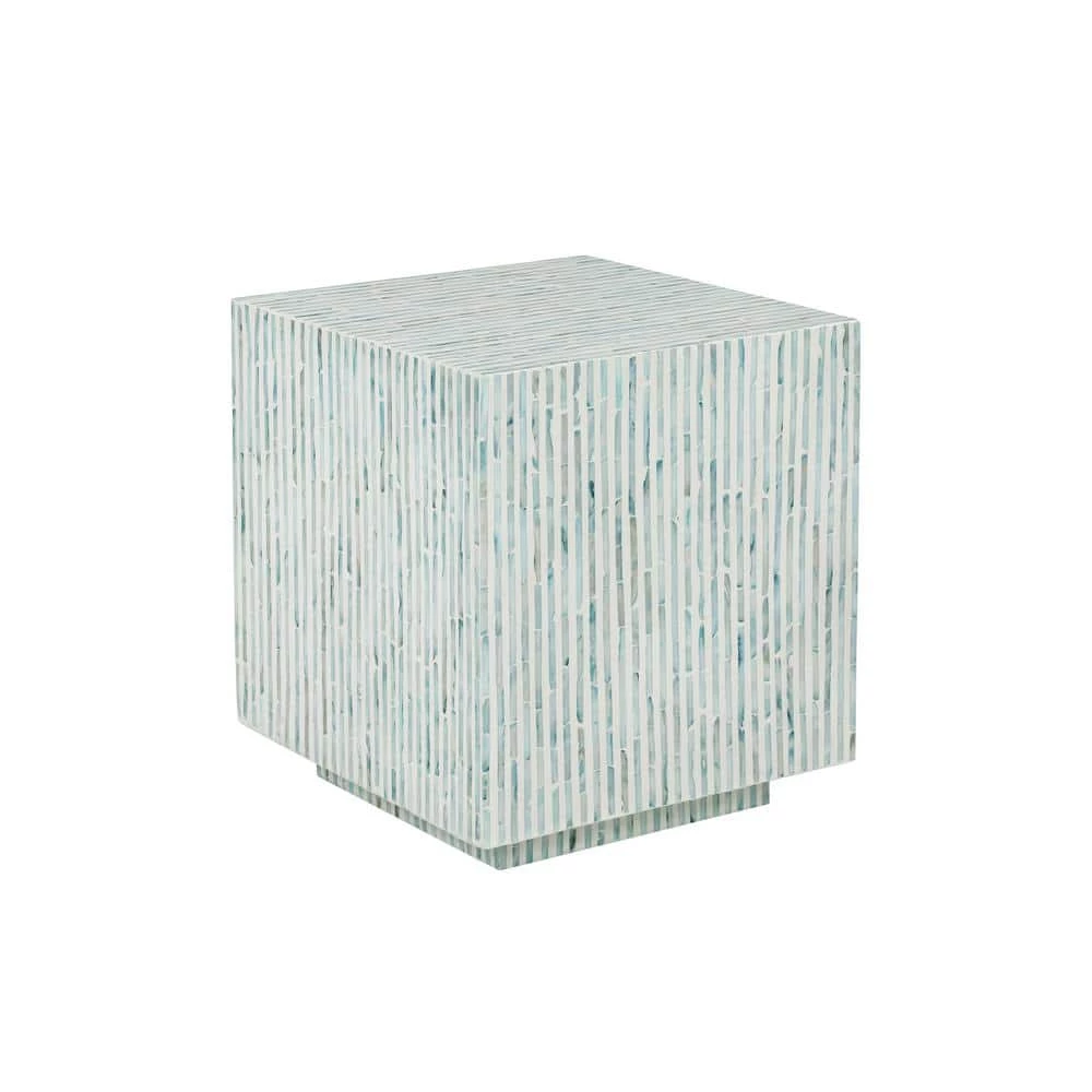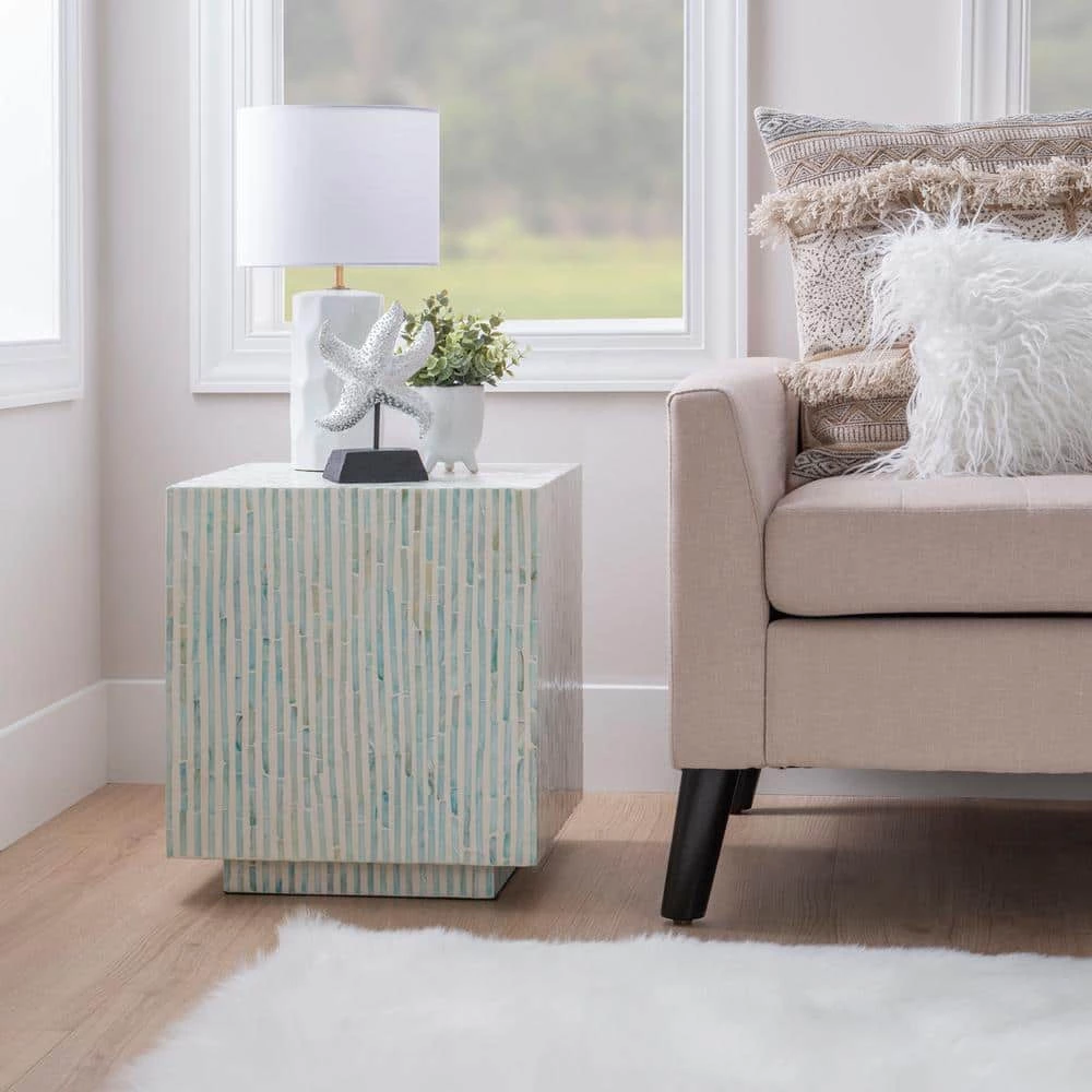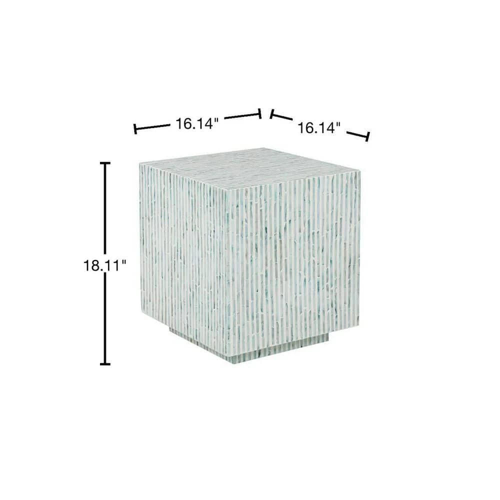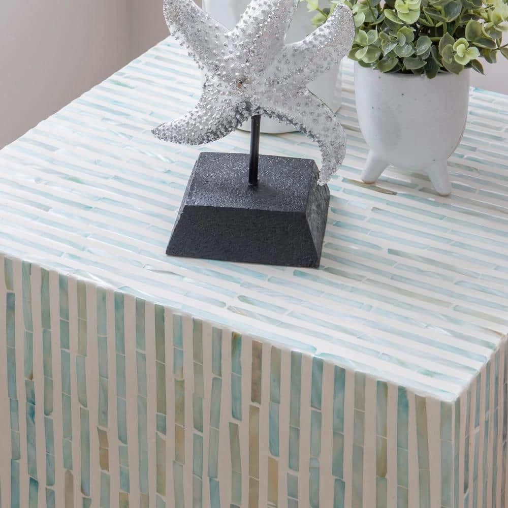 Upgrade your home or office with the sophisticated style of this Kora 16 in. Blue 18″H Square Capiz Shell End Table. Featuring a modern geometric mosaic expertly crafted from blue and gray colored mother of pearl on a white background, this chic accent piece is perfect for your living room, great room, family room, or outdoor patio. The unique geometric design blends seamlessly with decor styles including coastal, country, farmhouse, glam and modern. Use as a side or end table to display decorative objects, set a drink, books, vase or small plant.