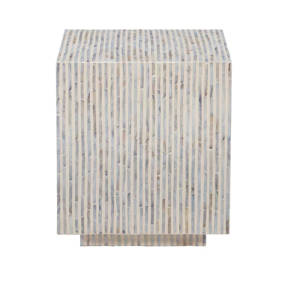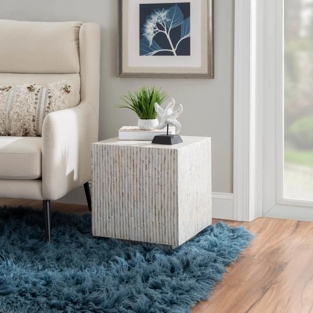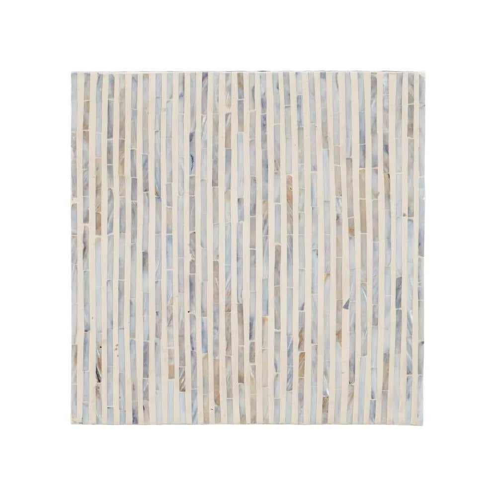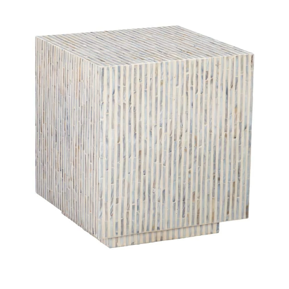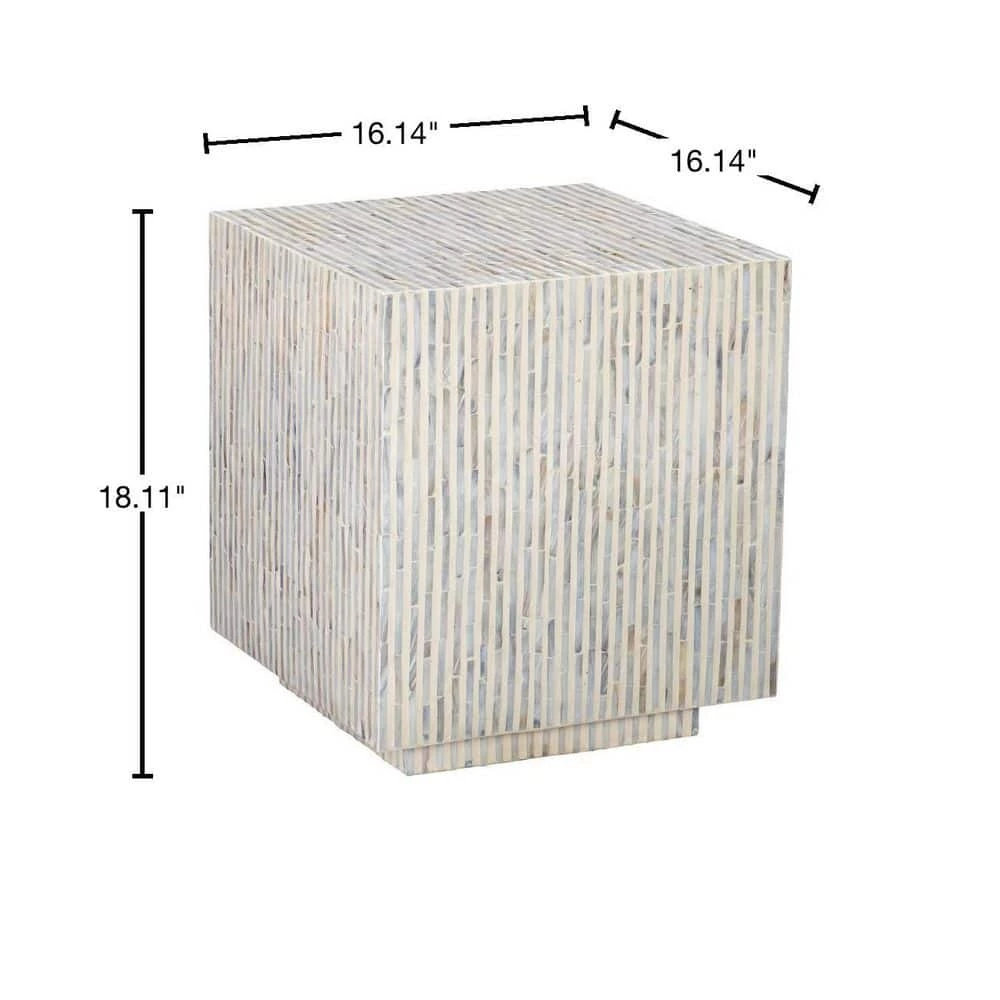 Upgrade your home or office with the sophisticated style of this Kora 16 in. Silver 18 in. H Square Capiz Shell End Table .Featuring a modern geometric mosaic expertly crafted from silver and colored mother of pearl on a cream background, this chic accent piece is perfect for your living room, great room, family room, or outdoor patio. The unique geometric design blends seamlessly with decor styles including coastal, country, farmhouse, glam and modern. Use as a side or end table to display decorative objects, set a drink, books, vase or small plant.