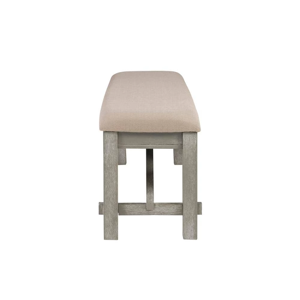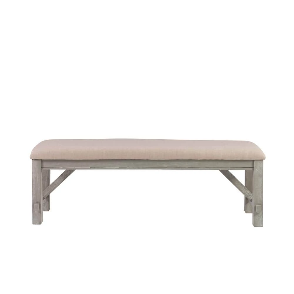 Outfit any room with this Krause Weathered Grey Dining Bench. It features traditional straight lines and a simplistic style. A solid tan fabric in a basketweave construction covers a plush, comfortable seat. It has a durable rubberwood, MDF and Ash veneer construction in a weathered grey finish, which delivers an updated farmhouse vibe. Some assembly required.