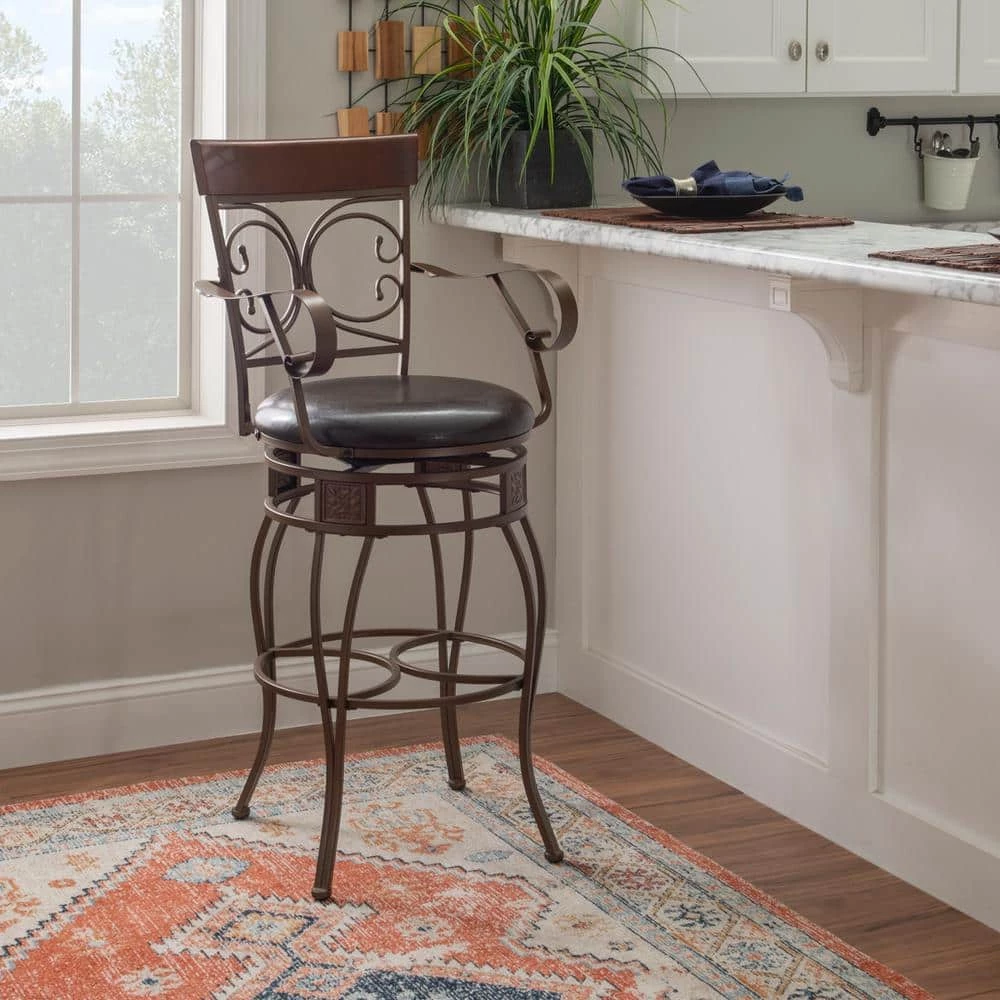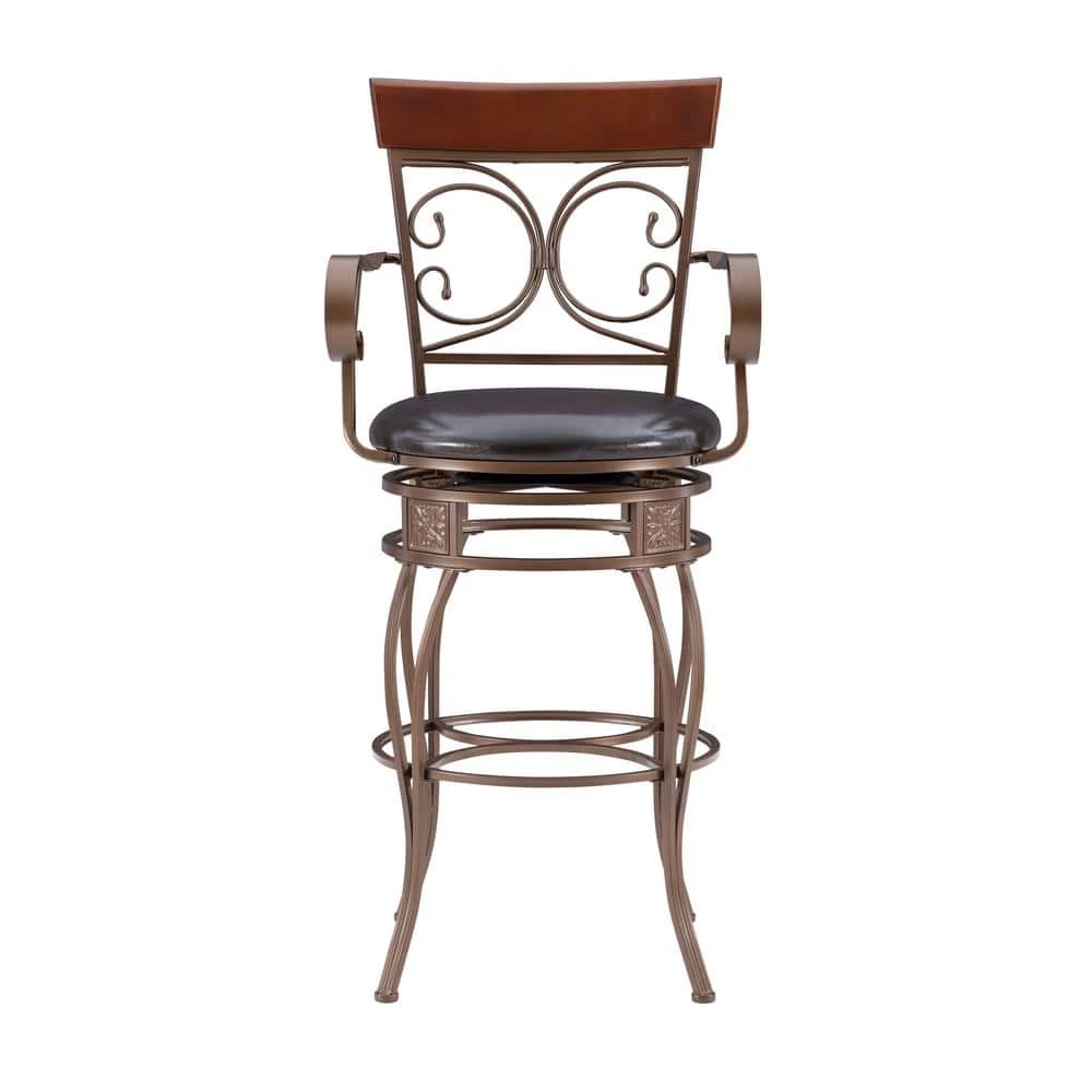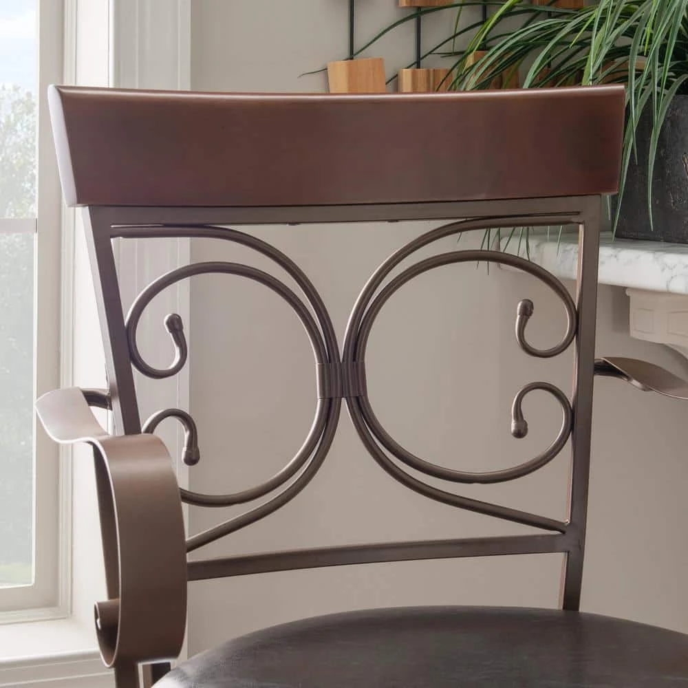 Finally, a stool that’s not only made for the Labelle Dark Bronze Big and Tall Arm Barstool, but is designed with class, style and comfort at the forefront. This oversized barstool is equipped with a large padded seat upholstered in dark brown faux leather that pairs beautifully with the ornate bronze metal frame. It also features armrests, a circular footrest and a rubberwood panel on the backrest for extra support and relaxation. With a seat height of 30 in., this antique inspired piece is a perfect match with bars and tables 41 in. to 43 in. high.